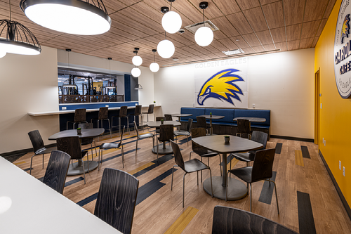 At the front entry, a donor wall is celebrated with vibrant school colors. In the lobby, a concrete tee structure was opened up to provide views of the café and fitness area, and entrances to the new competition gymnasium. The gym is now located in the previous Multipurpose Room, which has the ceiling height to align with National Junior College Athletic Association requirements. Seating was expanded to accommodate 1,100 spectators at athletics competitions and community events. A two-story addition provides a new champion’s lounge overlooking the tournament gym with the LCCC Golden Eagle at center court, and includes office spaces, student-athlete locker rooms, athletic training facilities, and storage. The new fitness area houses free weights, as well as cardio, selectorized and functional training equipment.