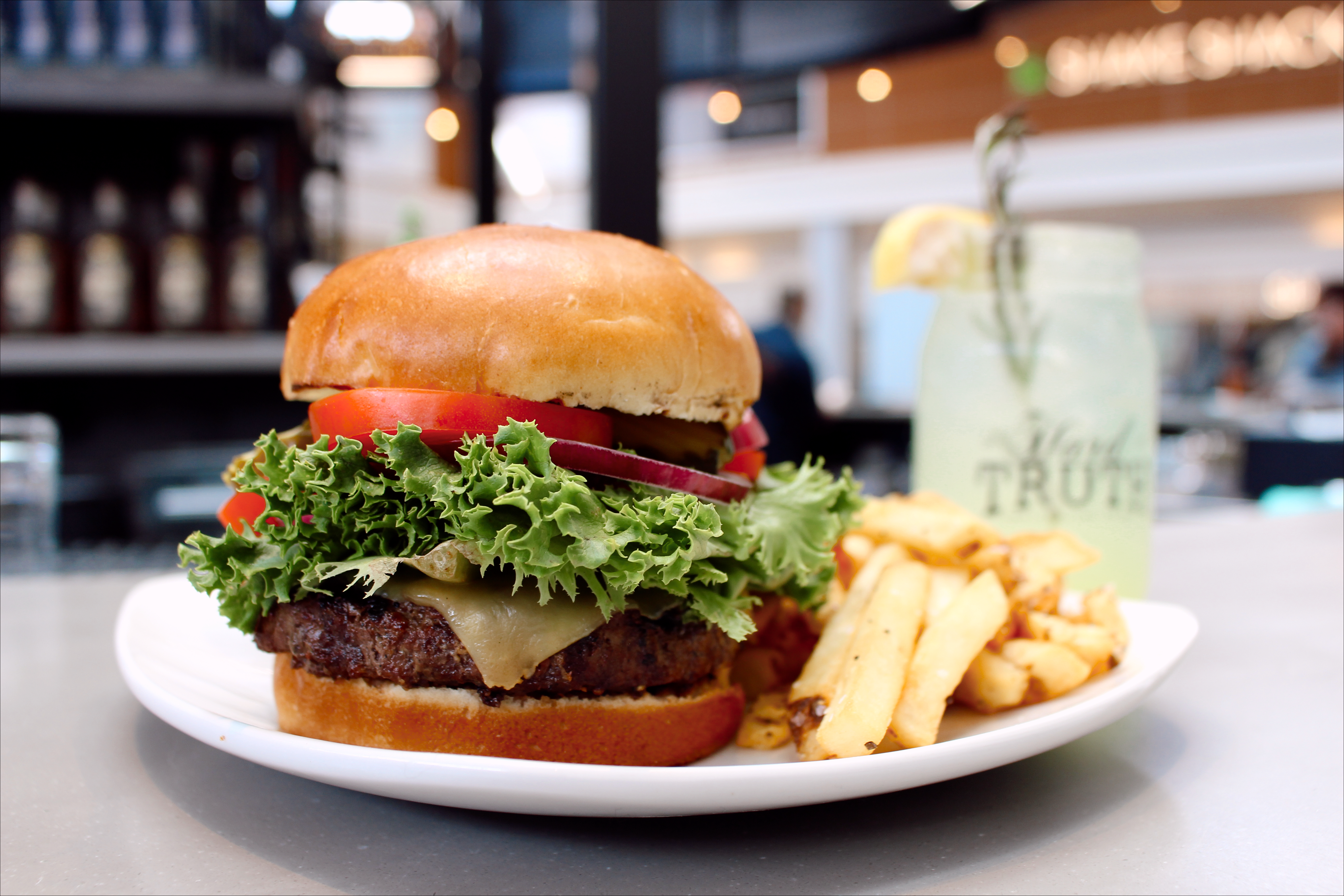 HARD TRUTH WHISKEY BURGER Hand-pressed ground beef patty, white cheddar cheese, butter lettuce, caramelized onion, candied bacon, Hard Truth whiskey glaze, and garlic aioli on a brioche bun. | 17.99