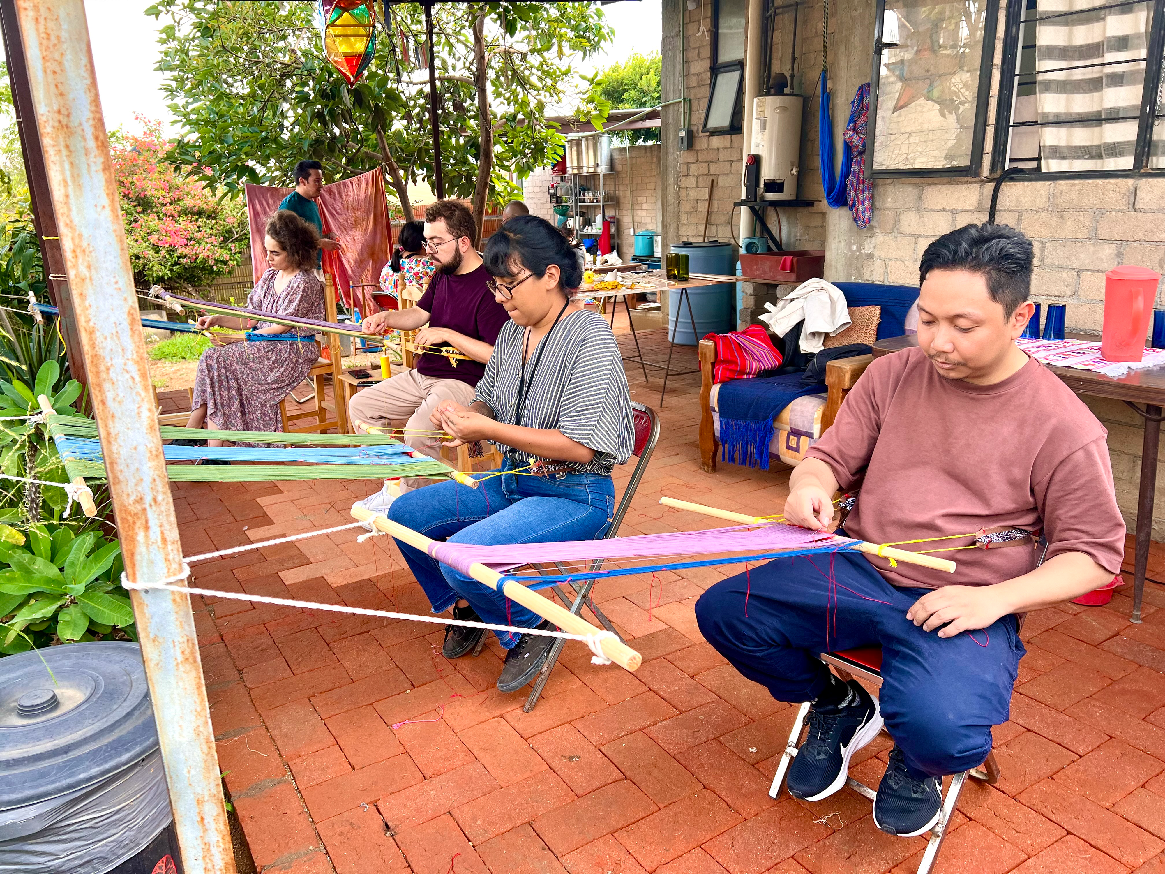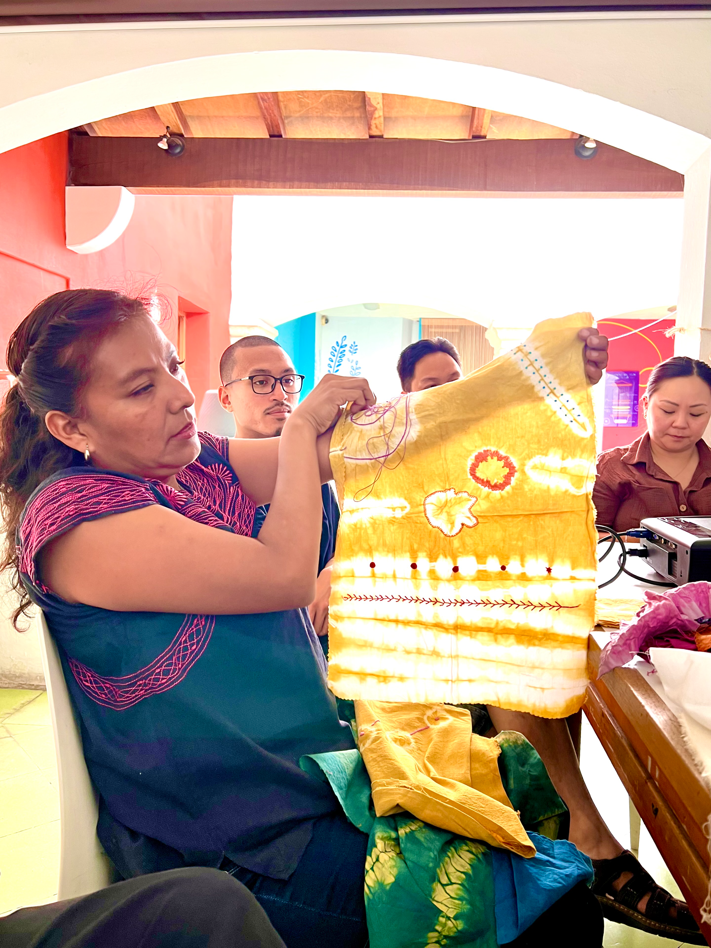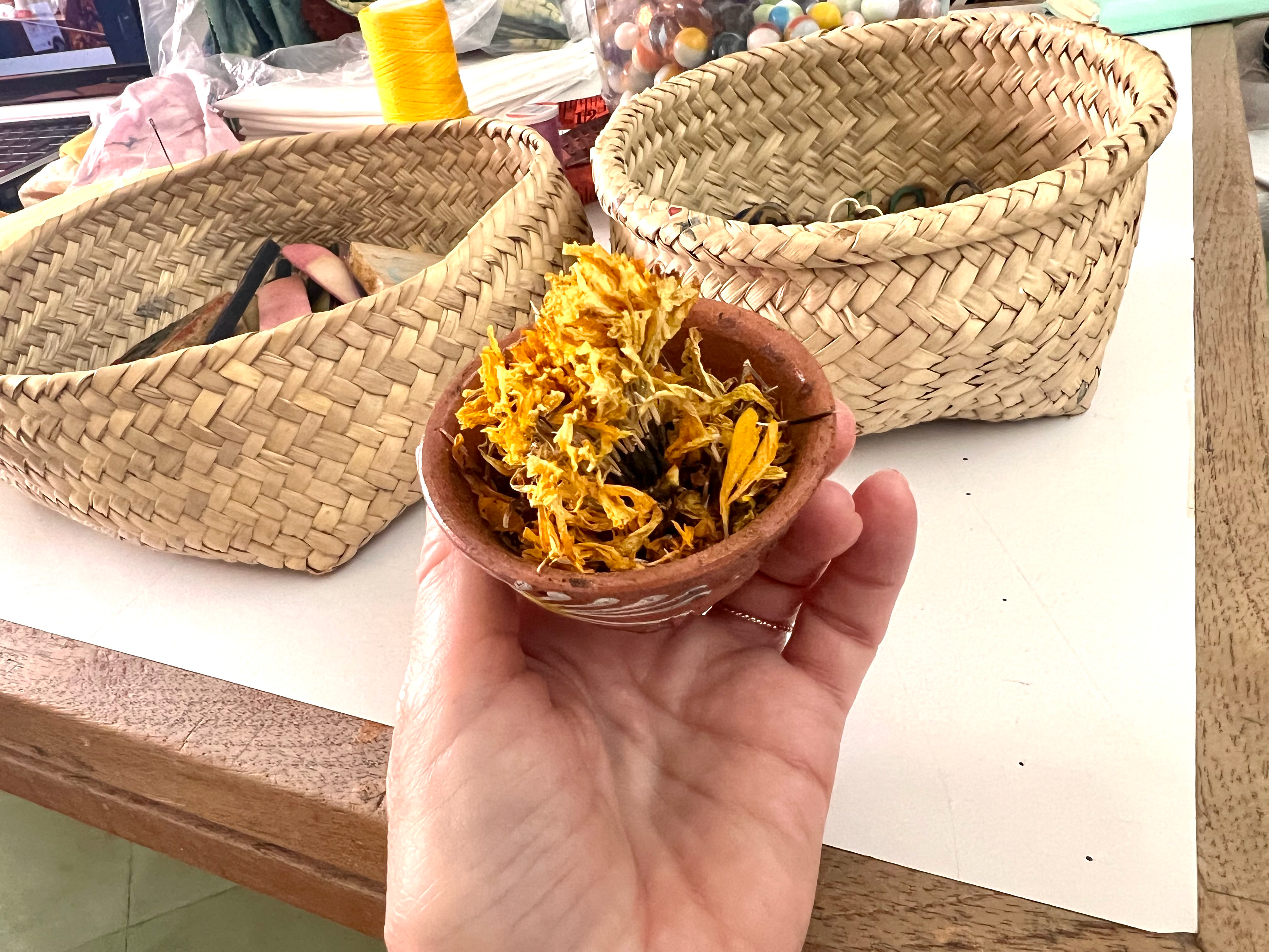 The trip was focussed upon two sets of intensive daily workshops. In the mornings at the Oaxaca Textile Museum the students learned traditional dying and embroidery techniques from Adriana and Boris. We used marigold, cochineal, and indigo to layer dyes, making patterned fabric samples. We learned Indigenous Oaxacan methods of procuring natural dyes, most specifically the painstaking process of harvesting and making powered indigo dye still used to this day. In the afternoons at Studio Nacuanda, Isabel and Omar taught us backstrap weaving. This seemingly simple weaving method has been used historically by Indigenous women to weave textiles for the home, while also supporting their families through the sale of their creations. We found the process extremely difficult. Upon reflection we gained deep reverence toward those that continue this laborious practice, passed down through generations in Oaxaca.
