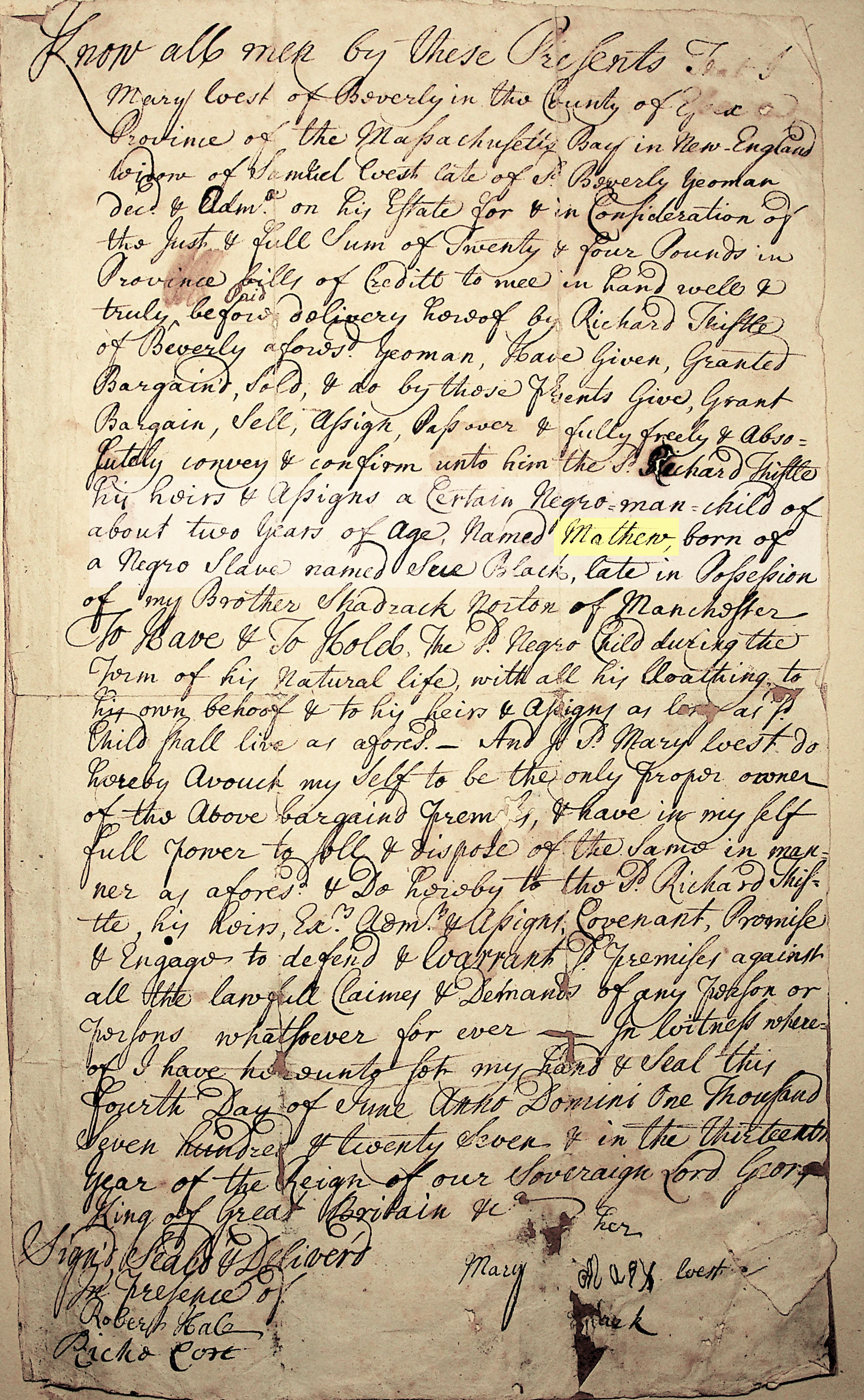 Born in 1725, Jethro Thistle was sold three times in his life. When he was sold to the Thistle family of Beverly at 2 years old, his name was changed from “Matthew” to “Jethro.” Enslaved people were usually given first names taken from the Bible or ancient Rome.