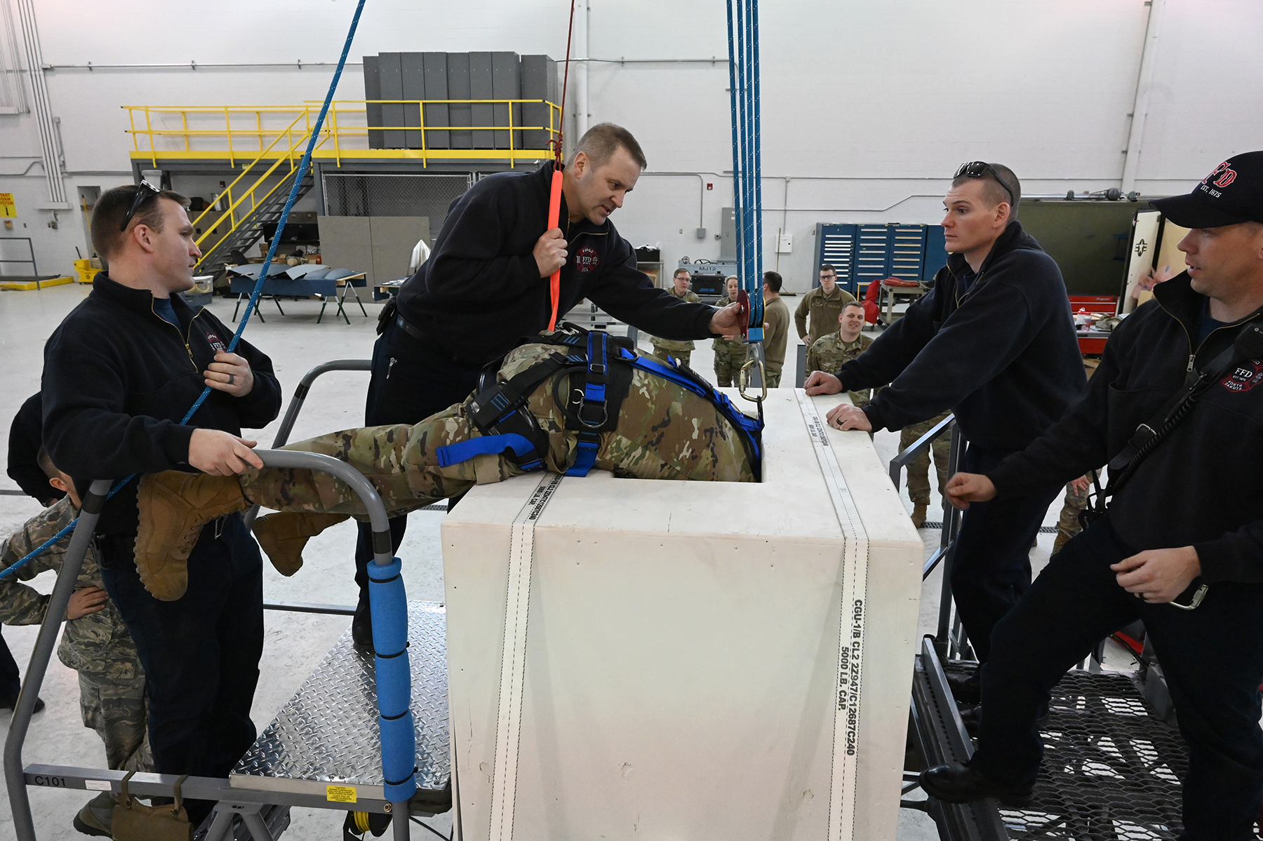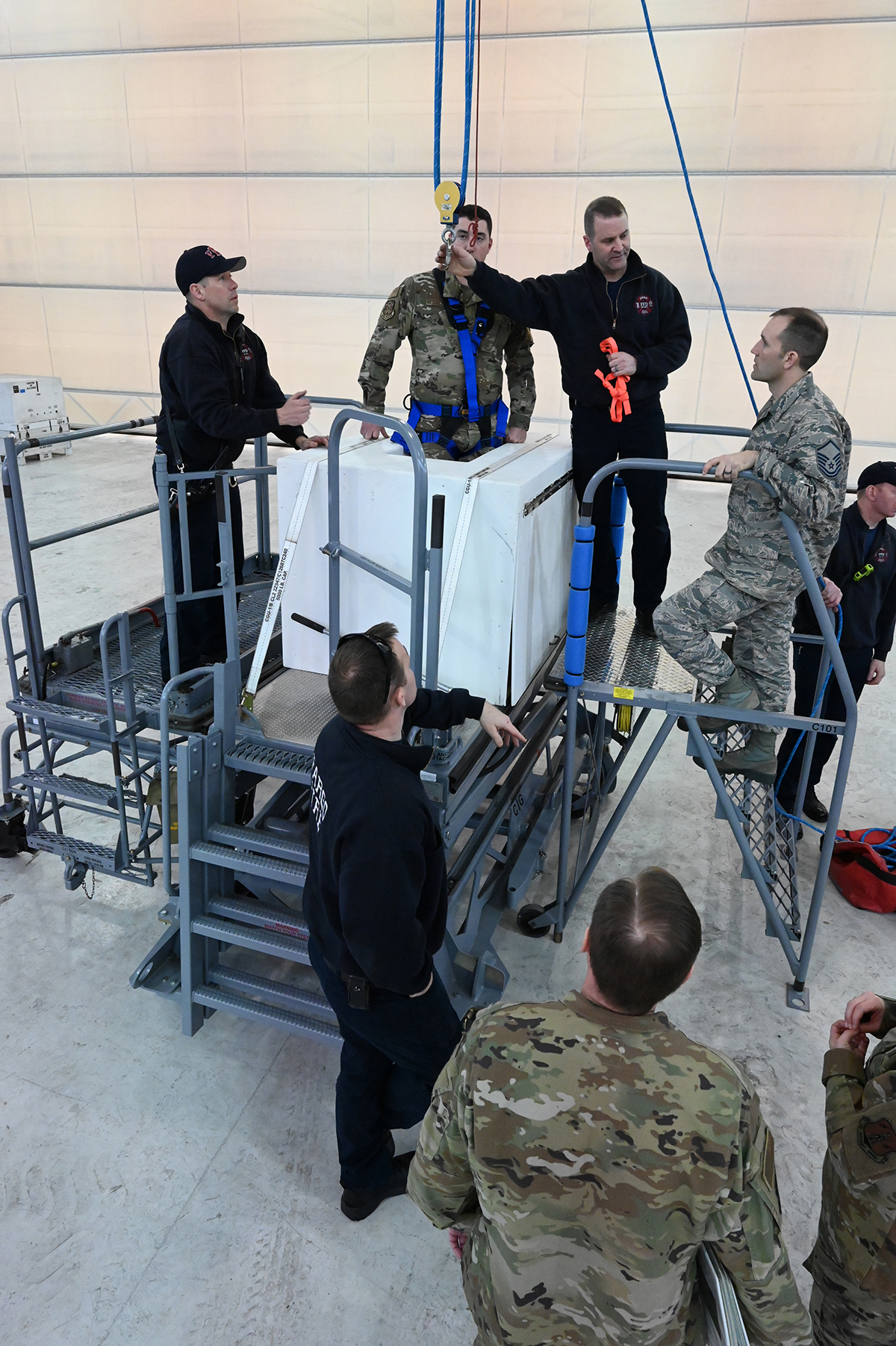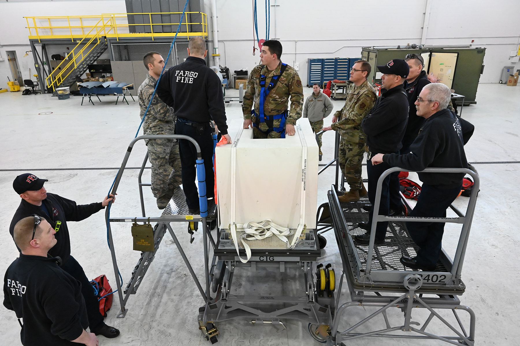 Members of the Fargo Fire Department joined Airmen of the119th Aircraft Maintenance Squadron and 119th Safety Office to conduct MQ-9 Reaper confined space rescue training for the first time at the Air National Guard Base in Fargo on March 4. If an aircraft maintainer became incapacitated inside an MQ-9 aircraft fuel cell, fire fighters could be called to assist in the rescue. This training is an annual requirement for any aircraft that could accidentally incapacitate personnel within. The MQ-9 mock aircraft fuel cell was built to exact specifications by Master Sgt. Scott Hovda and Master Sgt. Darby Plath. A thorough safety risk assessment helped mitigate and reduce hazards of this important training. Top photo. An aircraft maintainer crawls inside a mock fuel cell as part of the training with the Fargo Fire Department.