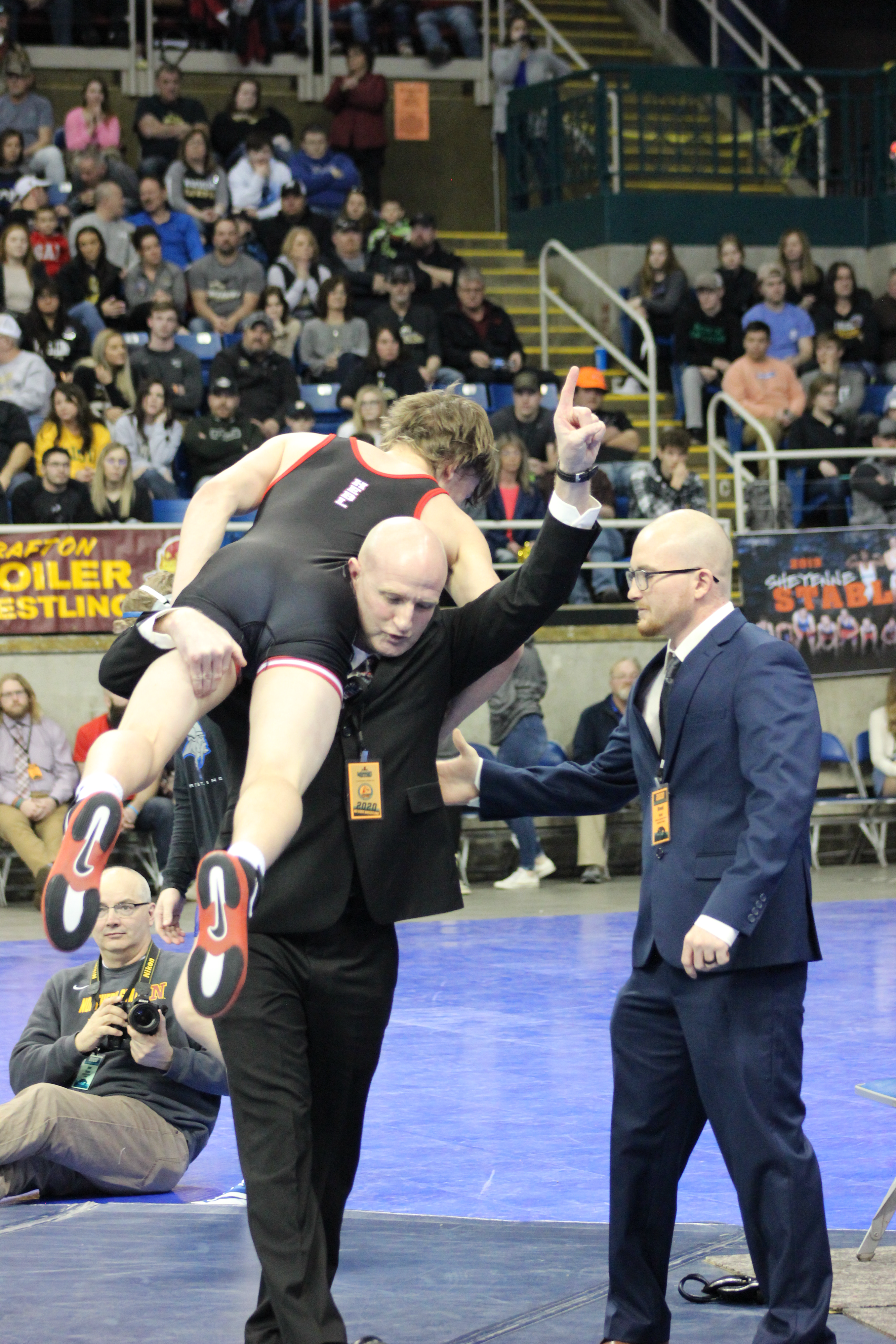 Sgt. 1st Class Matt Hebl lifts his son Garrett to celebrate his win at the Class B state wrestling match on Feb. 22 while assistance coach (other son) Brent Hebl congratulates his brother Garrett.