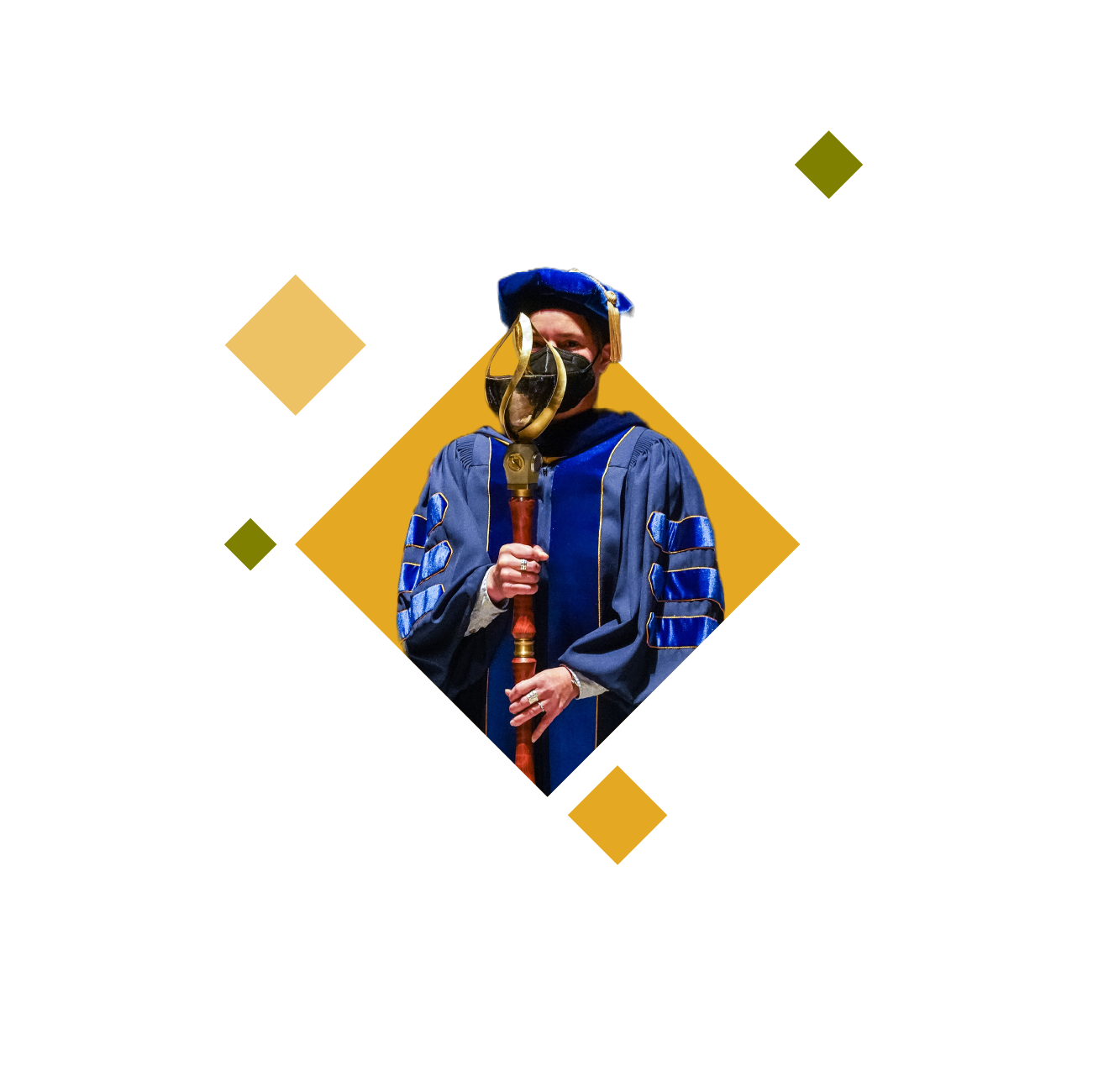 An ornamental staff or scepter, the mace is carried by officials as part of formal parliamentary or academic ceremonies. A gift from the Tower Foundation of SJSU, the university’s ceremonial mace was designed and created by Art and Art History Lecturer Yvonne Escalante, ’13 MFA Spatial Arts (right photo). She found inspiration for the design in both SJSU history and the paths students take to reach graduation.