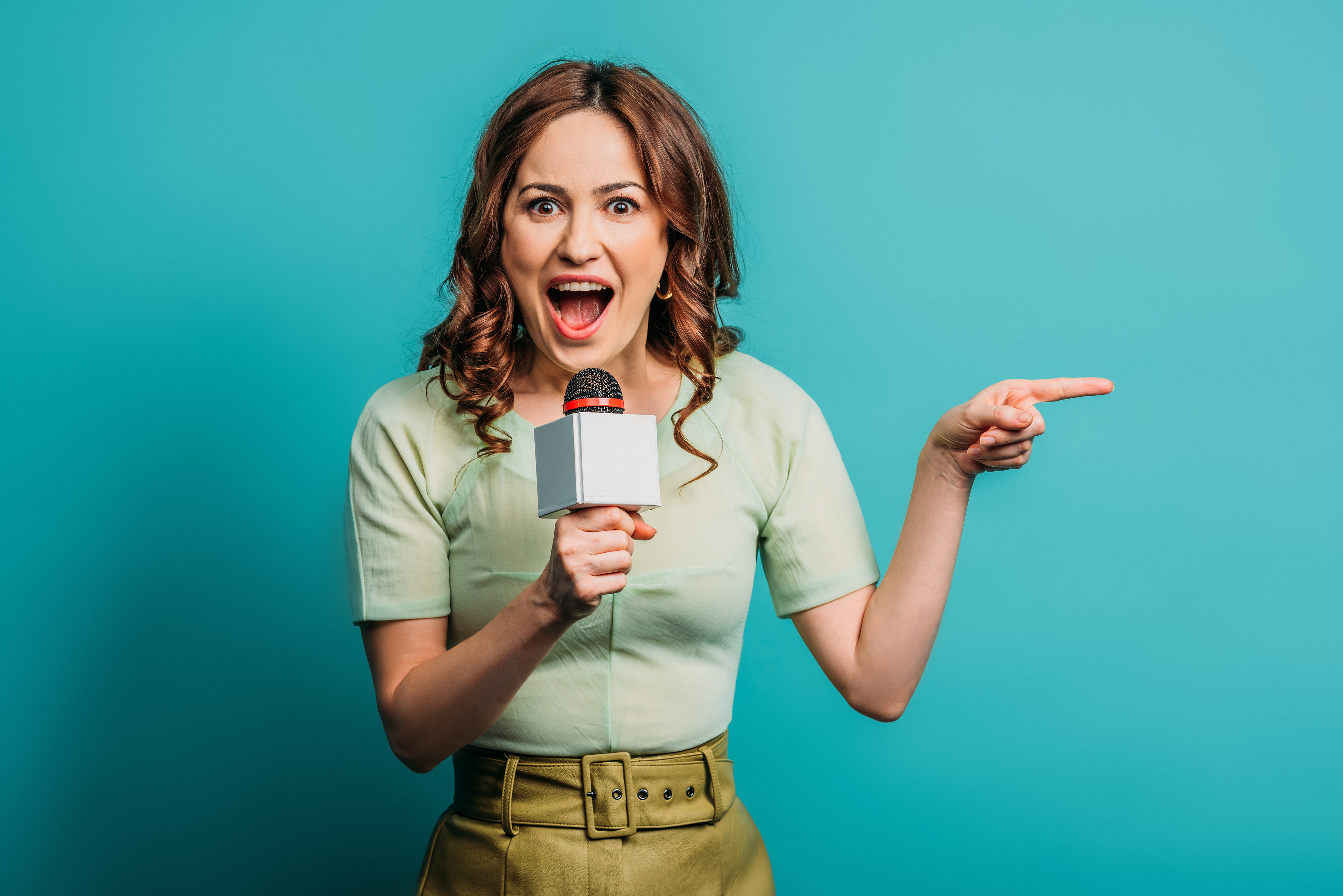 Created with an image by LIGHTFIELD STUDIOS - "excited journalist pointing with finger while holding microphone on blue background"