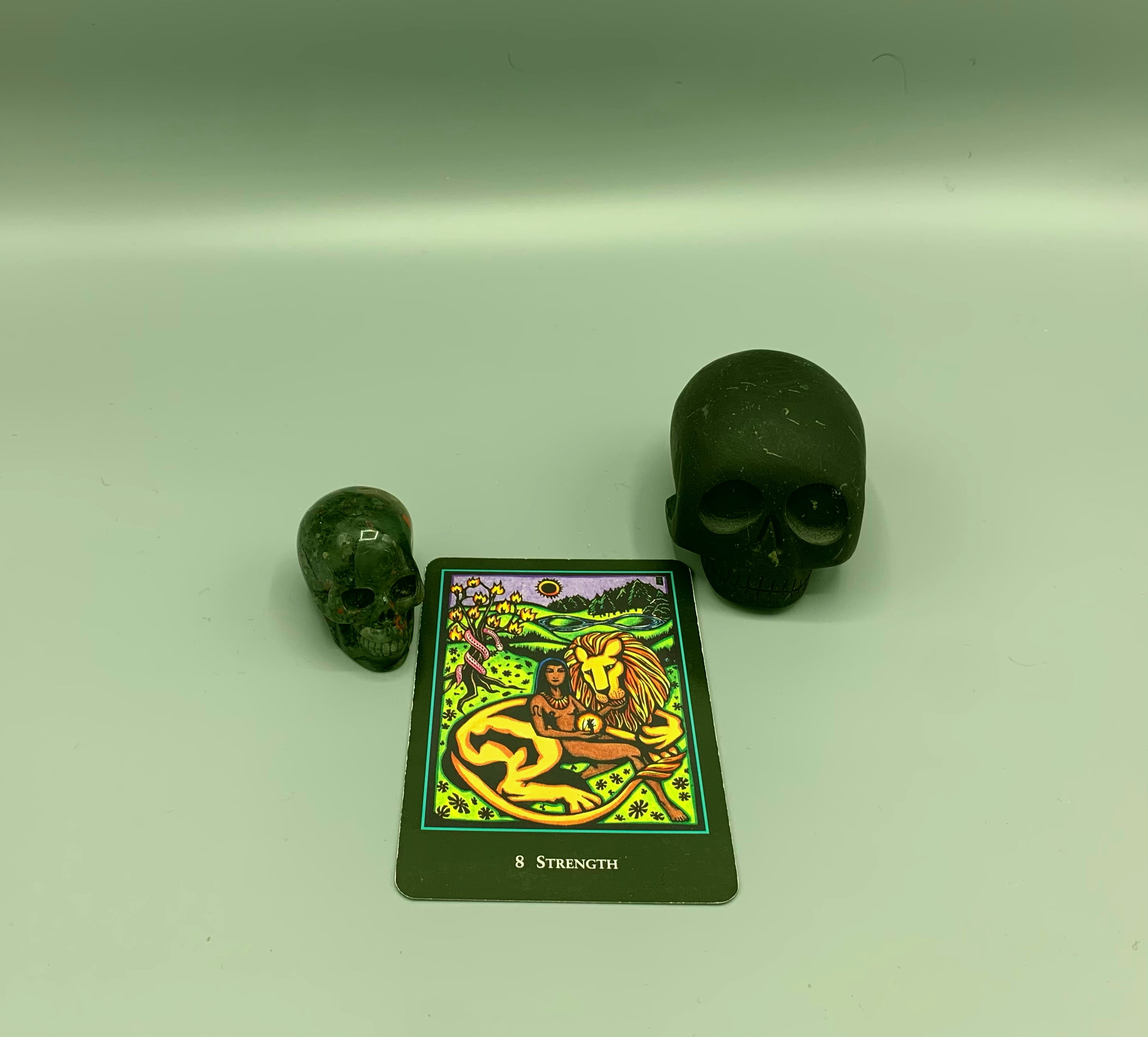 Card: VIII - Strength (deck: The Crystal Skull Tarot by Jessie Driscoll)