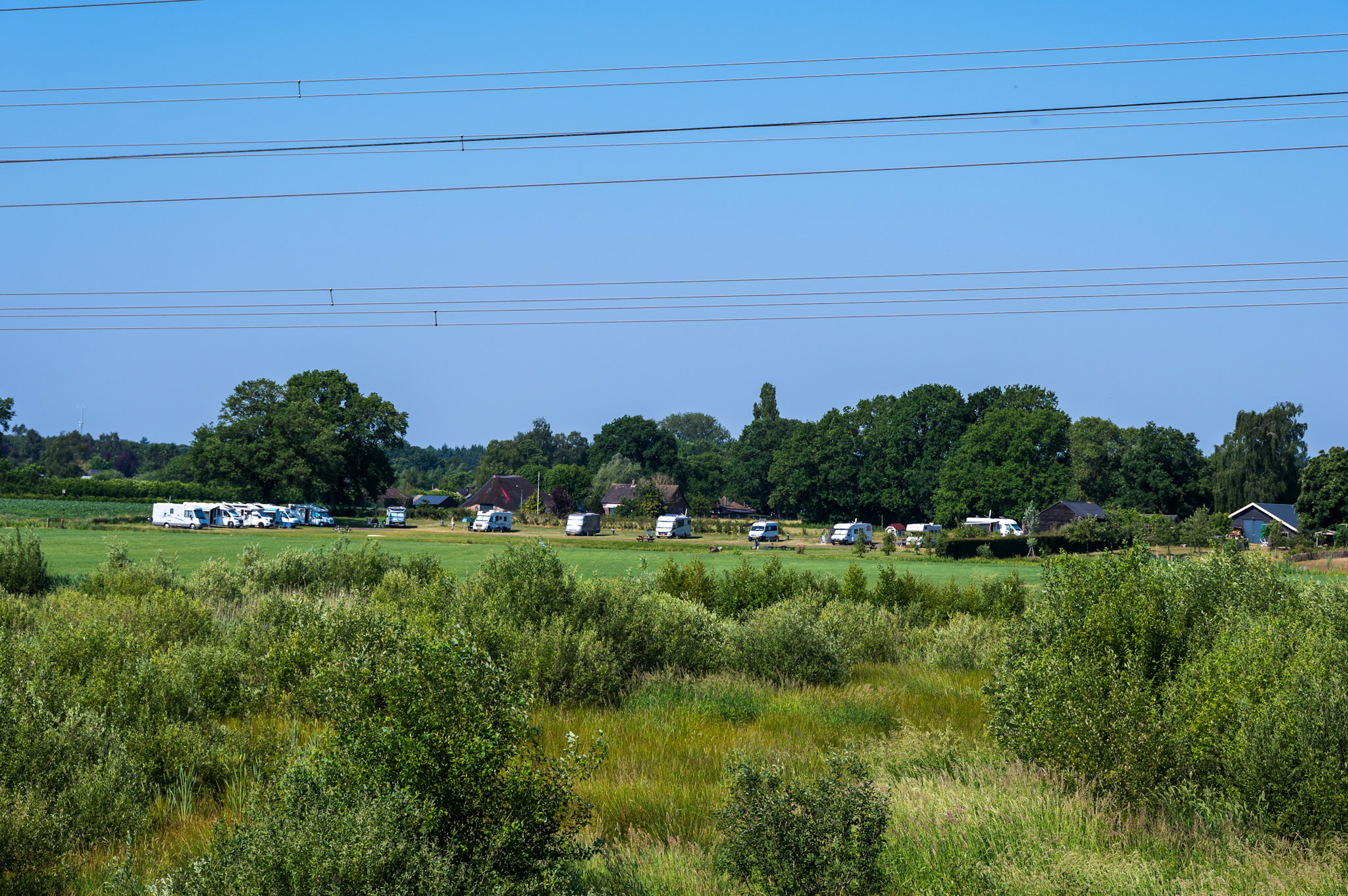 Zicht op die camperplaats vanaf het fietspad op de dijk.