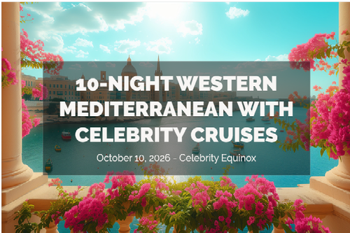 Set sail in October 2026 on an unforgettable 10-night Western Mediterranean cruise aboard the luxurious Celebrity Equinox! Discover the enchanting beauty and rich history of some of Europe’s most captivating destinations. From the vibrant streets of Barcelona to the stunning shores of Nice, each port of call offers a unique blend of culture, cuisine, and breathtaking scenery.Picture yourself wandering through the ancient streets of Rome, indulging in authentic Italian gelato in Florence, or exploring the historic treasures of Valetta and Sicily. With Celebrity Equinox’s world-class amenities and exceptional service, you’ll relax in style as you cruise the sparkling Mediterranean Sea.Join us for this extraordinary adventure where every moment is a chance to explore, unwind, and create memories that will last a lifetime. Don’t miss out on the cruise experience of your dreams—book your spot today!