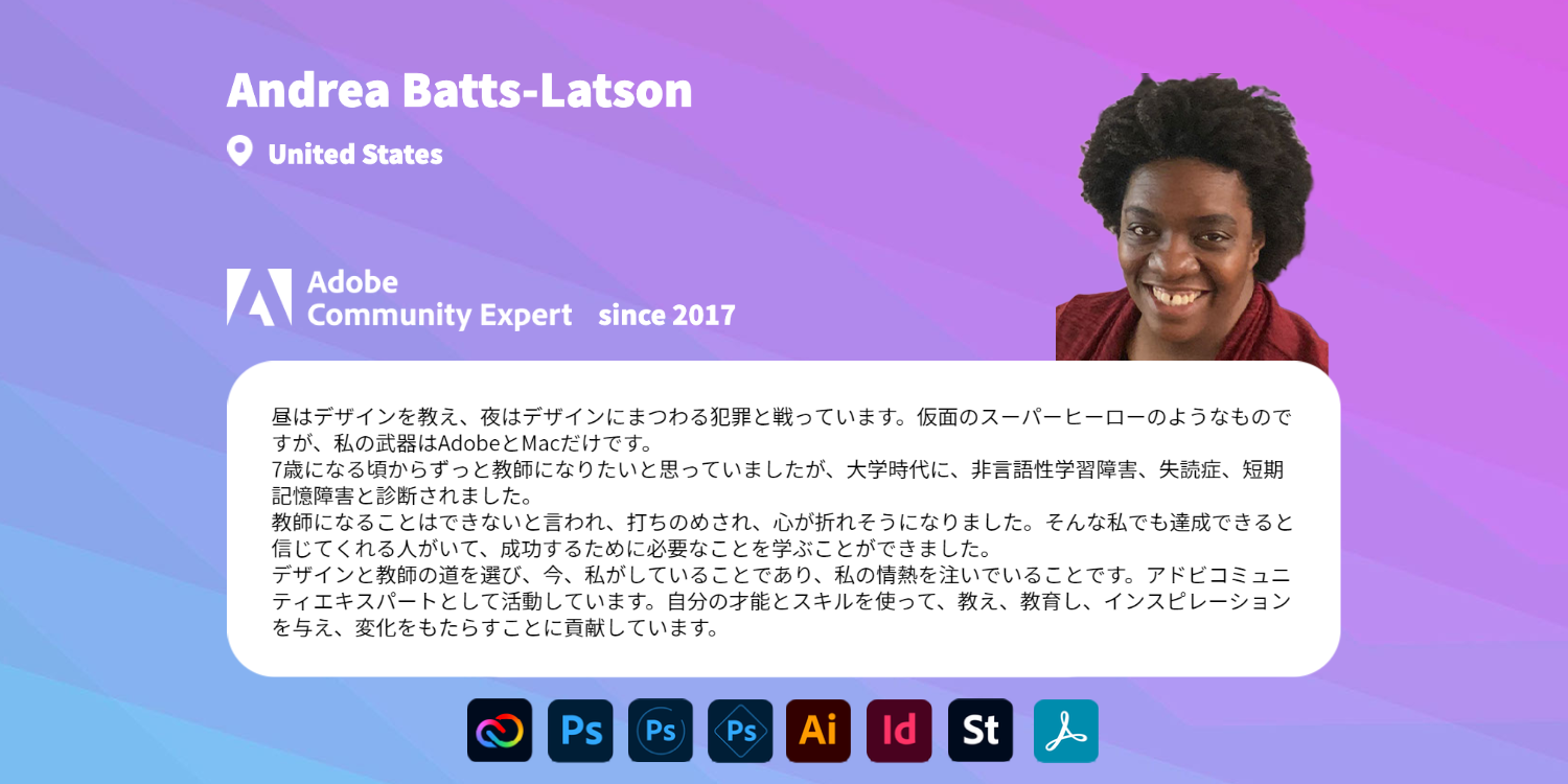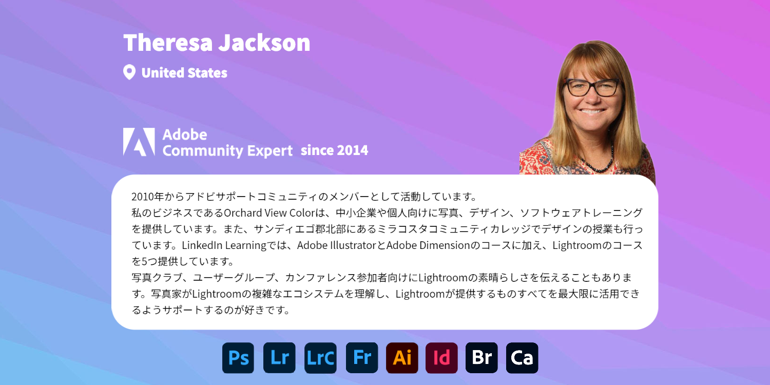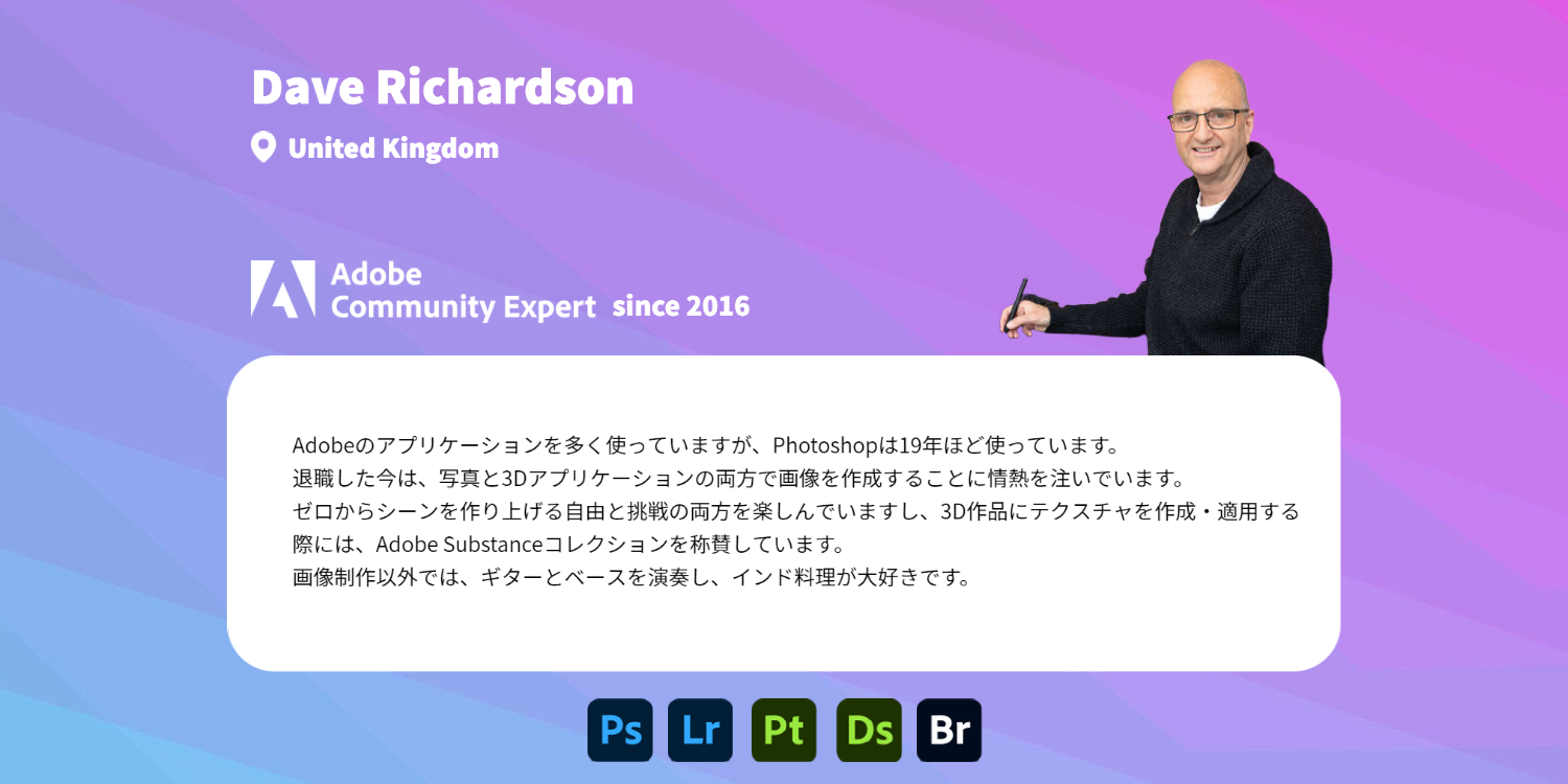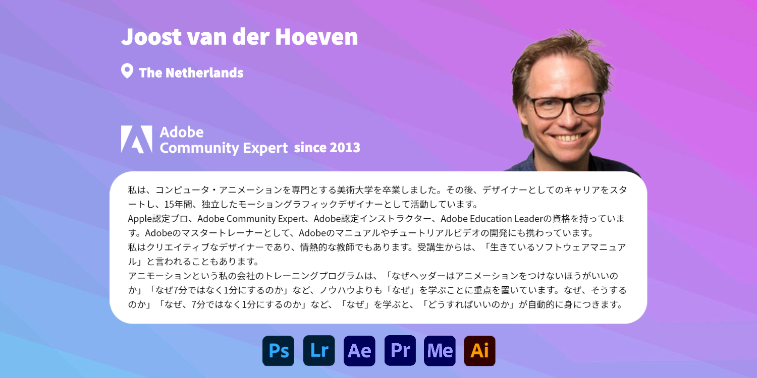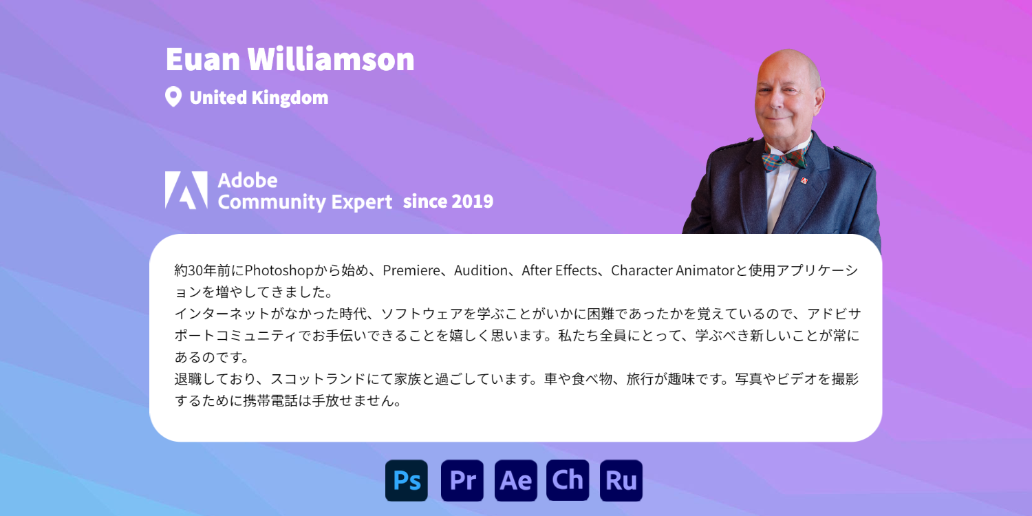 Community Expertは、各分野のコミュニティリーダーとして、クリエイティブな制作活動に対する情熱を持っていて、自身の専門知識を同士のユーザーを助けるために活用し、日々課題解決に取り組んでいます。そしてそれがこのコミュニティの価値そのものと言えます。
