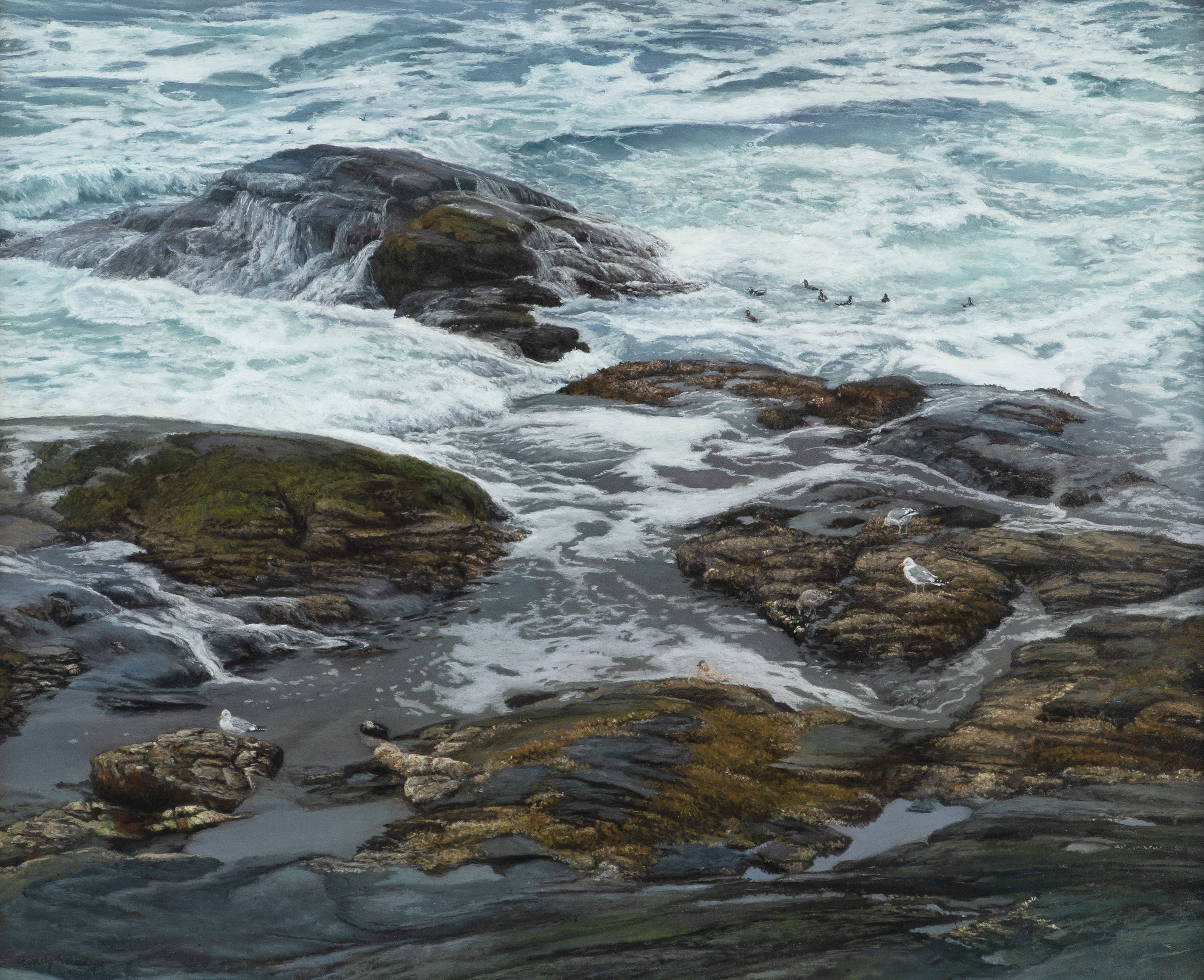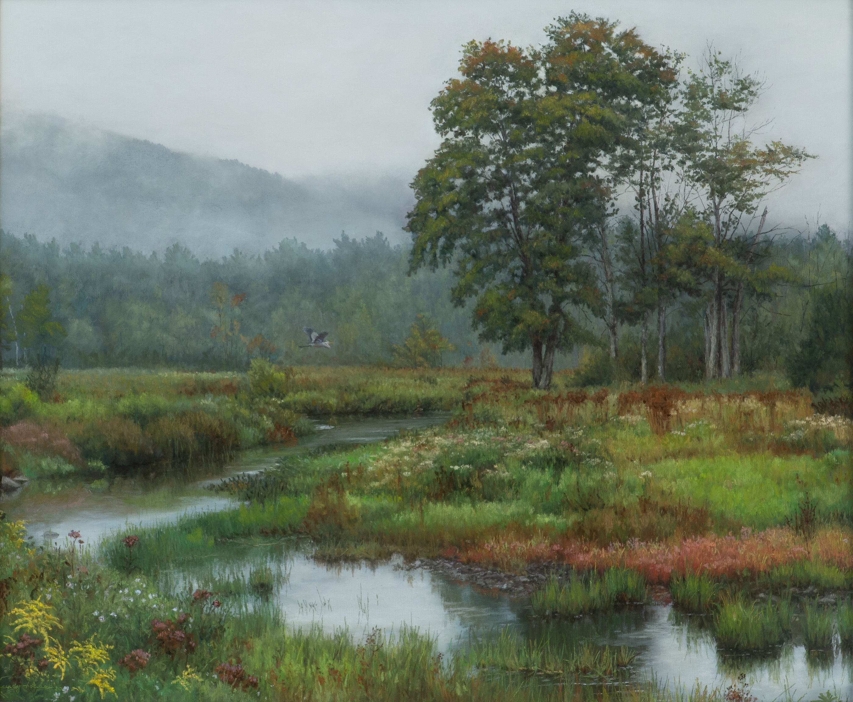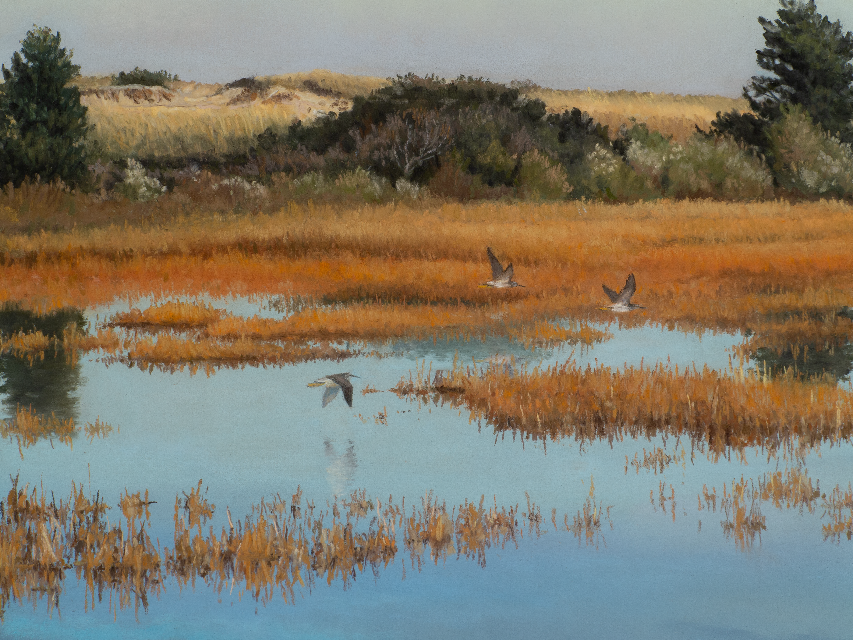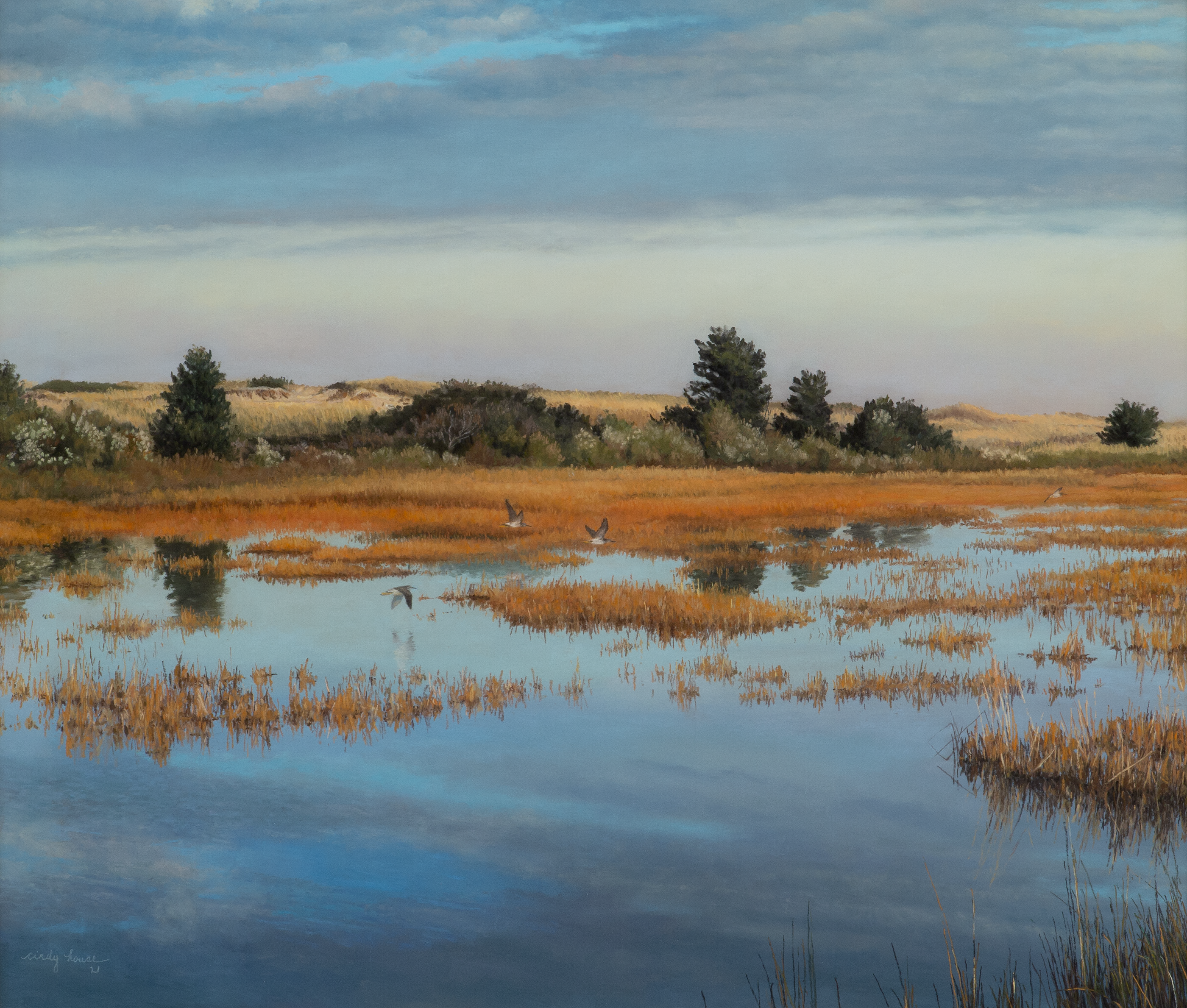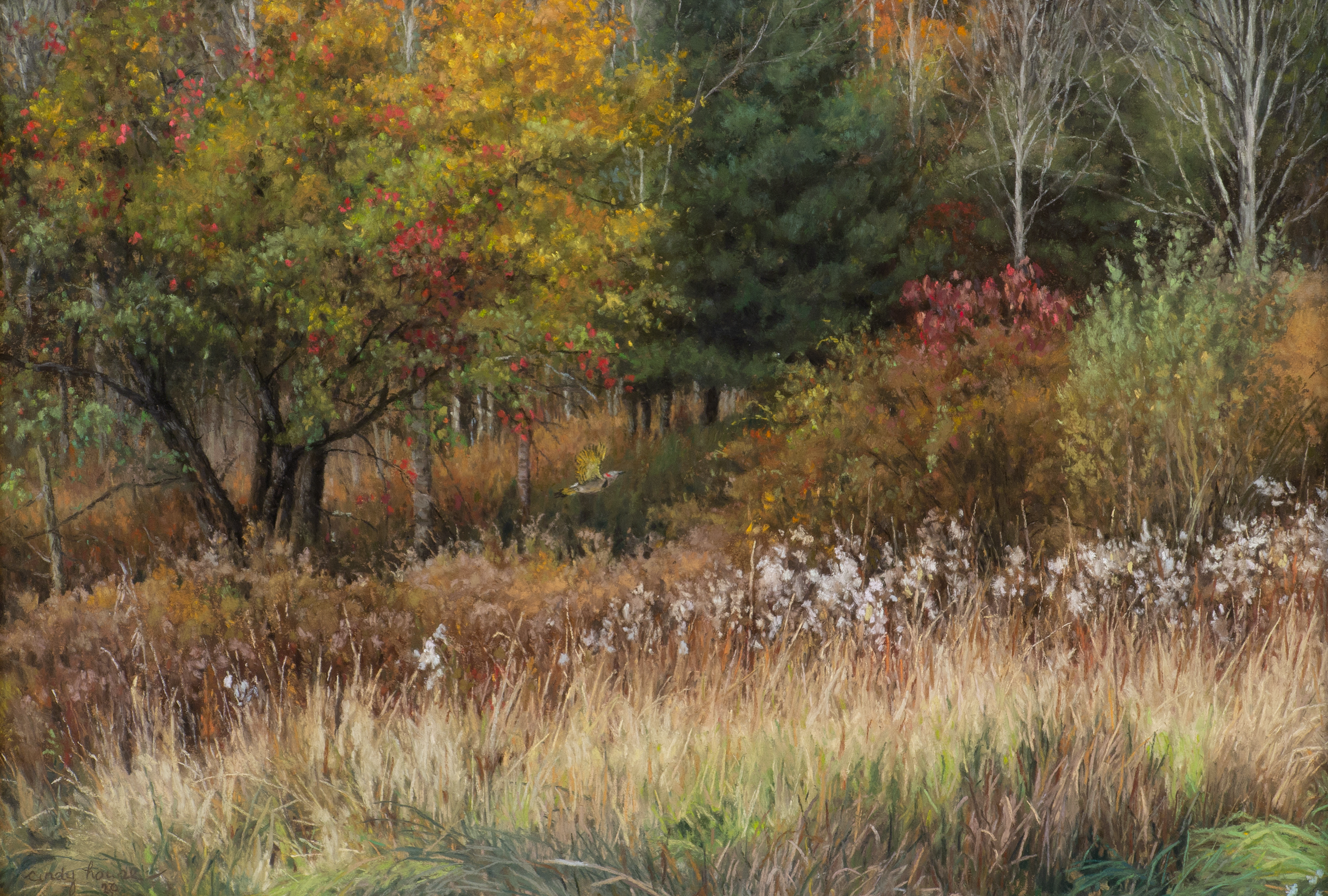 Whether depicting the fields and marshes of New Hampshire, the craggy coastline of Maine, or the sandy dunes of Plum Island, Massachusetts, Cindy captures the subtle moods of a place in a transportive way. Her naturalist’s heart and artist’s eye are often first drawn to a location’s vegetation and its innate compositional elements, while also taking note of the fauna inhabiting a place, namely avian subjects, which she believes add life to each painting. She has come to know her subject matter intimately over years of close study, and has a gift for truthfully rendering the texture and color of an ecosystem in all seasons, for accurately portraying a bird’s physical traits as well as its behavior and movement, and for conveying the atmosphere of the environment.
