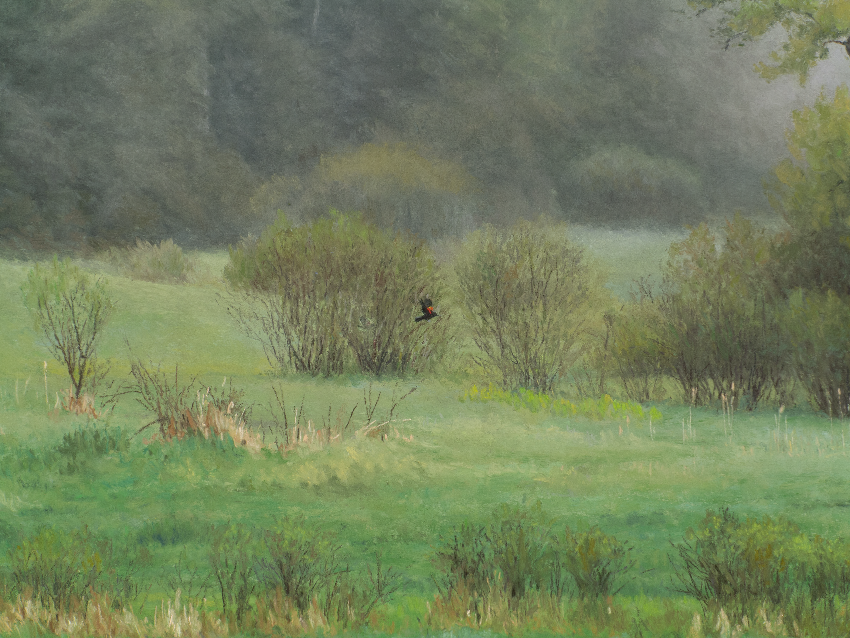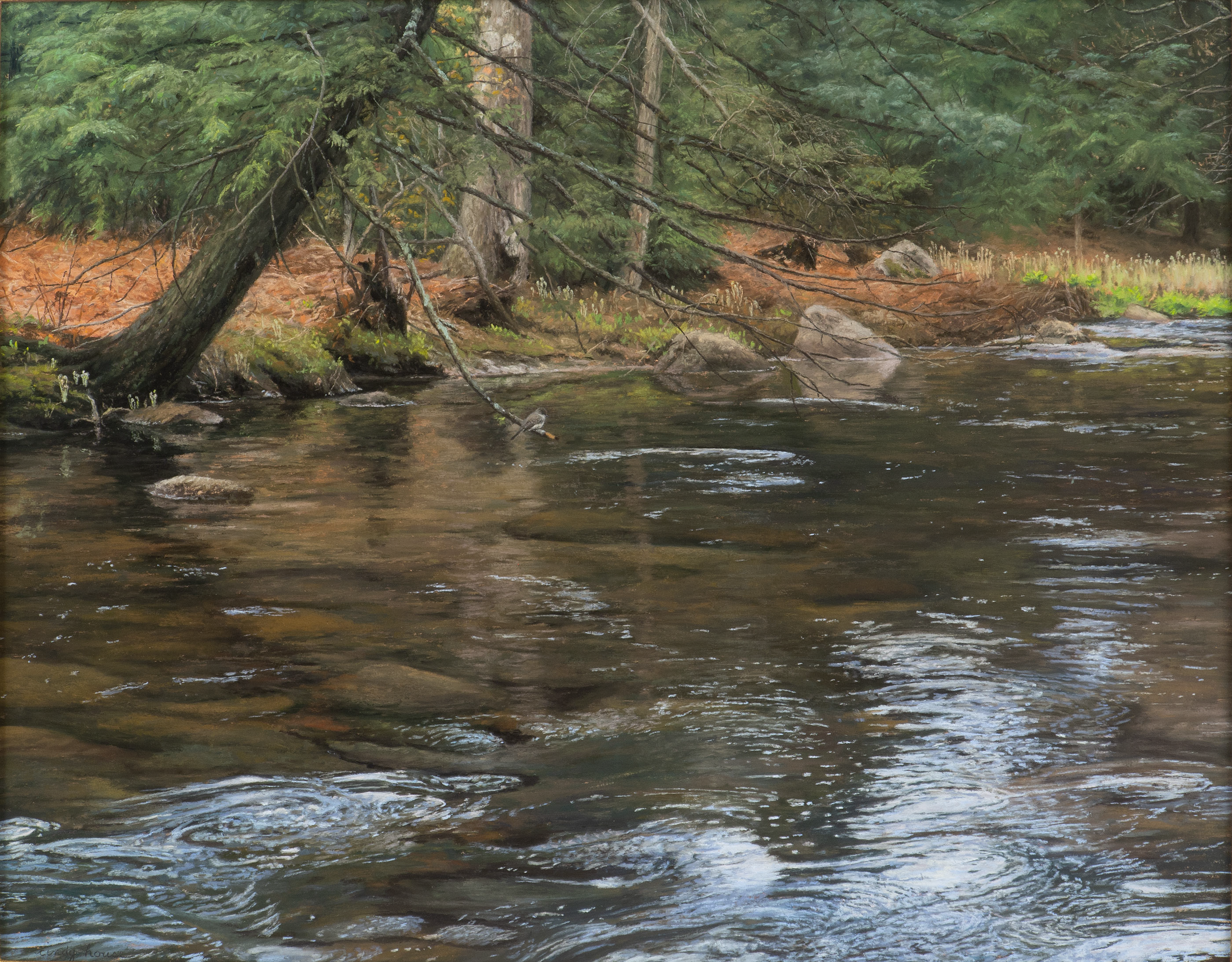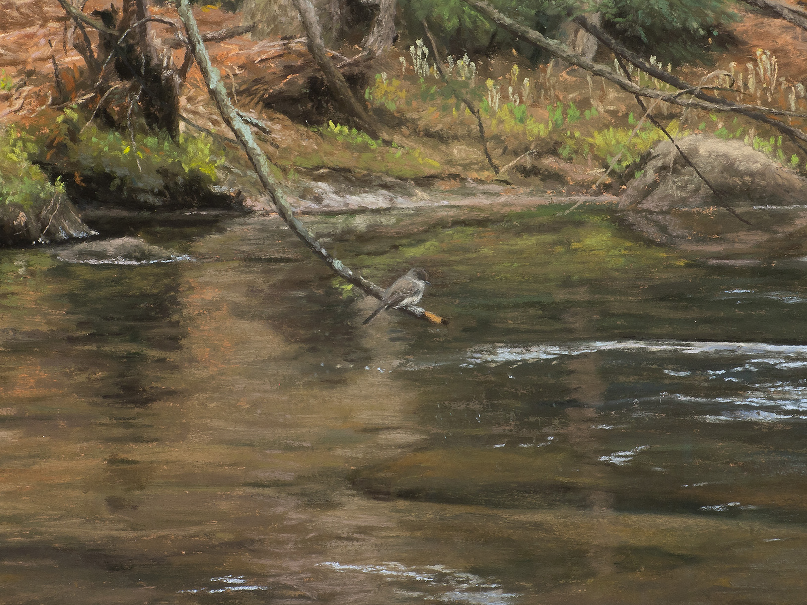 The influence of Millie House's careful study of nature is apparent in all of Cindy's works. Following in her mother's footsteps, Cindy pays special attention to the avian life included in her paintings. After years of close study, she has a gift for truthfully rendering a bird's physical traits, behavior, and movement. For example, in a detail of Spring Stream below, the Eastern Phoebe songbird resting on the tree branch is easily identifiable by its dark peaked head and white chest.