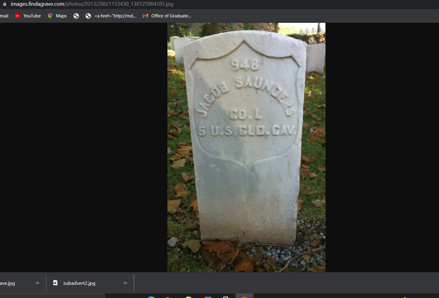 Nine months after his enlistment, Saunders was admitted to the regimental hospital in Lexington, Kentucky, due to chronic diarrhea. On either September 30th or October 1, 1865, Saunders died of the affliction. The exact date is not confirmed as his muster papers list September 30th and the grave marker itself has October 1 as the death date. Saunders is buried at Lexington National Cemetery (Section 0, Site 948).