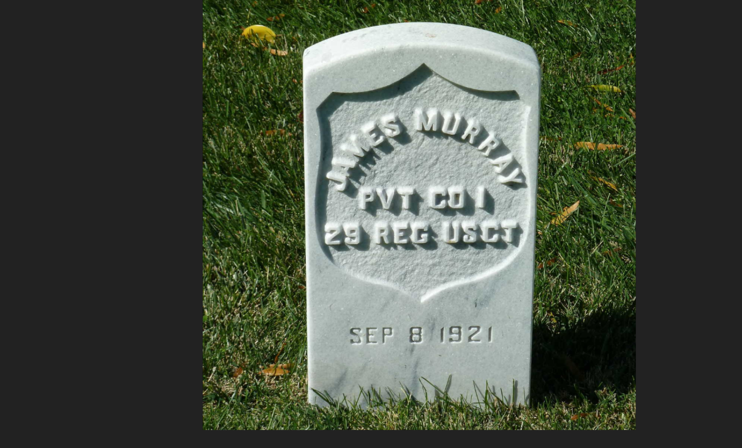 Murray survived his military service and eventually settled in Alexandria, Virginia. He married Matilda Gray and helped raise Ethel Thompson as his stepdaughter. He worked as a boatman and later as a stationary engineer at the Washington D.C. Orphanage for 15 years. Between 1910 and 1920, Murray paid off his mortgage and became a homeowner in Alexandria. Murray died on September 8, 1921 and is buried in Alexandria National Cemetery (Section B, Site 3601).