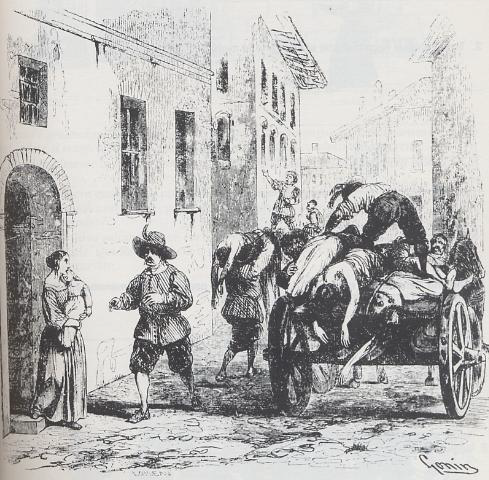 Il carro dei monatti sta per passare nella mia via, quindi riprendo Cecilia tra le mie braccia e, affaticata, scendo le scale e attendo sulla soglia dell’uscio dove intravedo il carro. Il monatto è fermo e aspetta che io gli dia la mia bambina per gettarla sul carro sopra gli altri cadaveri, ma io non voglio che le si faccia questo; quindi porgo una piccola borsa piena di monete al monatto chiedendogli di non levarle un filo d’intorno e che non venga fatto da nessun altro.