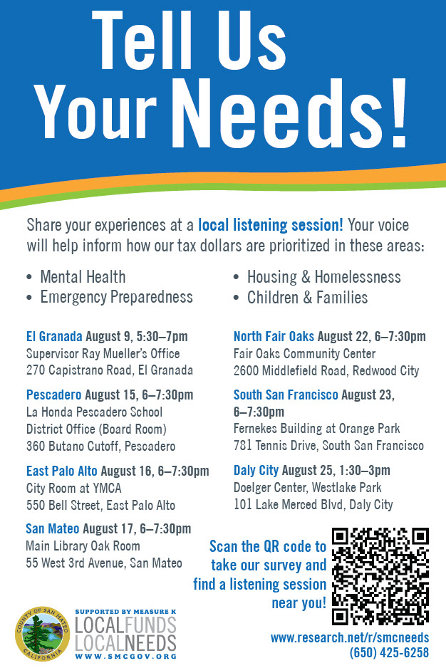 The County of San Mateo yesterday announced a series of listening sessions along with a survey to hear directly from residents about their needs in four key areas. Residents are invited to share their experiences and needs on issues of housing and homelessness, children and families, emergency preparedness, and mental health. Start by taking the survey, which is available in English, Spanish, Tagalog, and Simplified Chinese.