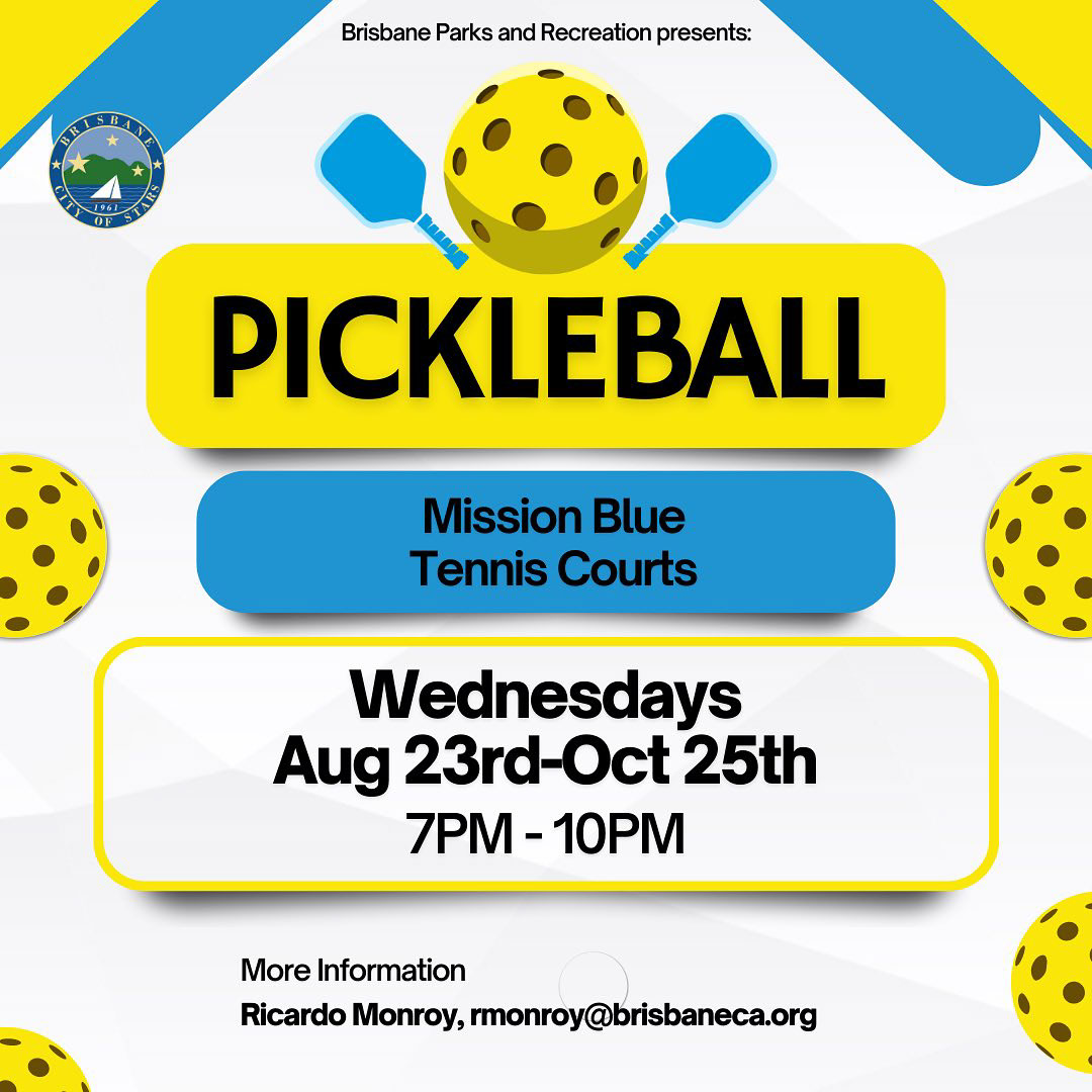 The Park & Rec Department announced last week that starting Aug 23rd-October 25th on Wednesday evenings from 7-10pm, there will be designated Pickleball time at Mission Blue Tennis Courts. FREE. Staff will be placing temporary pickleball lines on the courts. During this time, pickleball can be played on the courts on a first come, first serve basis. No additional supplies or instruction will be provided. Parks and Rec looks forward to testing this out and appreciates the community in advance for their participation and cooperation. Email rmonroy@brisbaneca.org for any questions.