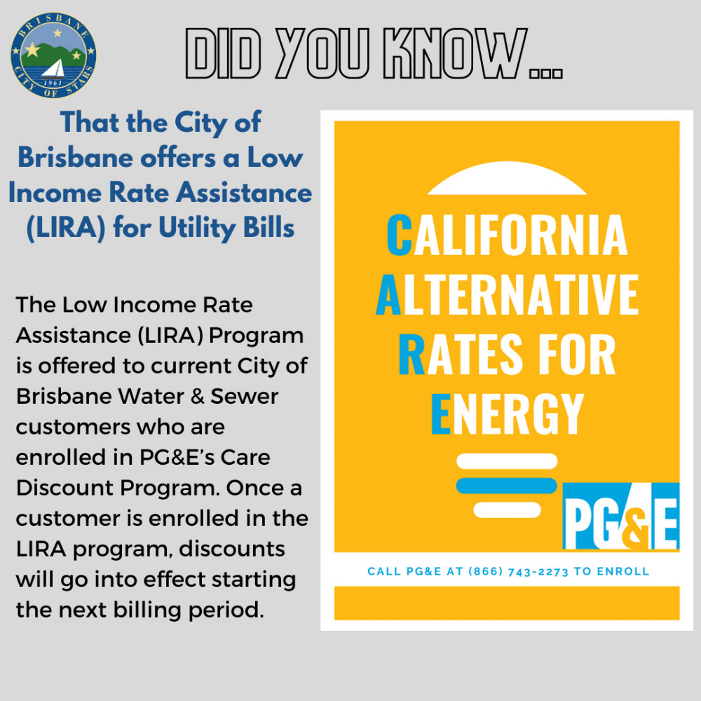This August bill captures the June 15th – August 15th billing cycle, and will be sent out the last week of August (due Thursday, October 5, 2023). Learn if you qualify for LIRA at brisbaneca.org/lira or the State’s Low Income Water Assistance Program (LIHWAP) at csd.ca.gov/waterbill. The State’s LIHWAP Referrals Portal is available at taphelp.org (to begin the application process, please complete and submit the form found on that webpage). Should you have any questions about your bill or the new rates, FAQs are available on the City’s website at brisbaneca.org/utility-billing. To speak with a staff member, please reach out to Ligia Ferreira at (415) 508-2154 or email her at lferreira@brisbaneca.org.