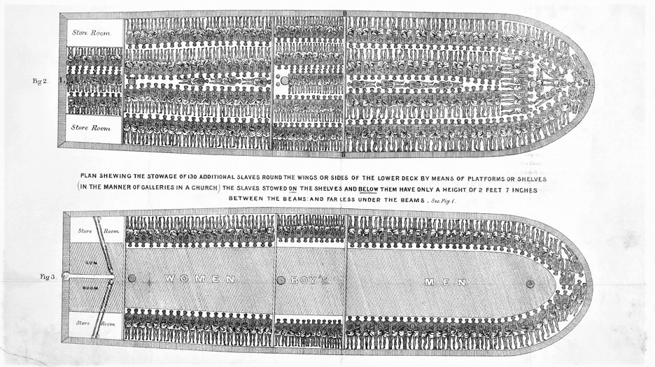 This diagram of the Brookes, a British slave ship built in Liverpool in the 1780s, shows how captured Africans were forced to endure the “Middle Passage,” a journey at sea from Africa to the New World, tightly packed below deck in inhumane conditions. Between 1781 and 1785, this ship carried more than 600 enslaved Africans on the “Middle Passage” trip from West Africa to the Caribbean, many of whom died as a result of conditions on board. (Public Domain Image)