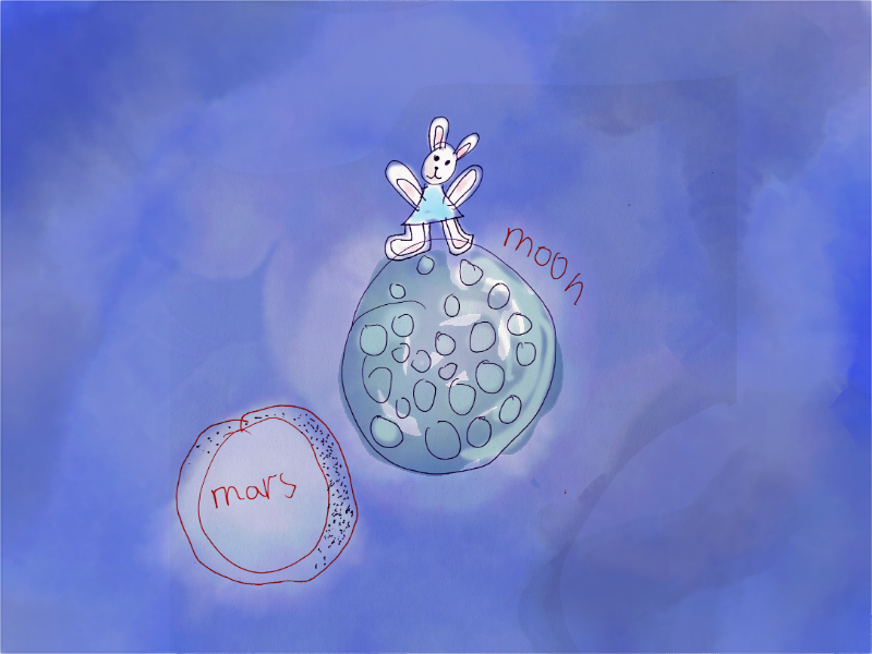 “Where is this mouse?” asked Space Bunny. “Still in the fridge I think’” said Grandad. Space Bunny gently knocked on the fridge door. “Sssssh” she said I can hear something. They all listened. Then they heard a quiet miserable little voice humming a tune. It was ‘Blue Moon’. Space Bunny opened the fridge door and there was the blue moon mouse curled up in a corner humming sadly to herself.