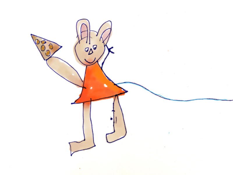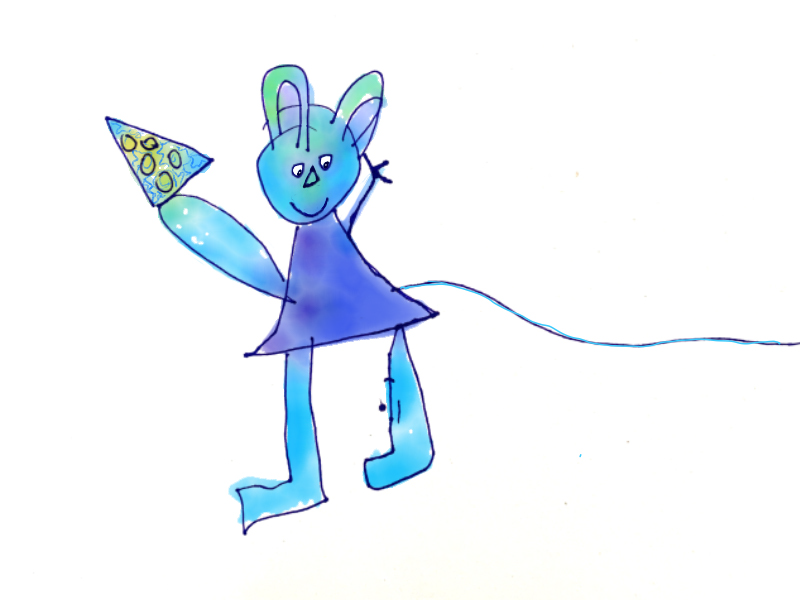 So Molly sat on the radiator to get warm, because it was cold in the fridge. When she was comfortable she began her story. “I was not always blue” she said, “I used to be mouse coloured. I enjoyed chocolate fudge brownies and going to parties with my friends Lara and Parker. Then one day at a party there were three older aliens showing off to two teenage moon girls with ‘cool dude’ short haircuts, called Ehlah and Ehryn. ‘Let’s magic the mouse’ said Shah and they all laughed.” At the memory of this Molly began to cry. Grub thoughtfully opened the fridge door and took out a tiny piece of cheese, which he gave to Molly. “Thank you” she sniffled.