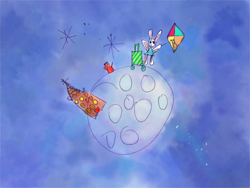 To celebrate Grandad invited them all to tea. They had chocolate fudge brownies and carrot cake, which was the colour of carrots. After tea Space Bunny thought it was time to go home. The magic kite was a bit uncomfortable so she called a moon taxi. As the taxi took off she shouted to Molly, Lara and Parker, who were playing in the garden, “Keep up with the little rainbows. They really work.”