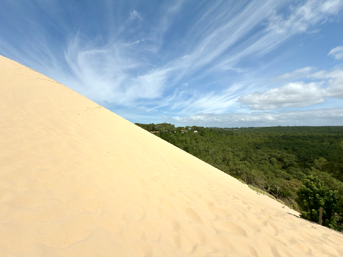 This morning we made our way to the Dune du Pilat the highest sand dune in Europe. This was a bit of a surprise as we had no knowledge of it before we spotted the large dune from the ferry port of Cap Ferret the previous day where we caught the ferry across to Arcachon. After googling it, we put it on our agenda for the day and it didn’t disappoint. It blew our socks off! Literally as we ditched our shoes and climbed it barefoot. It is a remarkable natural phenomenon. A living thing that is slowly moving inland between 1 to 5m per year burying anything in its path.