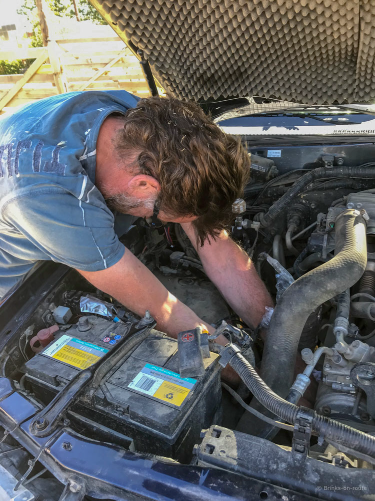 Soms eindigt een mooie dag abrupt. Wanneer we aan het einde van de dag een plek hebben gevonden voor de nacht blijken de accu's niet bijgeladen. De dynamo heeft het begeven. Om te voorkomen dat de auto de volgende dag niet kan starten gaan we op zoek naar een garage.