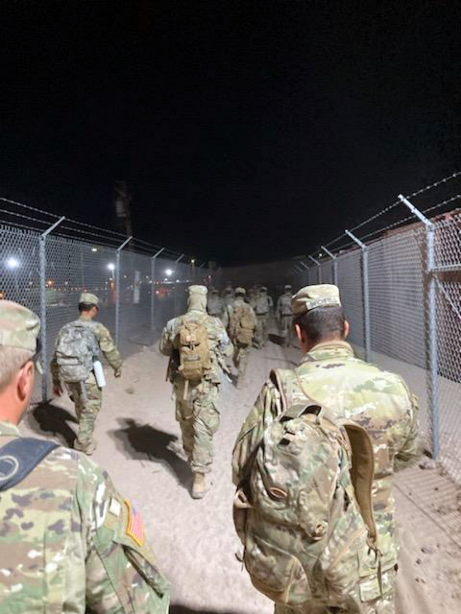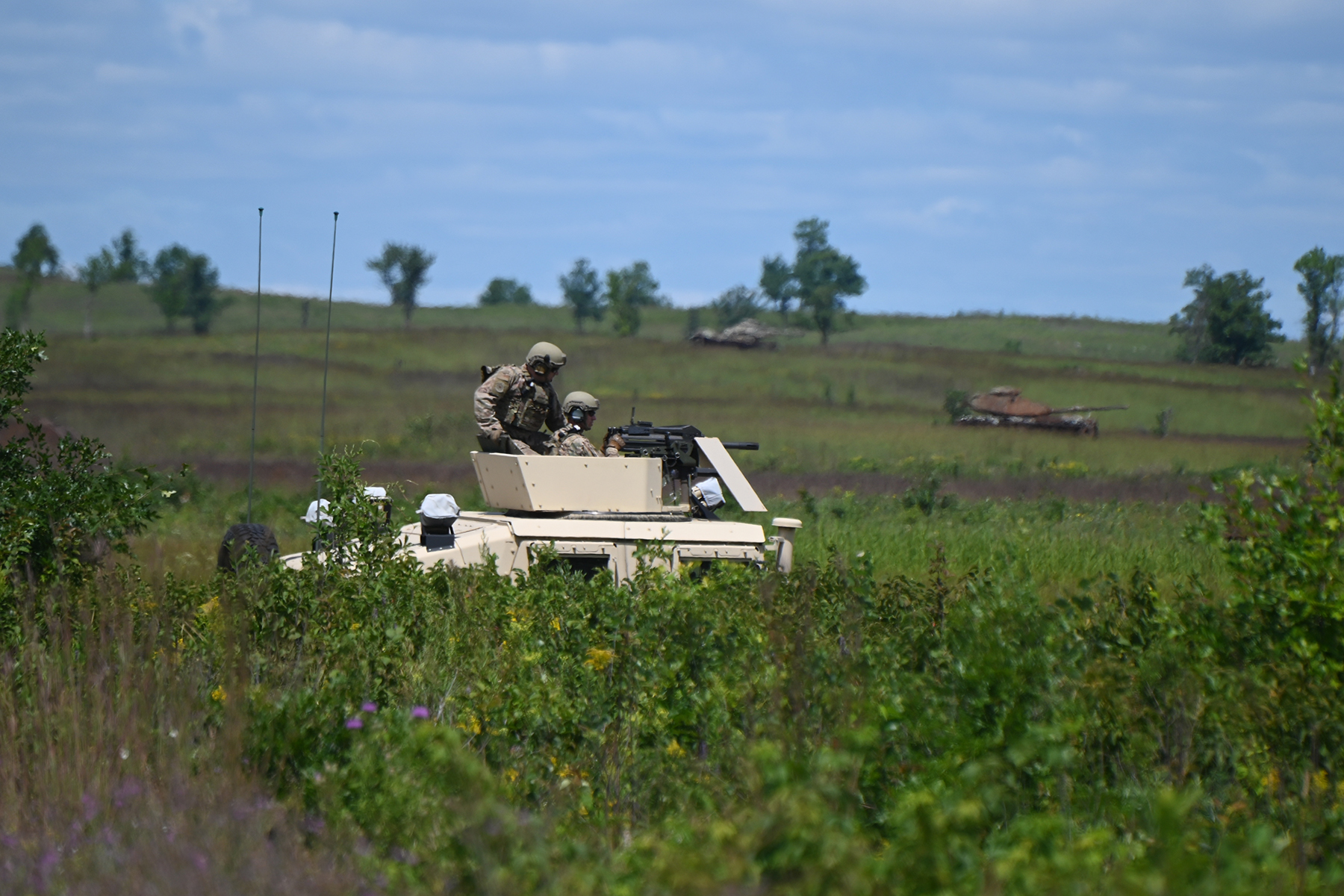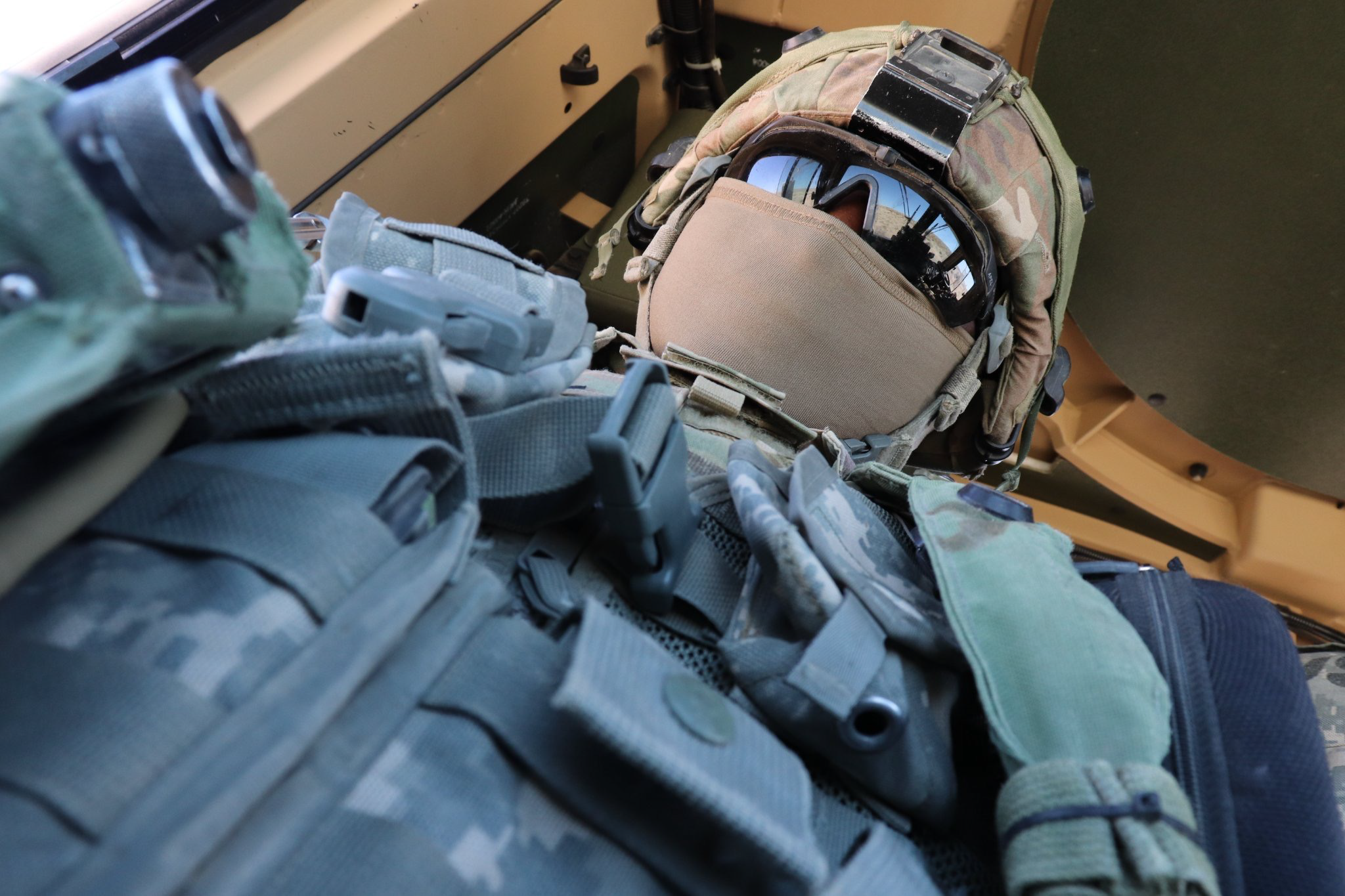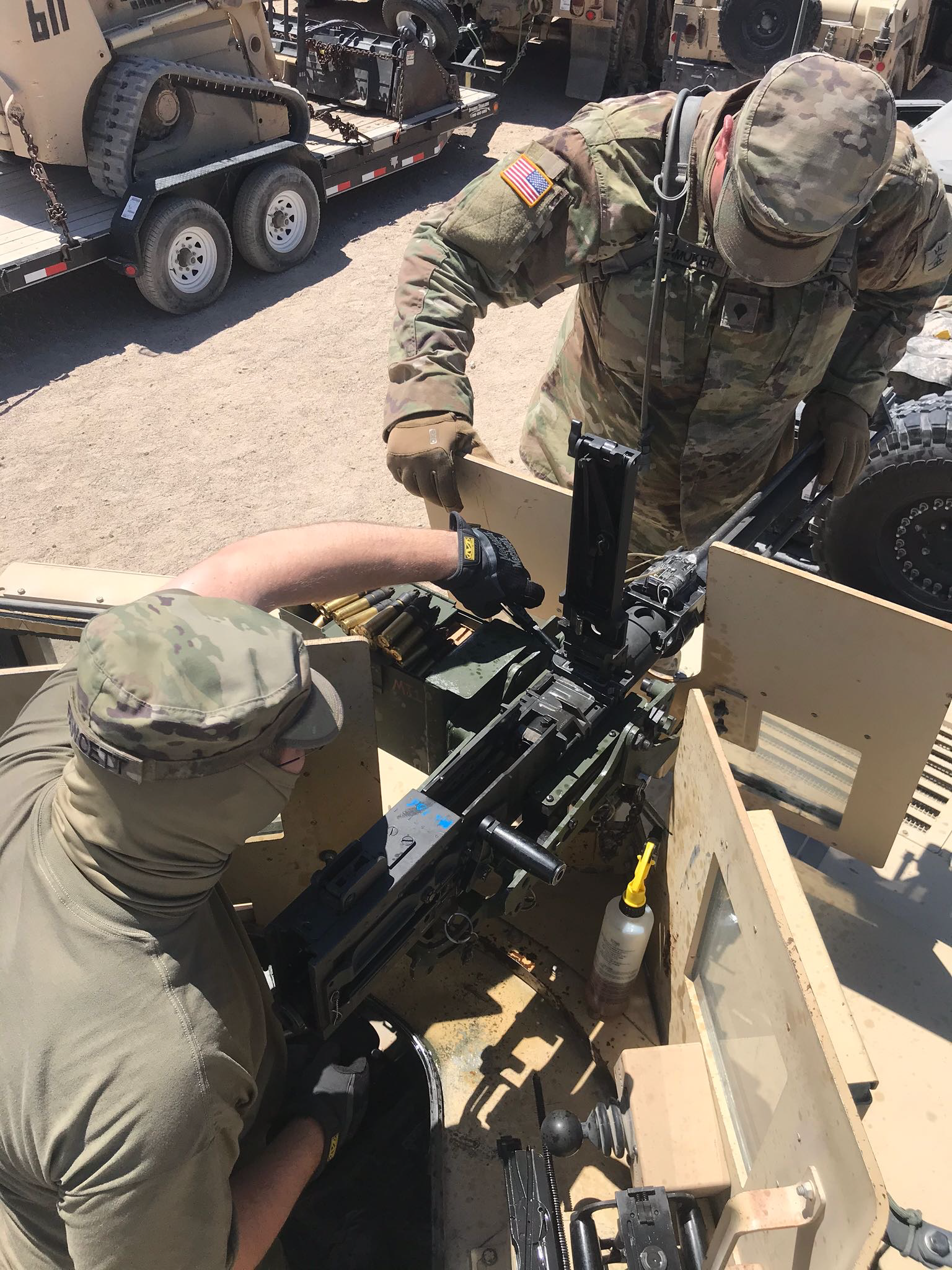 An 815th Engineer Construction Company Soldier scans his vehicle's route as an assistant driver during convoy operation toward the unit's TAA (tactical assembly area) during training on July 17, 2020 at the during training at the National Training Center at Fort Irwin, Calif.