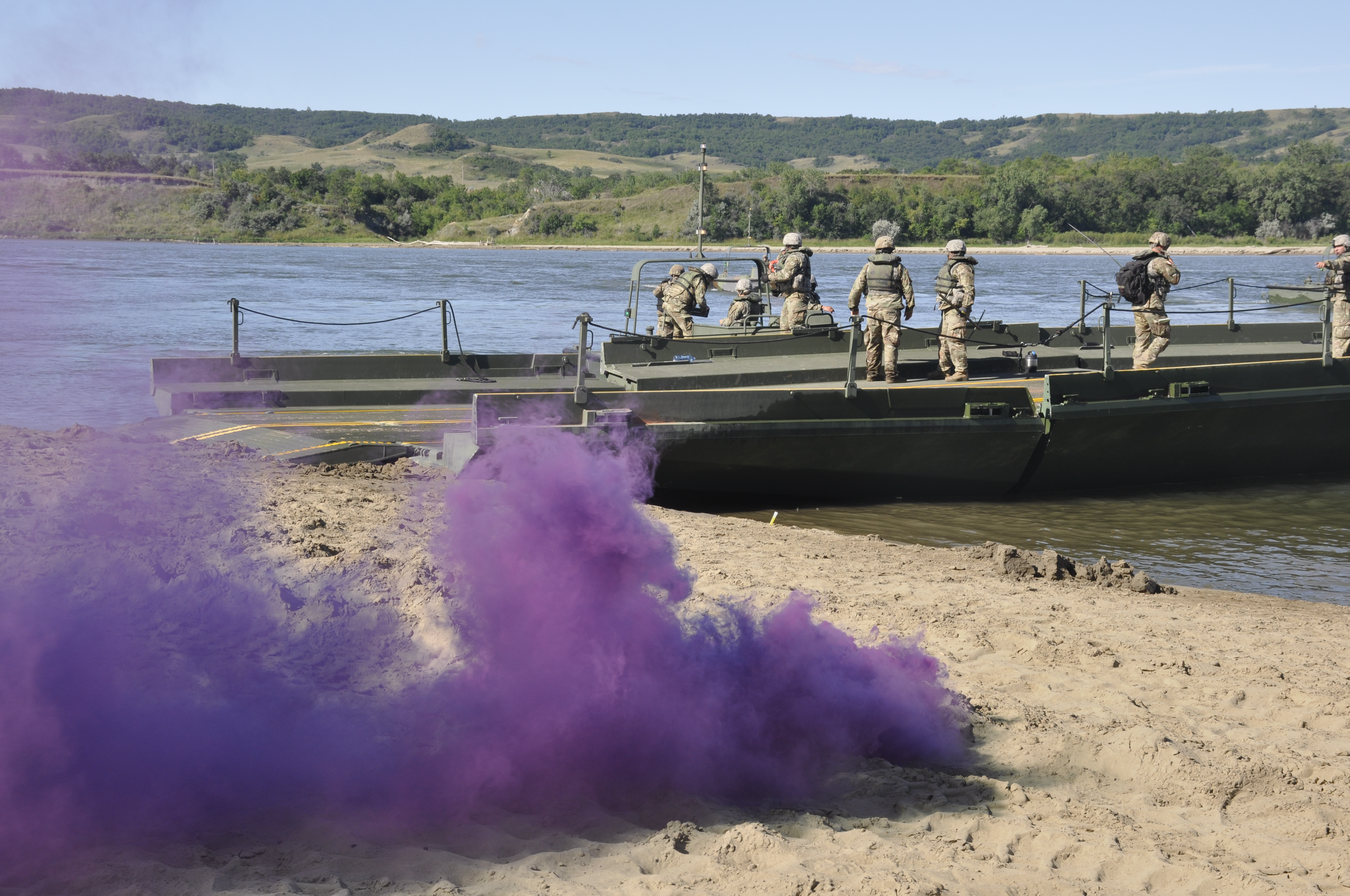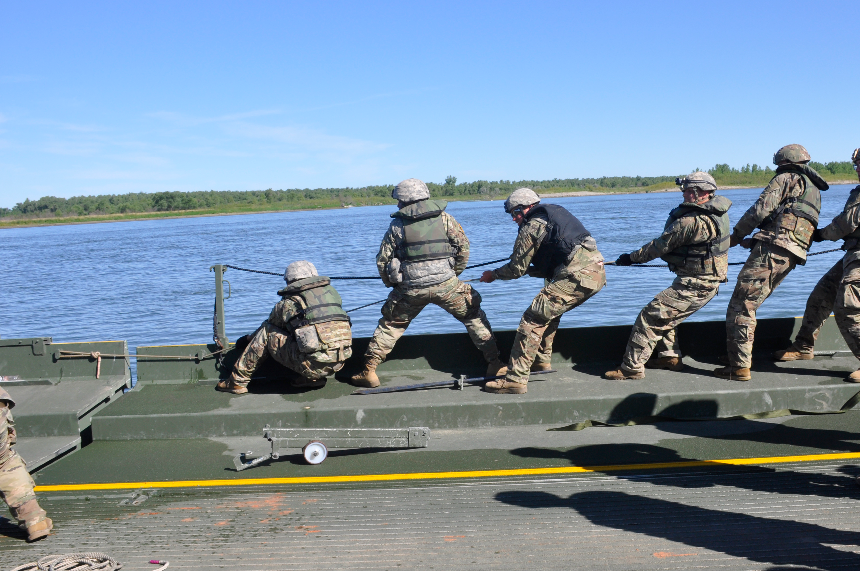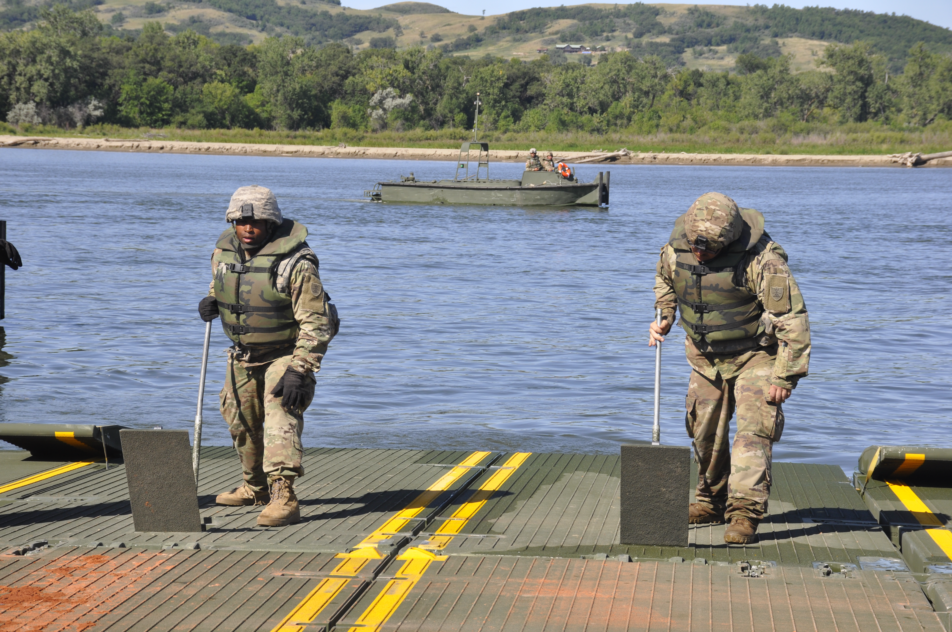 Soldiers of the 957th Engineer Company (Multi-role Bridge) pull an Improved Ribbon Bridge bay section into place before latching to existing raft on the Missouri River south of Bismarck on Aug. 10, 2020.
