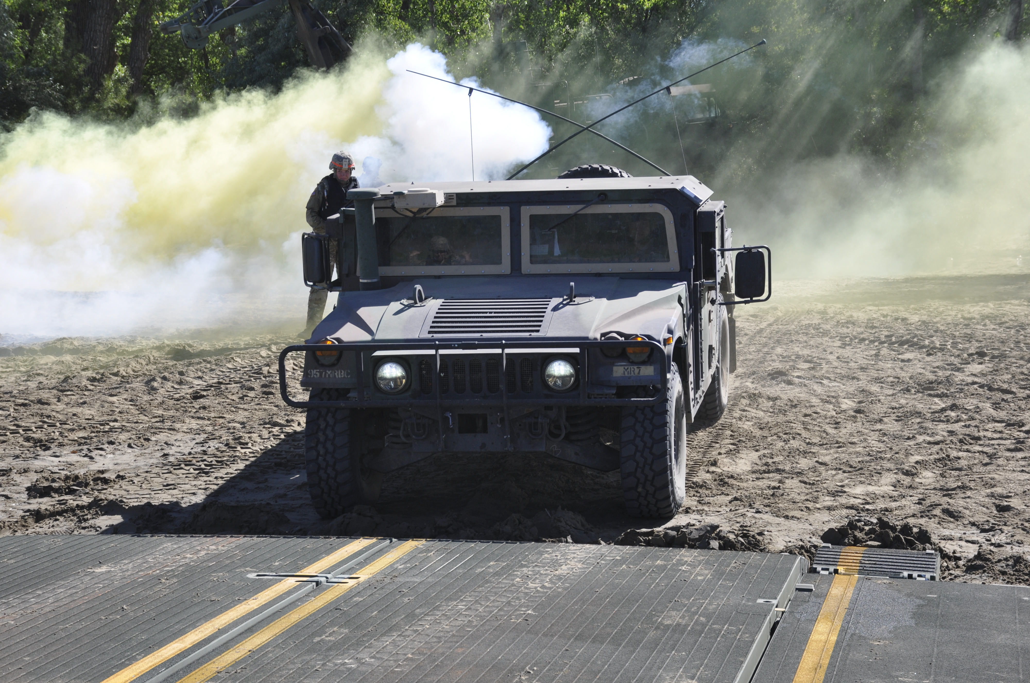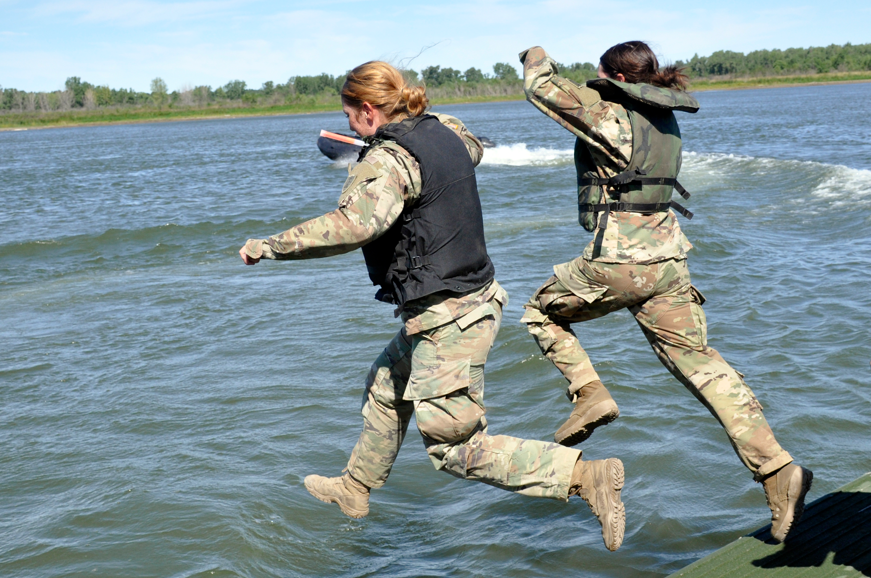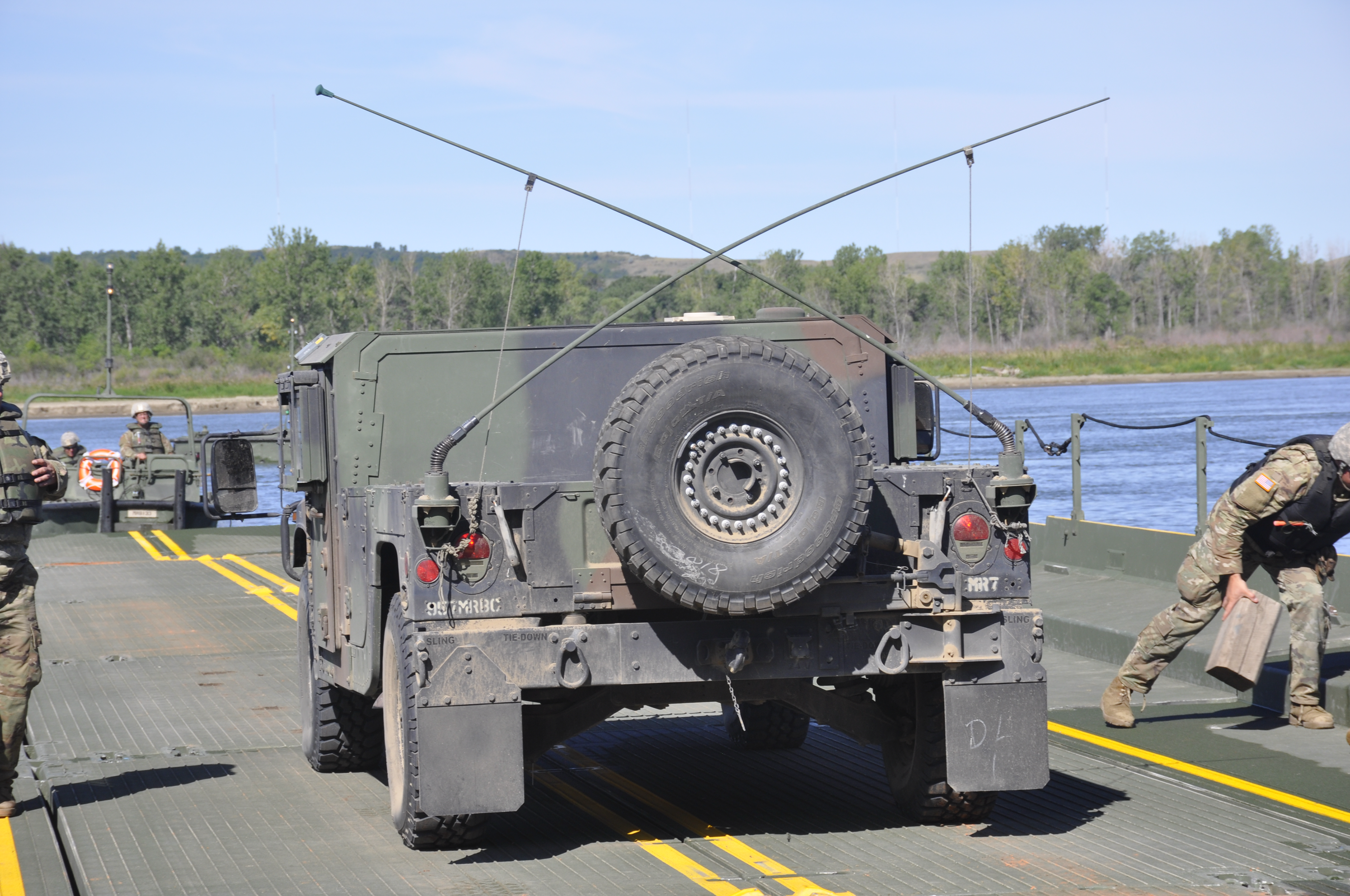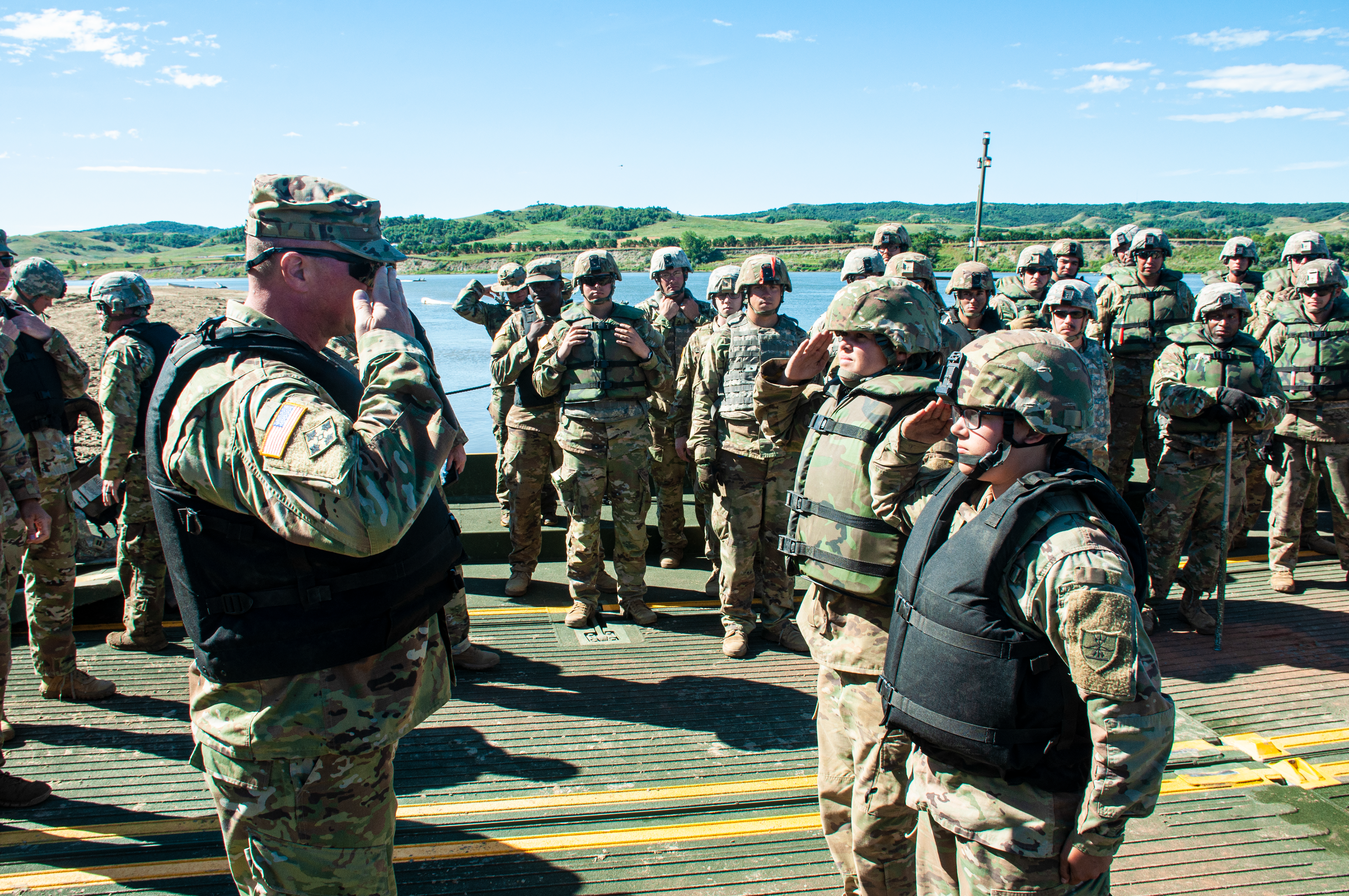 Soldiers of the 957th Engineer Company (Multi-role Bridge) pull an Improved Ribbon Bridge bay section into place before latching to existing raft on the Missouri River south of Bismarck on Aug. 10, 2020.