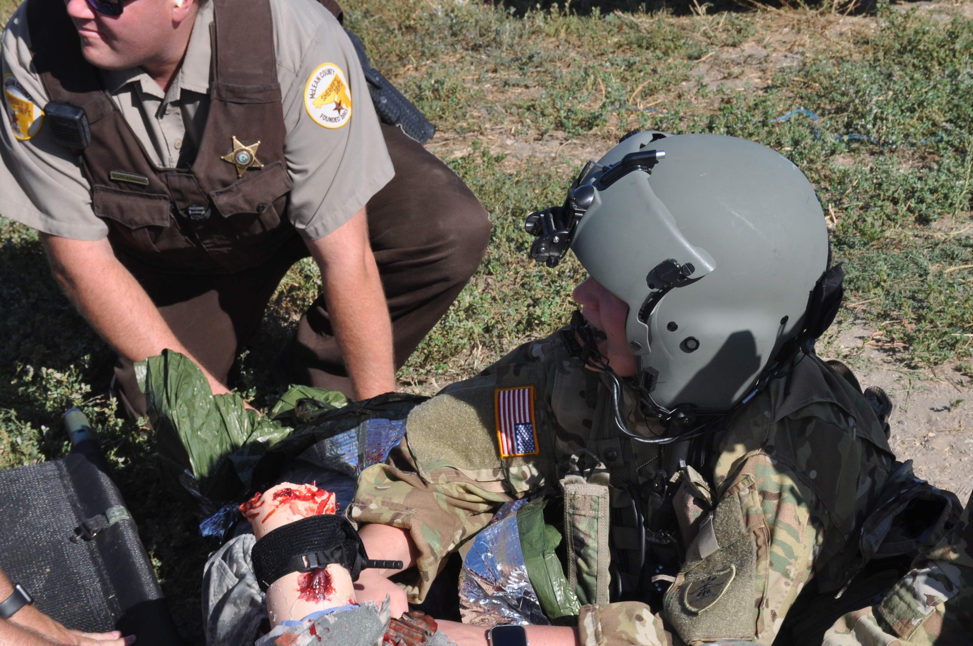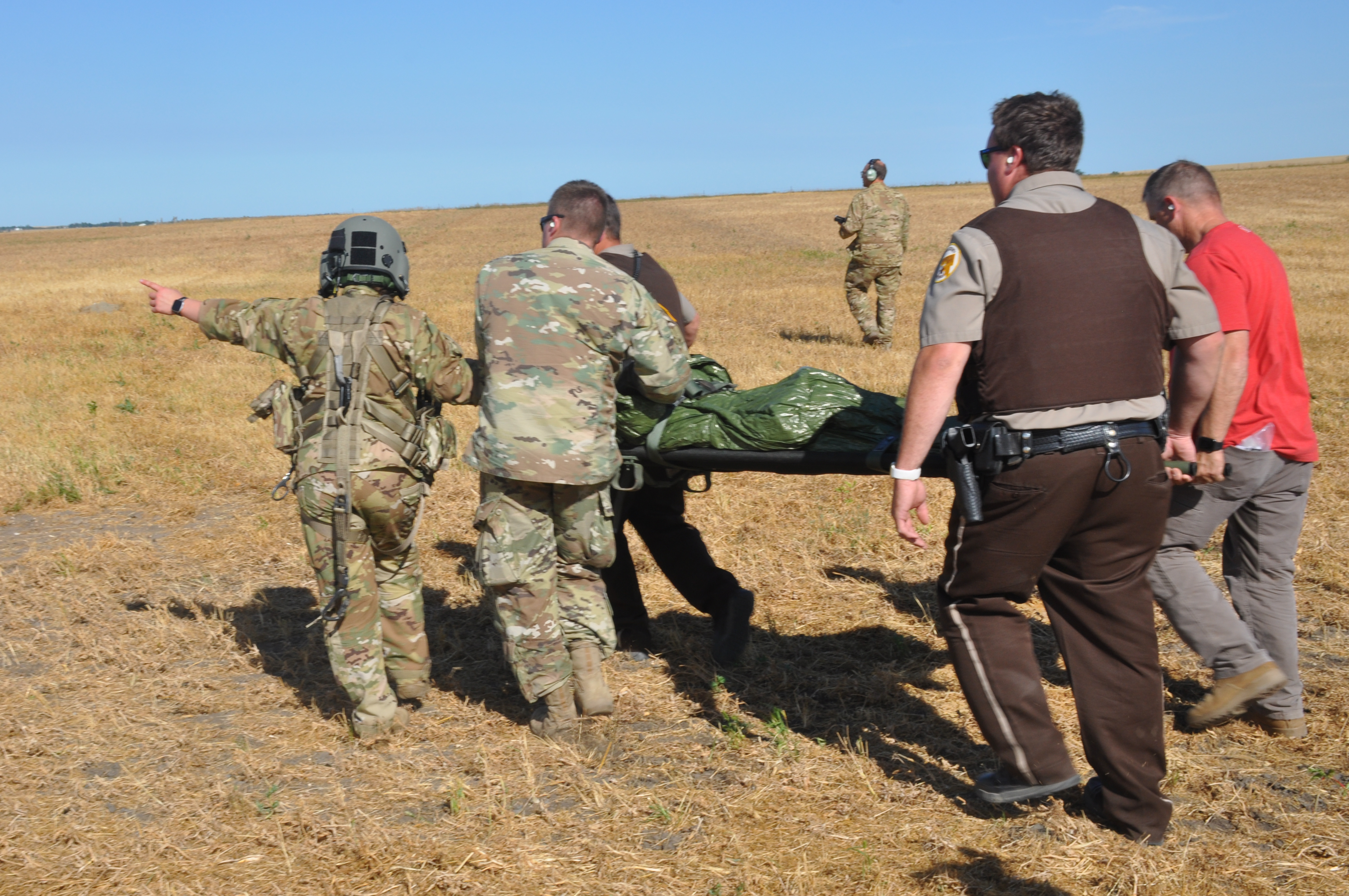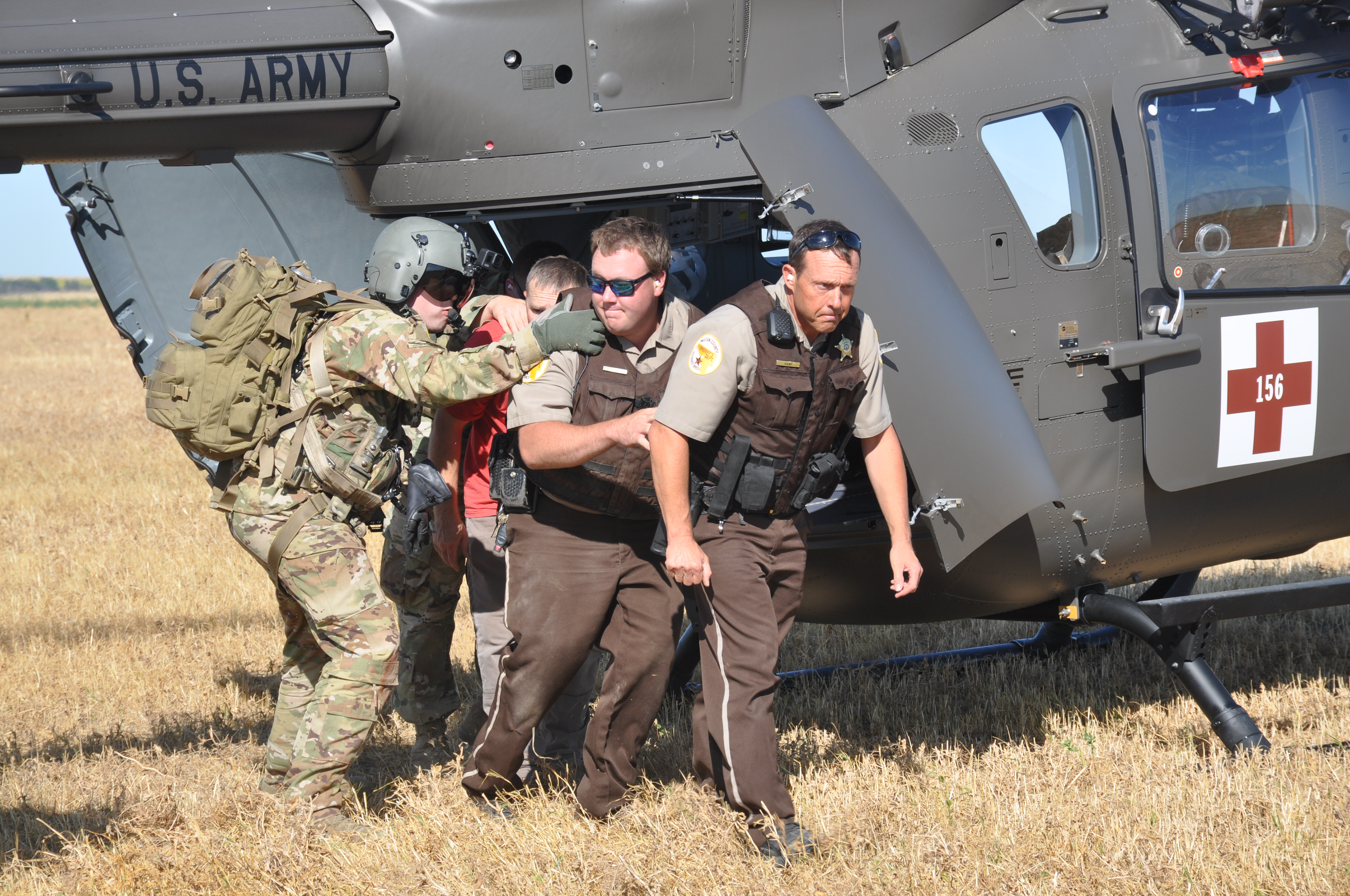 Soldiers of 1st Battalion, 112th Aviation Regiment (Security & Support) traveled north from Bismarck to hold a joint exercise with the McLean Sheriff's Office in McLean County, N.D. Aug. 10 to 12, 2020. Missions included aircraft surveillance and aerial MEDEVAC (medical evacuation). Two UH-72A Lakota helicopters participated in the MEDEVAC allowing two sets of flight medics to receive training in stabilizing and transporting a mannequin casualty assisted by deputy sheriffs who were present on the scene as part of the scenario. (U.S. National Guard story and photos by Bill Prokopyk, N.D. National Guard Public Affairs Office)
