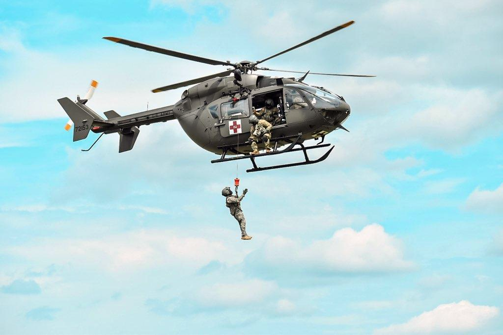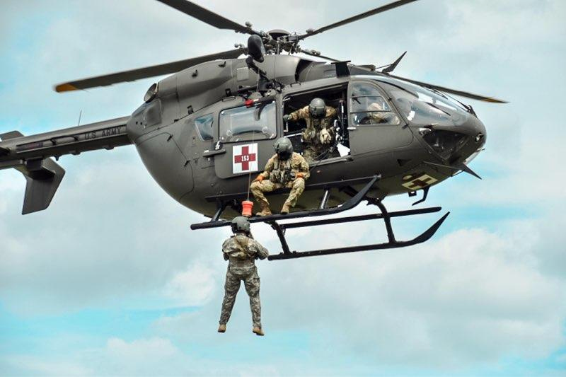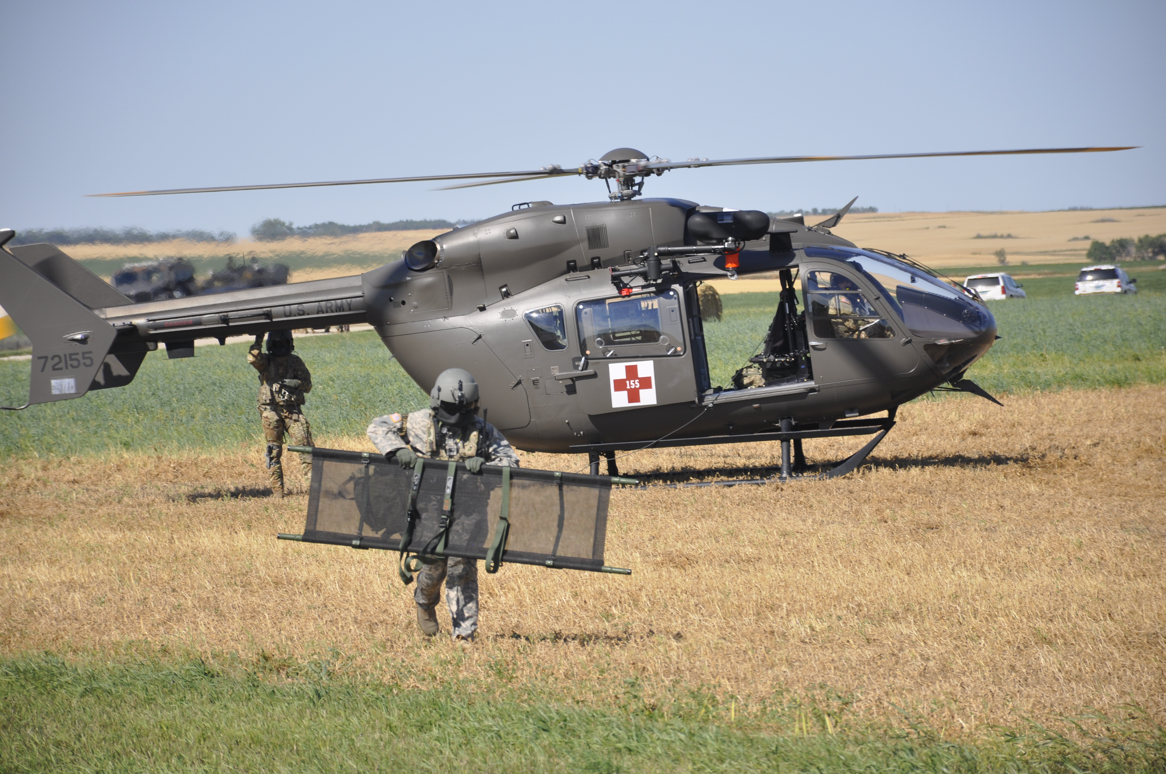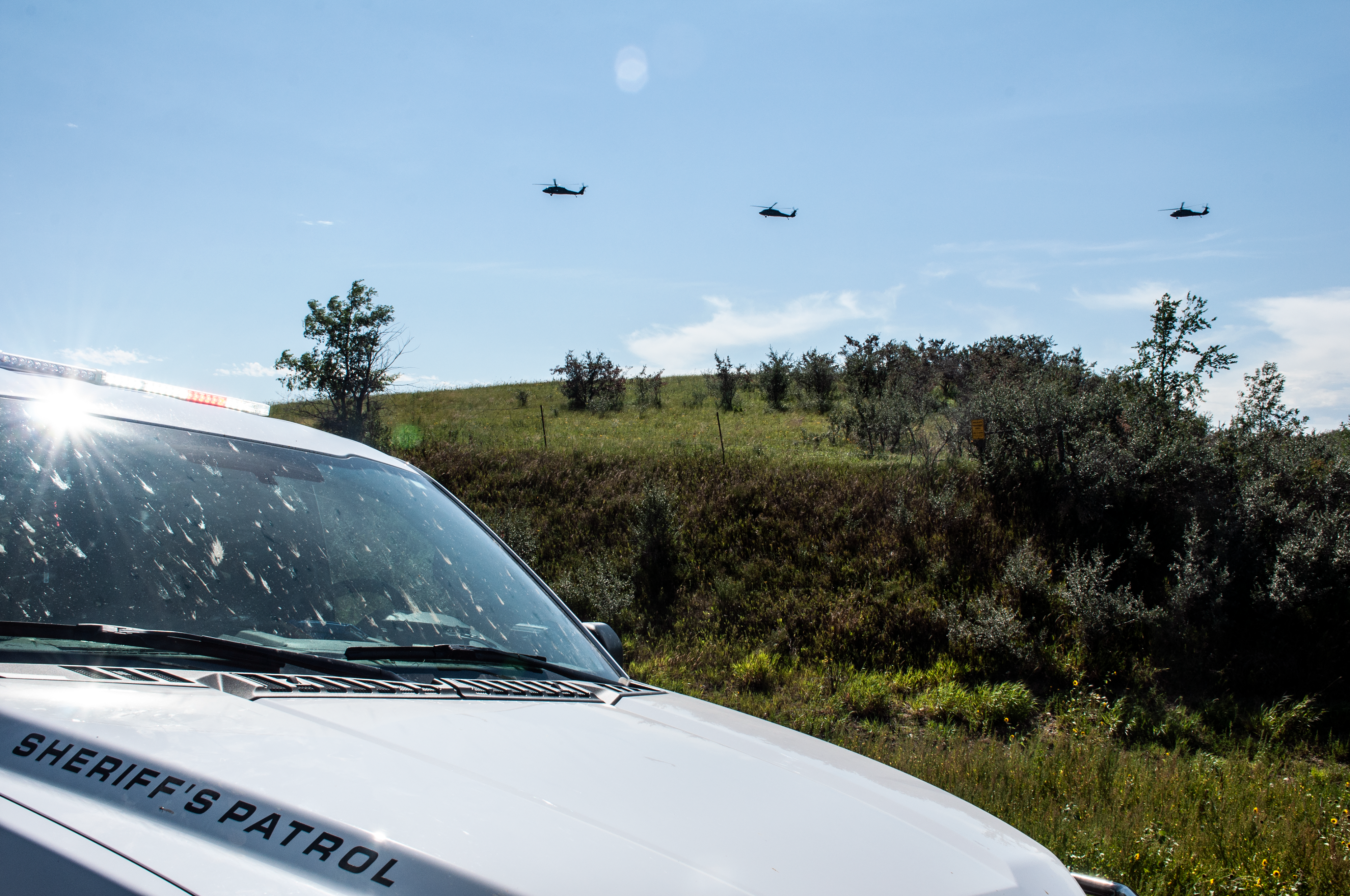 Soldiers of 1st Battalion, 112th Aviation Regiment (Security & Support) traveled north from Bismarck to hold a joint exercise with the McLean Sheriff's Office in McLean County, N.D. Aug. 10 to 12, 2020. Missions included aircraft surveillance and aerial MEDEVAC (medical evacuation). Two UH-72A Lakota helicopters participated in the MEDEVAC allowing two sets of flight medics to receive training in stabilizing and transporting a mannequin casualty assisted by deputy sheriffs who were present on the scene as part of the scenario. (U.S. National Guard story and photos by Bill Prokopyk, N.D. National Guard Public Affairs Office)