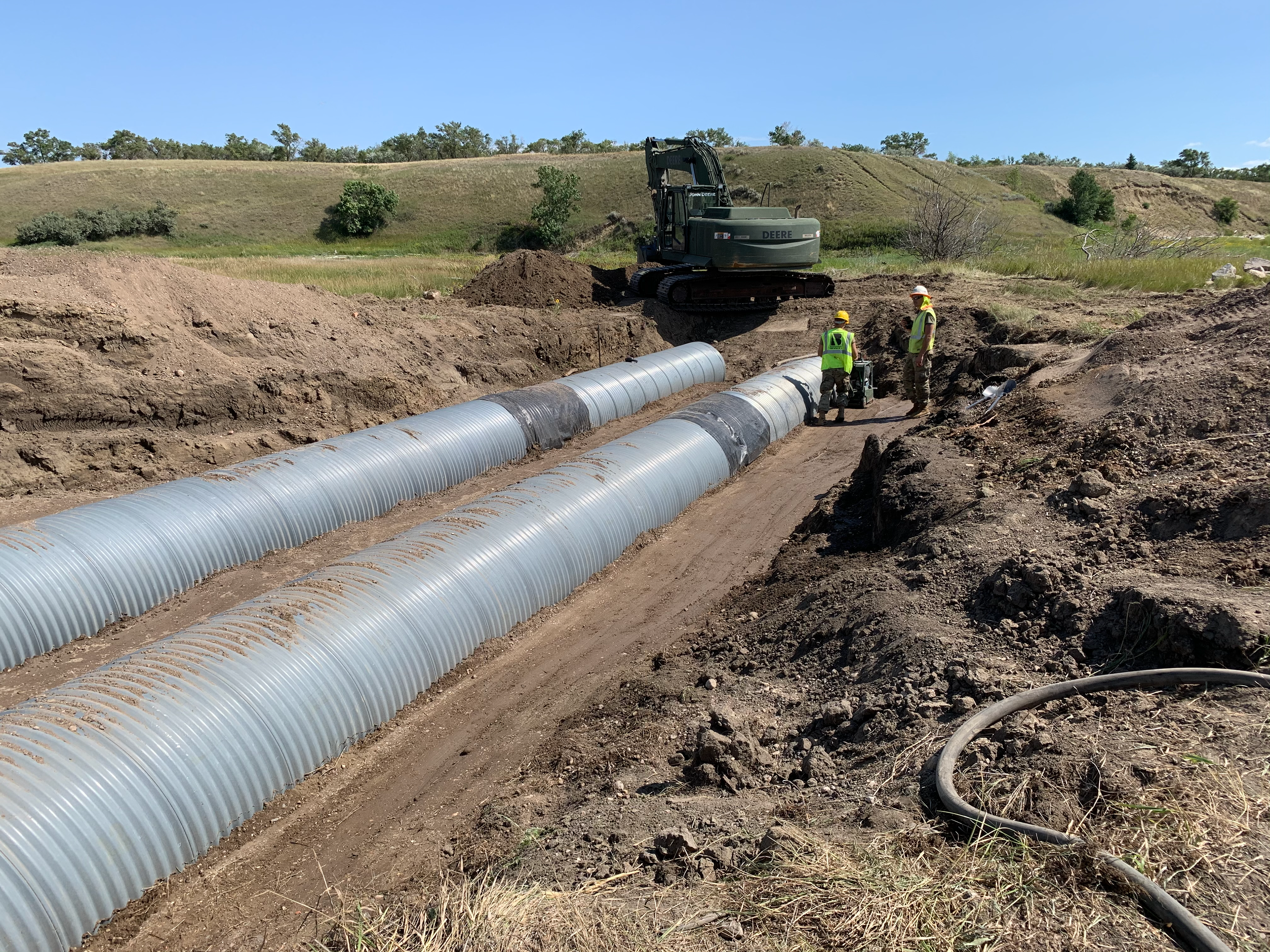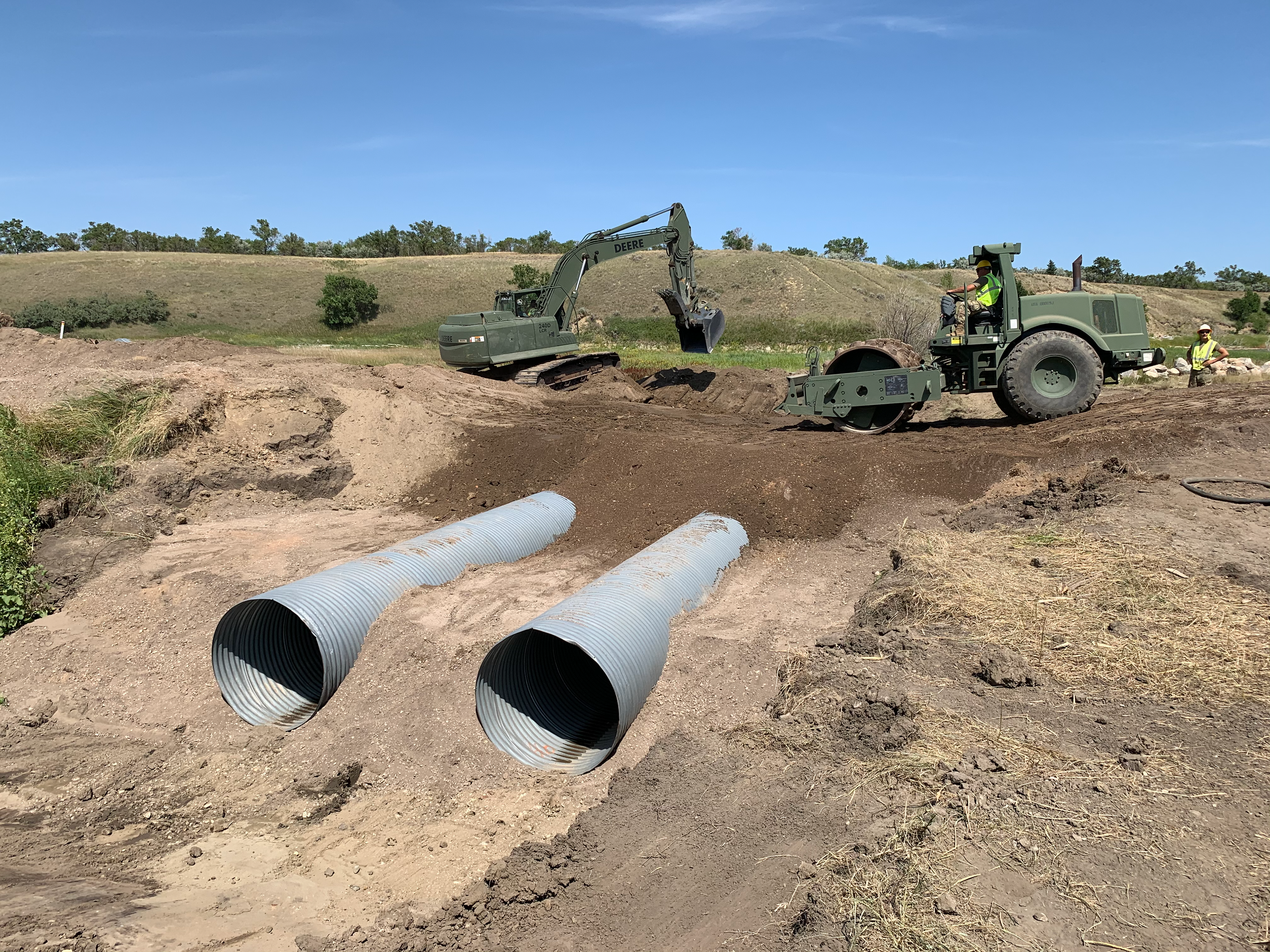 Soldiers of the 957th Engineer Company emplace two culverts to help control flooding at the Williston Local Training Area on Aug 3, 2020.