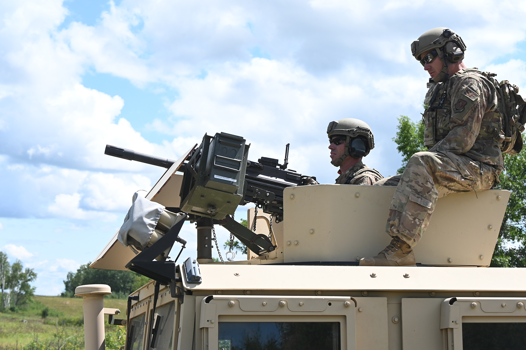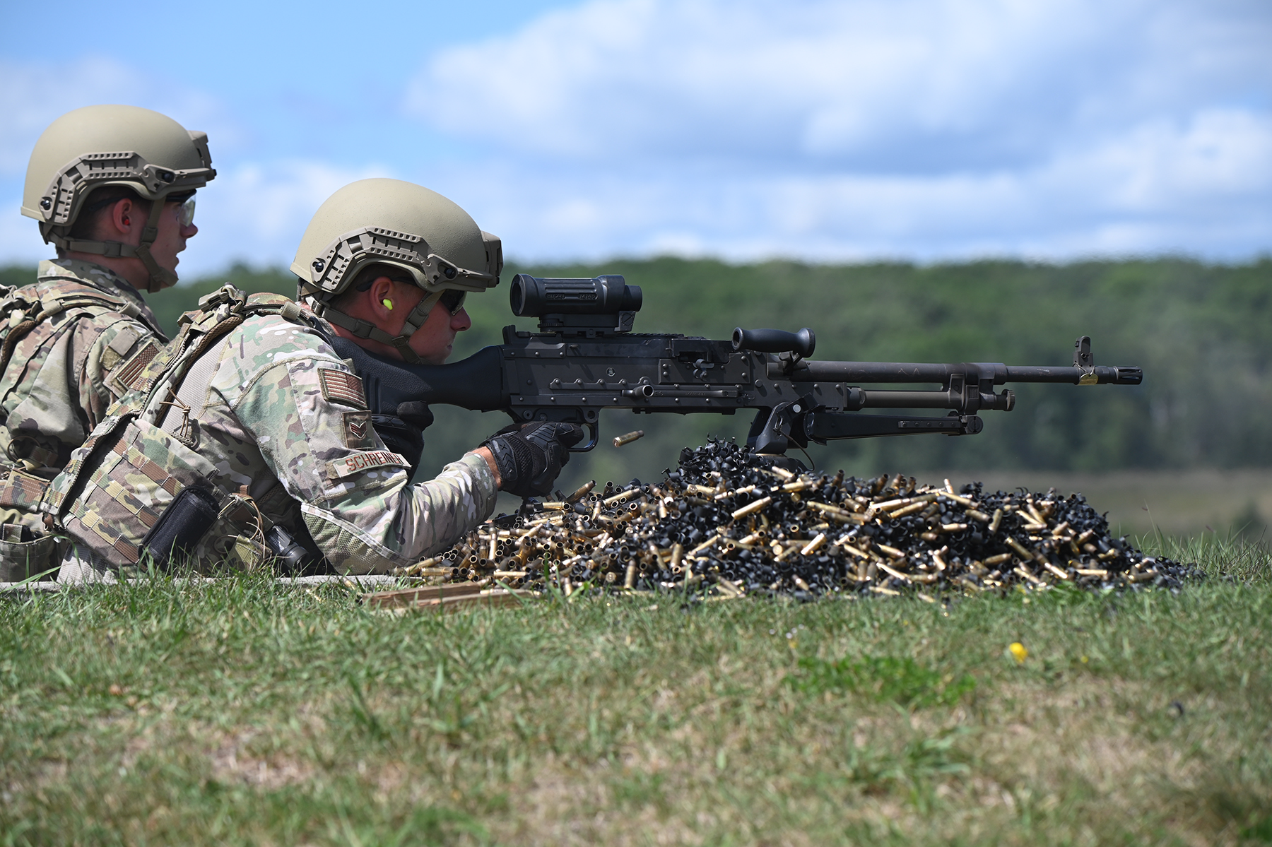 219th Security Forces Airmen Staff Sgt. Noe Arriaga fires a Mk 19 grenade machine gun (pronounced Mark 19) on the range as Airman 1st Class Keegan Link assists him at Camp Ripley Training Center on Aug. 3.