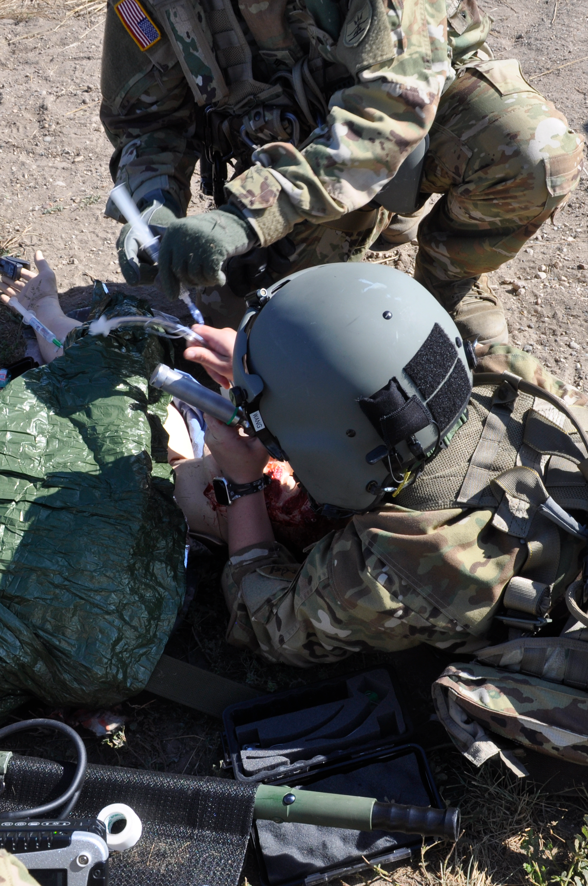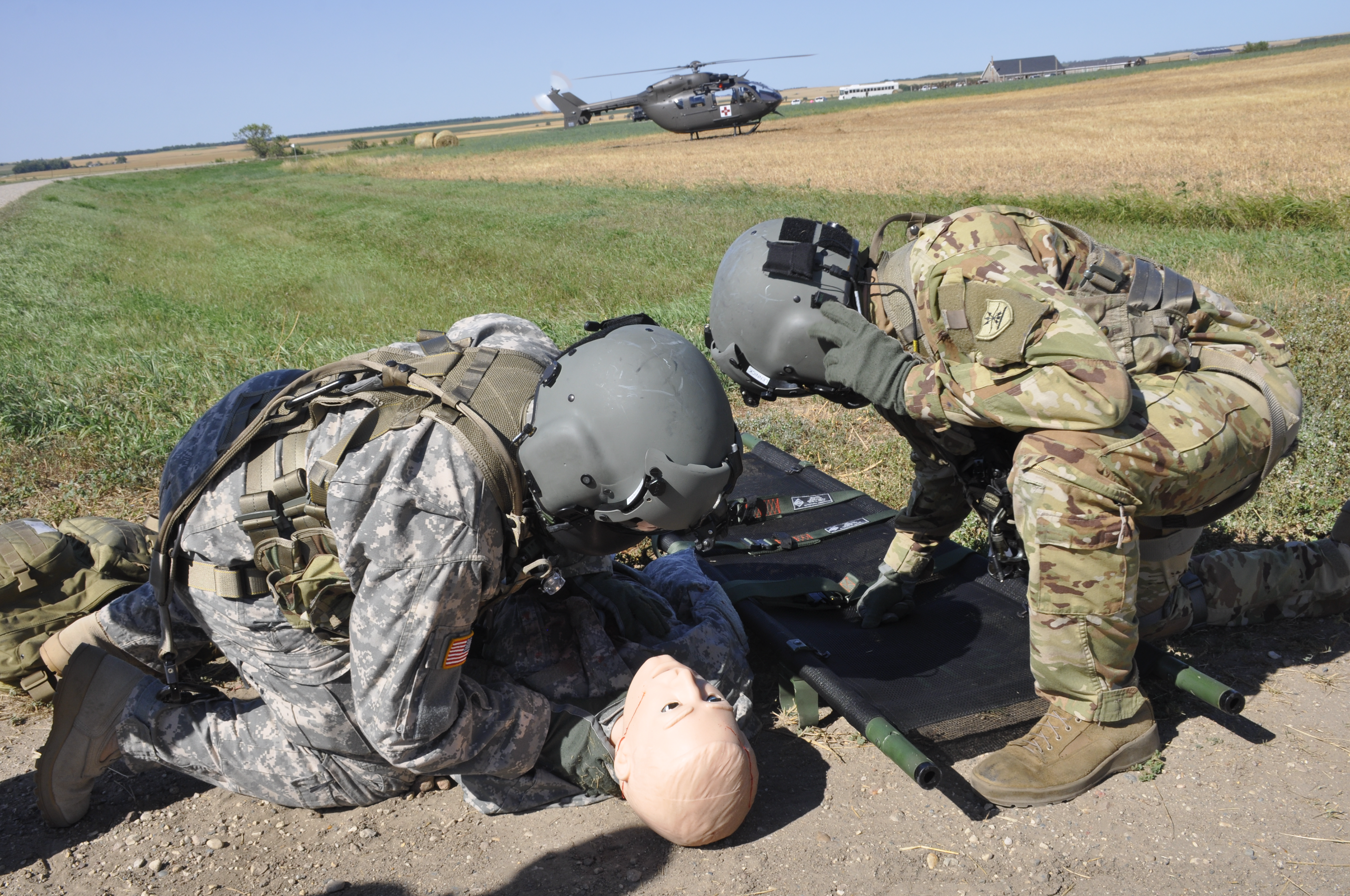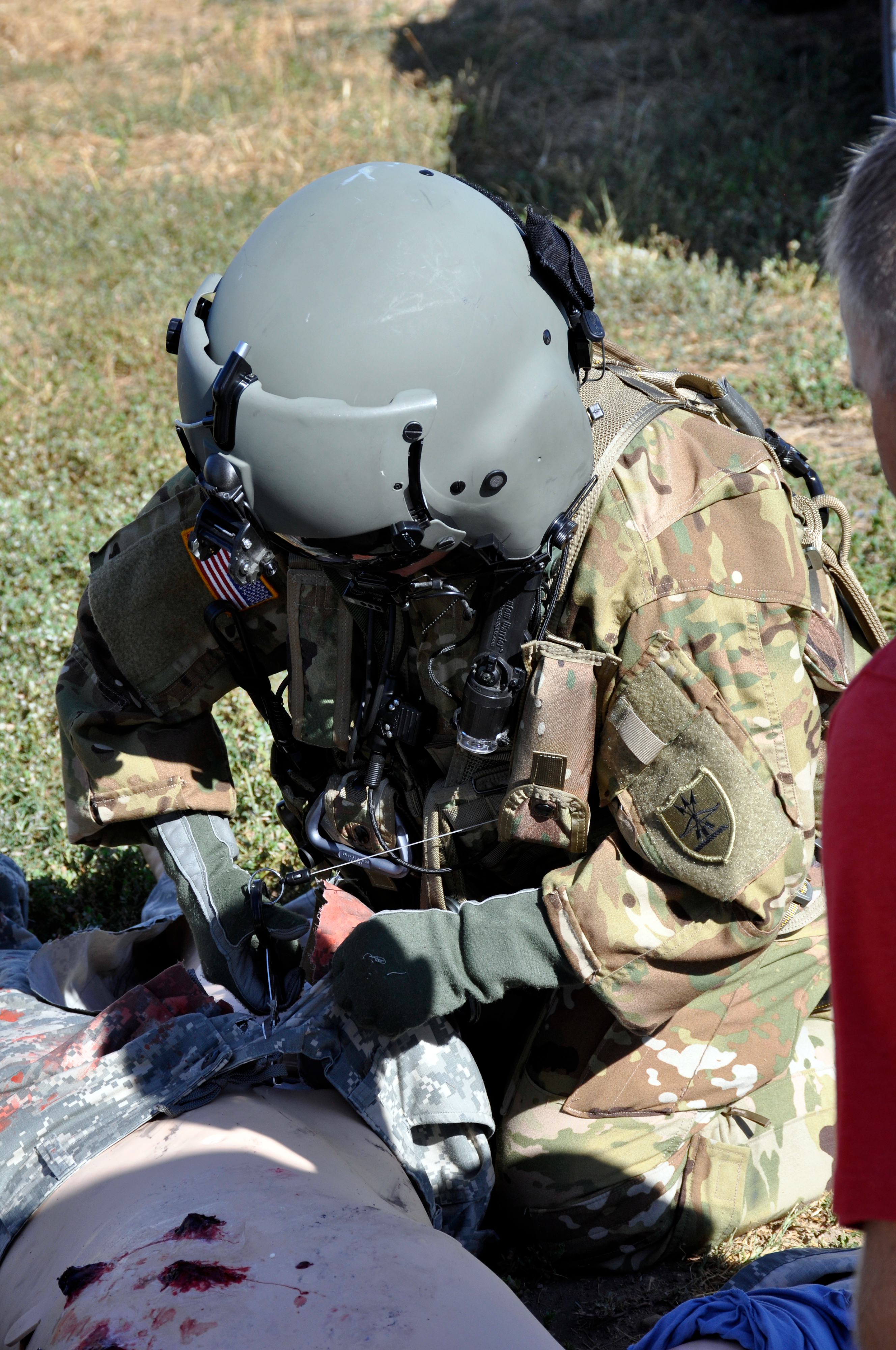 Flight medic Sgt. Robert White, left, stabilizes a mannequin casualty in preparation of aerial MEDEVAC on Aug. 12, 2020, while Sgt. Sean Lennick, Lakota helicopter crew chief looks on. Both Soldiers are members of Company D, 1st Battalion, 112th Aviation Regiment.
