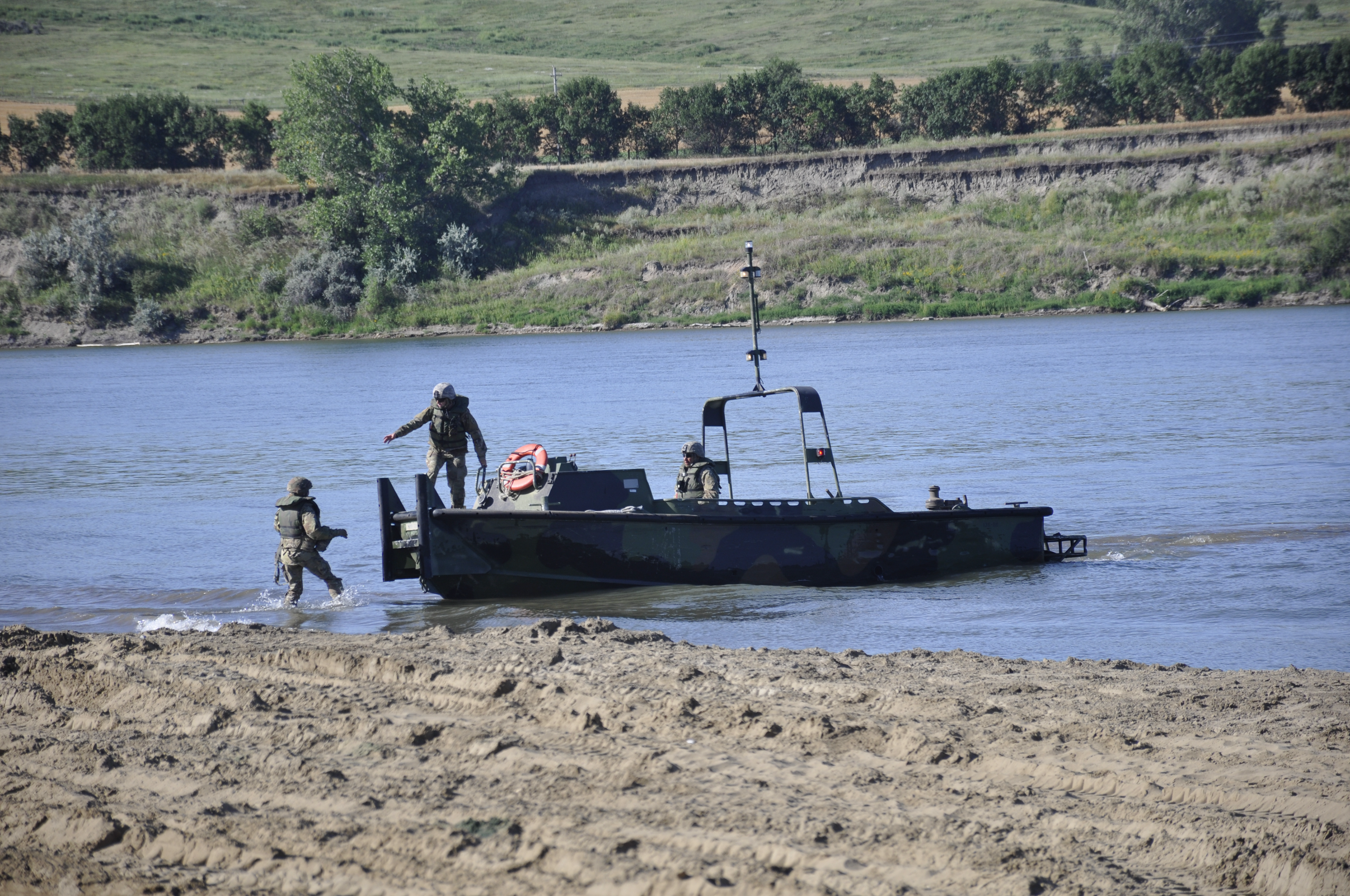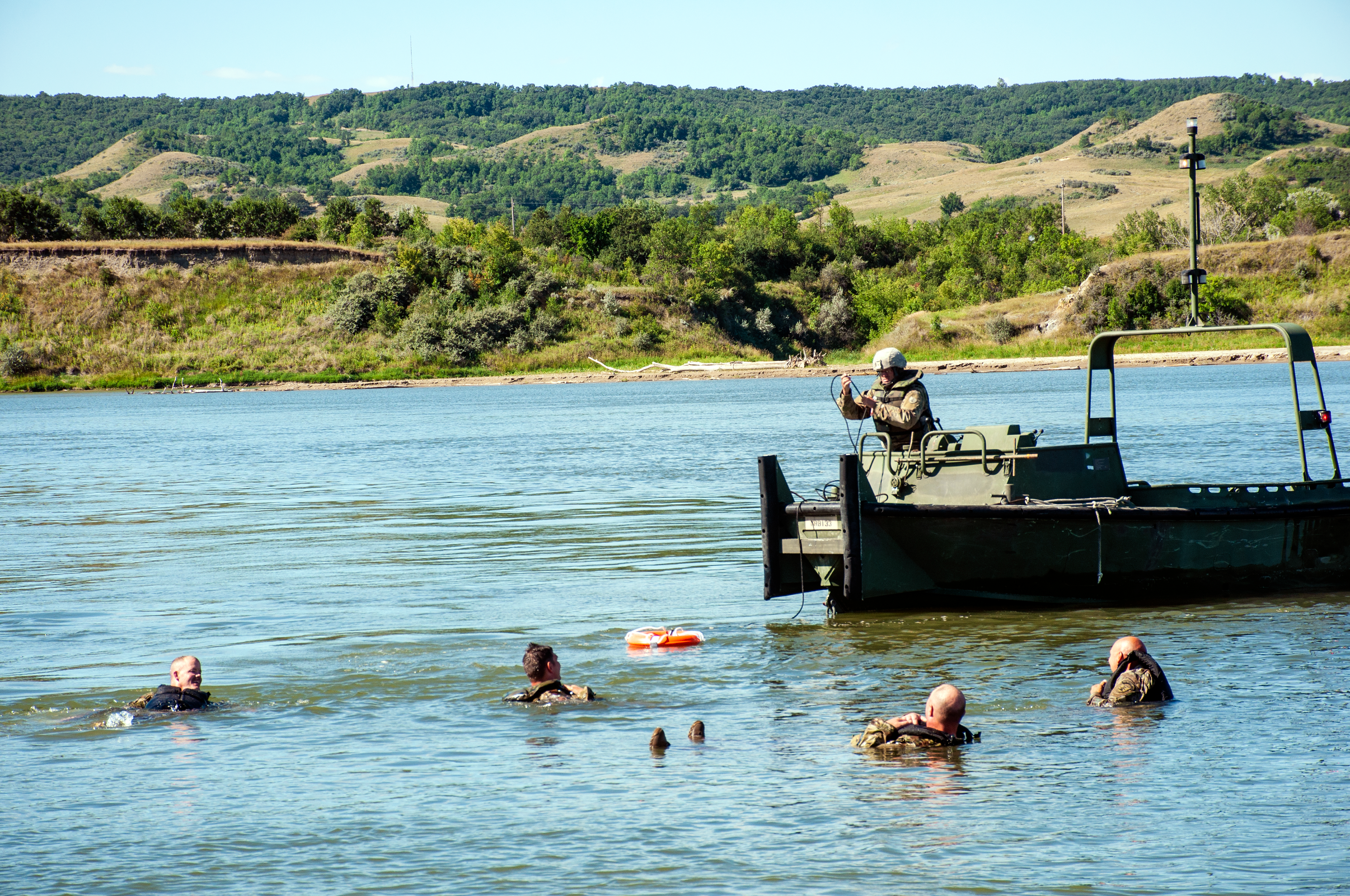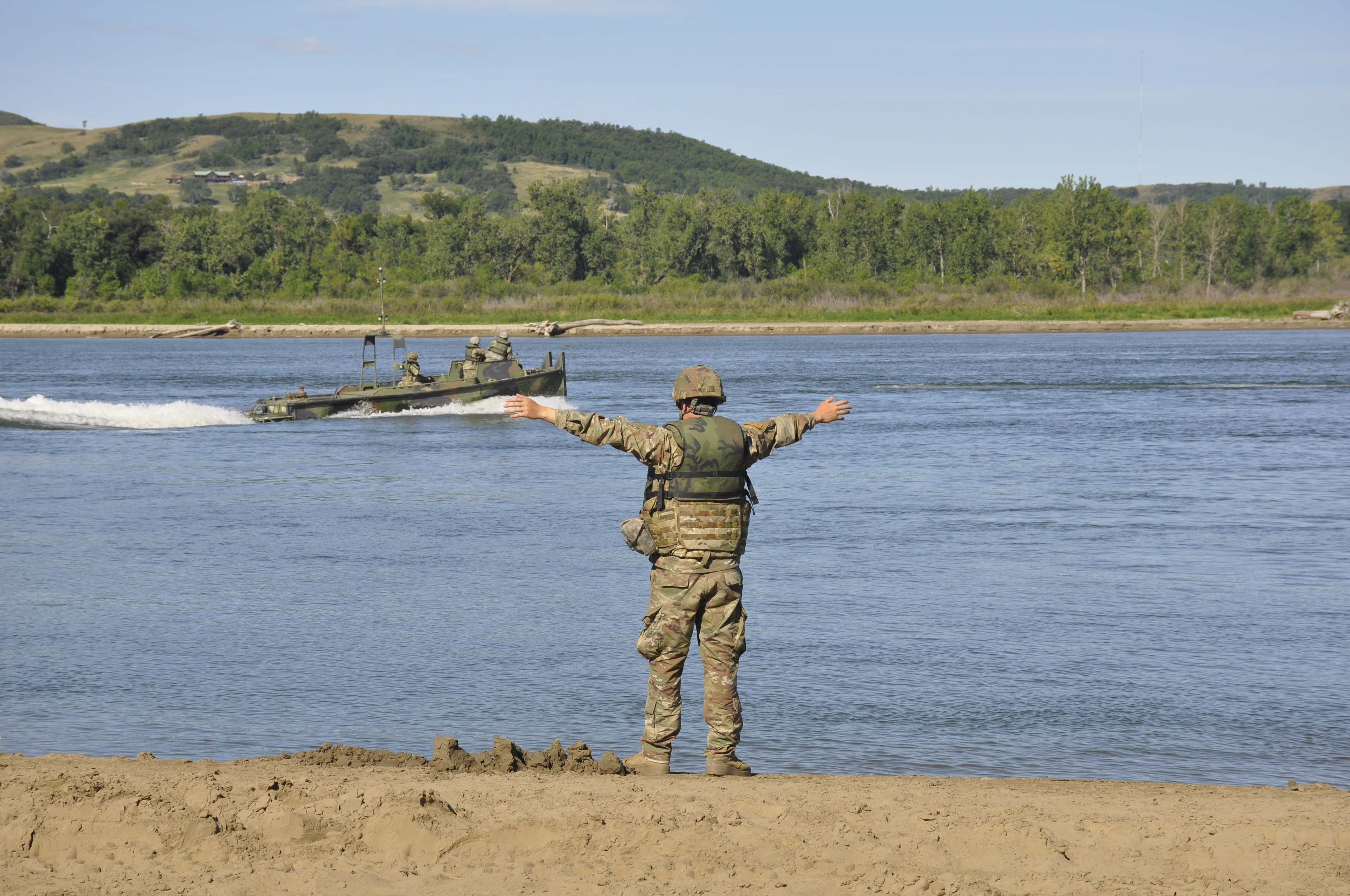 Soldiers of the 957th Engineer Company (Multi-role Bridge) prepare to launch their bridge erection boat on the Missouri River south of Bismarck on Aug. 10, 2020.