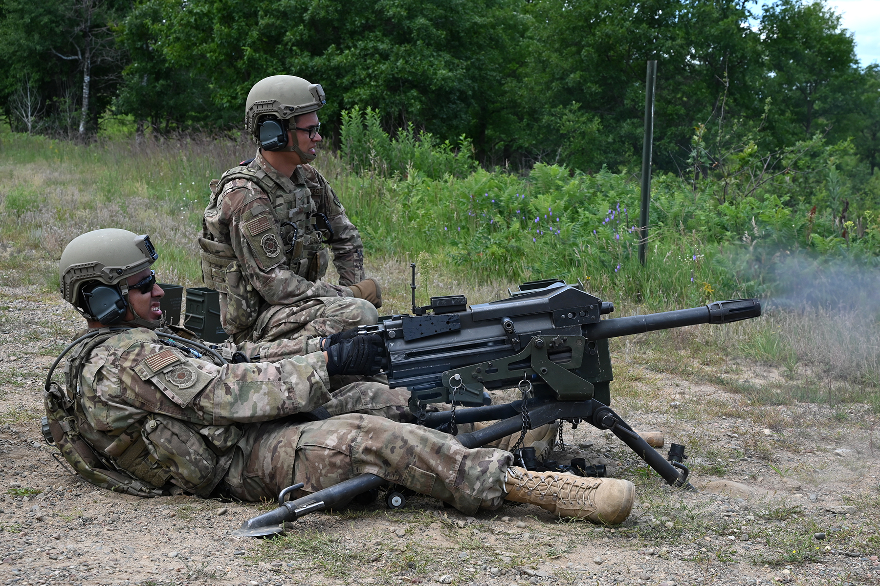 Senior Airman Brian Schreiner, of the 119th Security Forces Squadron, fires an M240 machine gun at Camp Ripley Training Center, Minn. on Aug. 3.