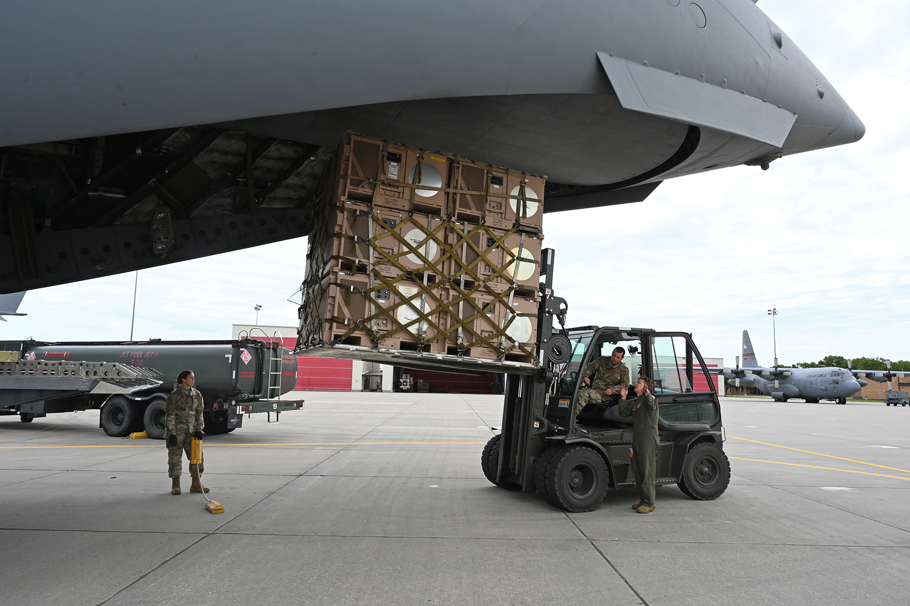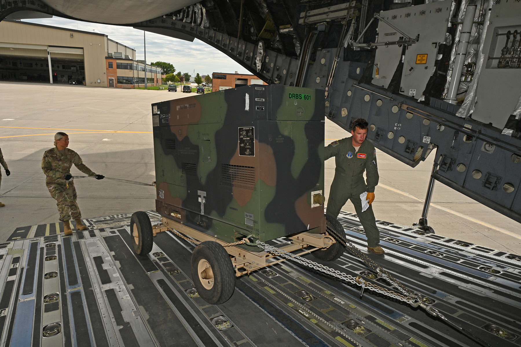 The 119th Civil Engineer Squadron's Disaster Relief Beddown Set (DRBS) equipment was loaded onto three C-17 Globemaster aircraft Aug. 6 to 11, and sent to its new permanent home with the Puerto Rico Air National Guard. The DRBS is a portable ‘tent city’ designed to house 150 people. The package includes showers, laundry facilities, latrines, water purification, generators and power distribution generators. It is packed into containers for quick transportation and used in areas devastated by natural disasters. This DRBS equipment was last used for Hurricane Irma and Hurricane Maria relief efforts in the U.S. Virgin Islands. Two of the C-17 aircraft arrived within a few hours of each other. It’s a rare occurrence to have two aircraft this large to be parked simultaneously on the flight line. While the C-17's were still at the air base, a C-130 Hercules from the Ohio Air National Guard's 179th Airlift Wing arrived to drop off a group of civil engineers for training at the 119th Wing's regional training site. (U.S. Air National Guard story and photos by Senior Master Sgt. David H Lipp)