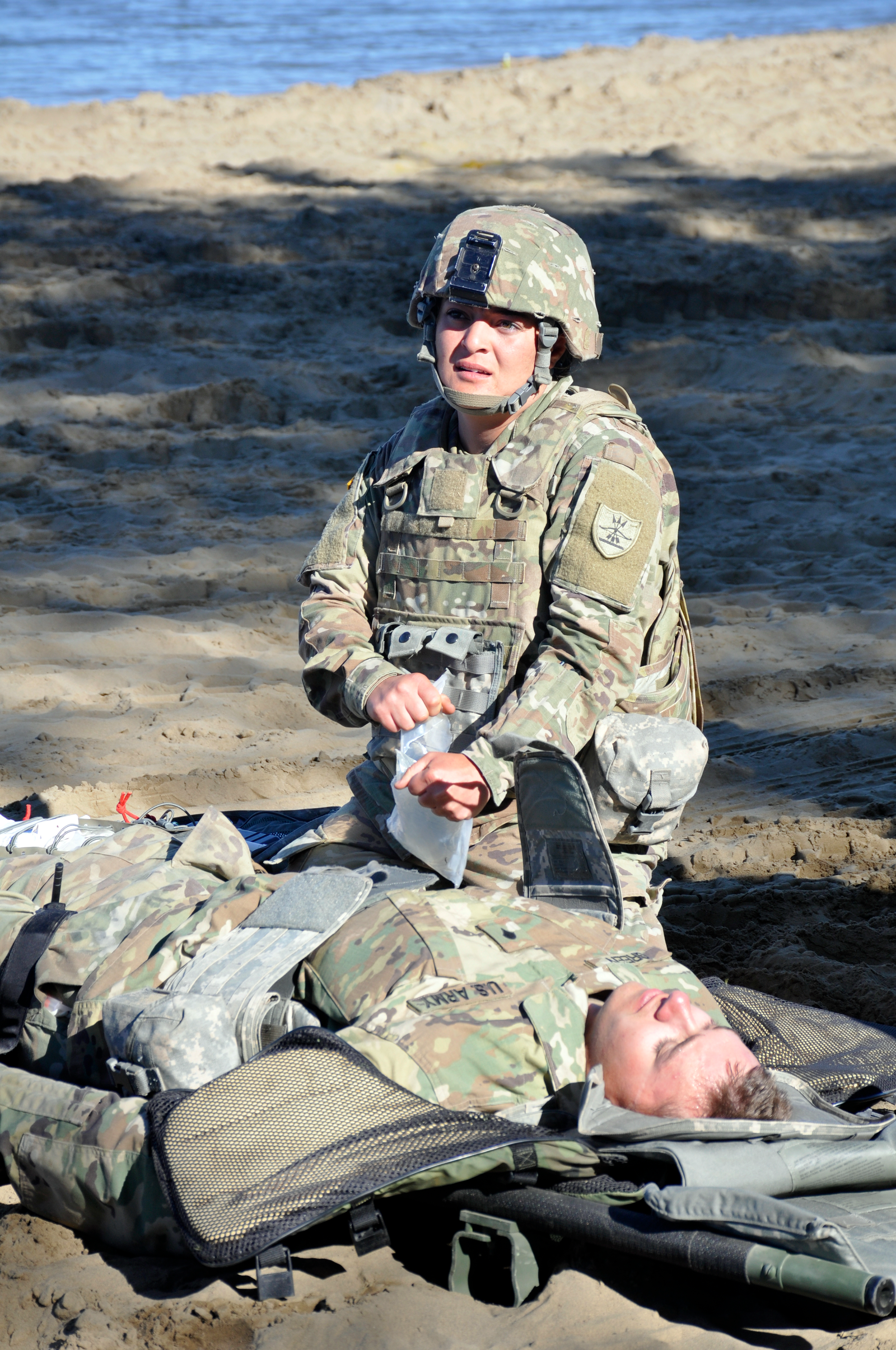 Soldiers of the 957th Engineer Company (Muti-role Bridge) assemble their Improved Ribbon Bridge (IRB) into a six-bay raft on the Missouri River south of Bismarck, N.D. on Aug 10, 2020. Top photo: Soldiers of the 957th Engineer Company evacuate a simulated casualty during medic training along the shore of the Missouri River during annual training on Aug. 10, 2020. (U.S. Army National Guard story and photos by Bill Prokopyk, N.D. National Guard Public Affairs Office)