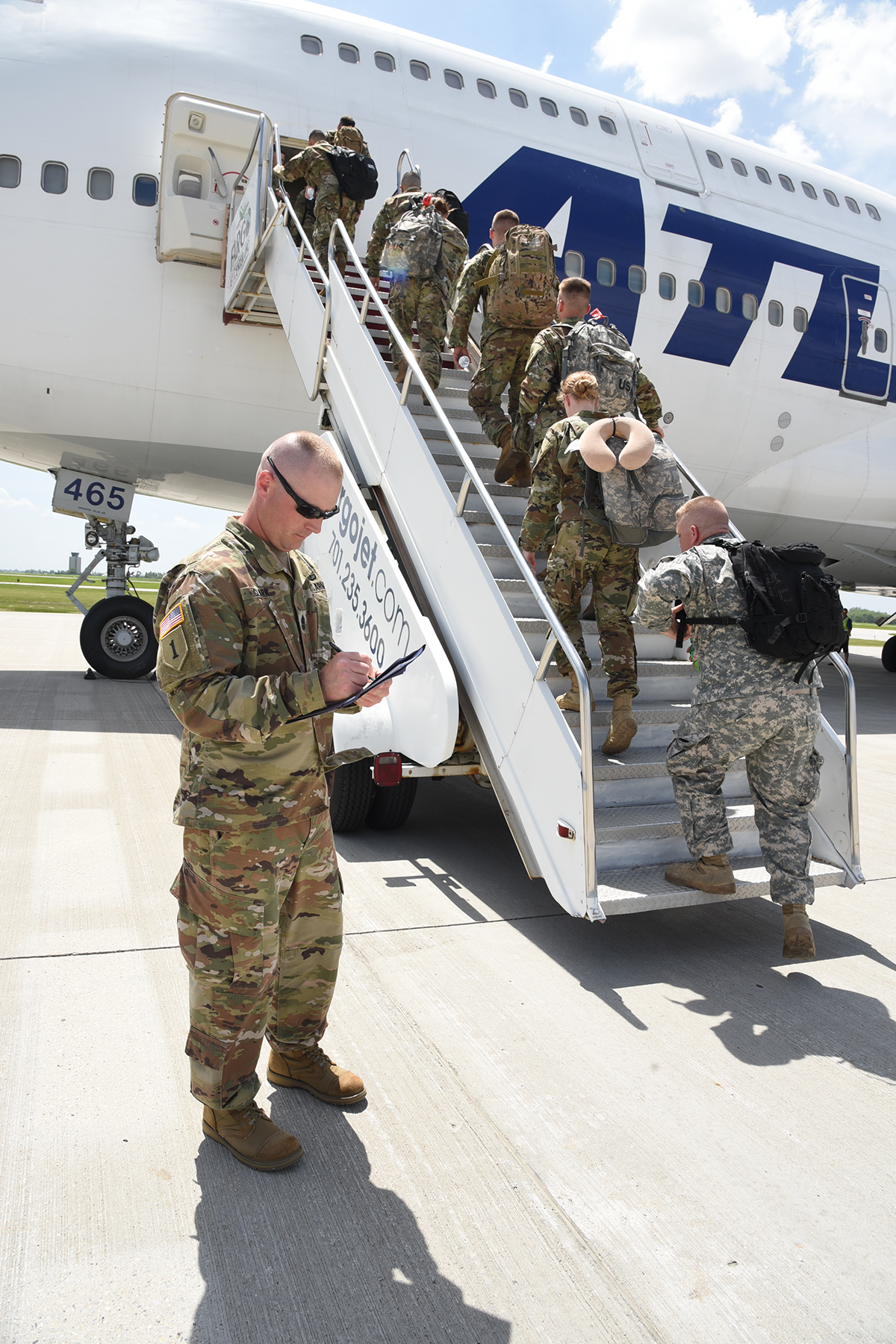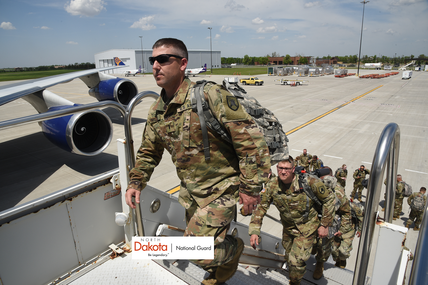 About 400 Soldiers from the 141st Maneuver Enhancement Brigade (MEB) and subordinate units, left North Dakota for Romania to participate in exercise Saber Guardian 2019. Soldiers will conduct convoy and mobility operations, sustainment support and other field training during the exercise. SB19 is co-led by Romanian Land Forces and U.S. Army Europe and takes place from June 3-24 at various locations in Bulgaria, Hungary and Romania and is designed to improve the integration of multinational combat forces. (Top photo: Chief Warrant Officer 3 Chedric Phillips, of the 141st MEB, boards charter aircraft bound for Romania Friday in Fargo.)