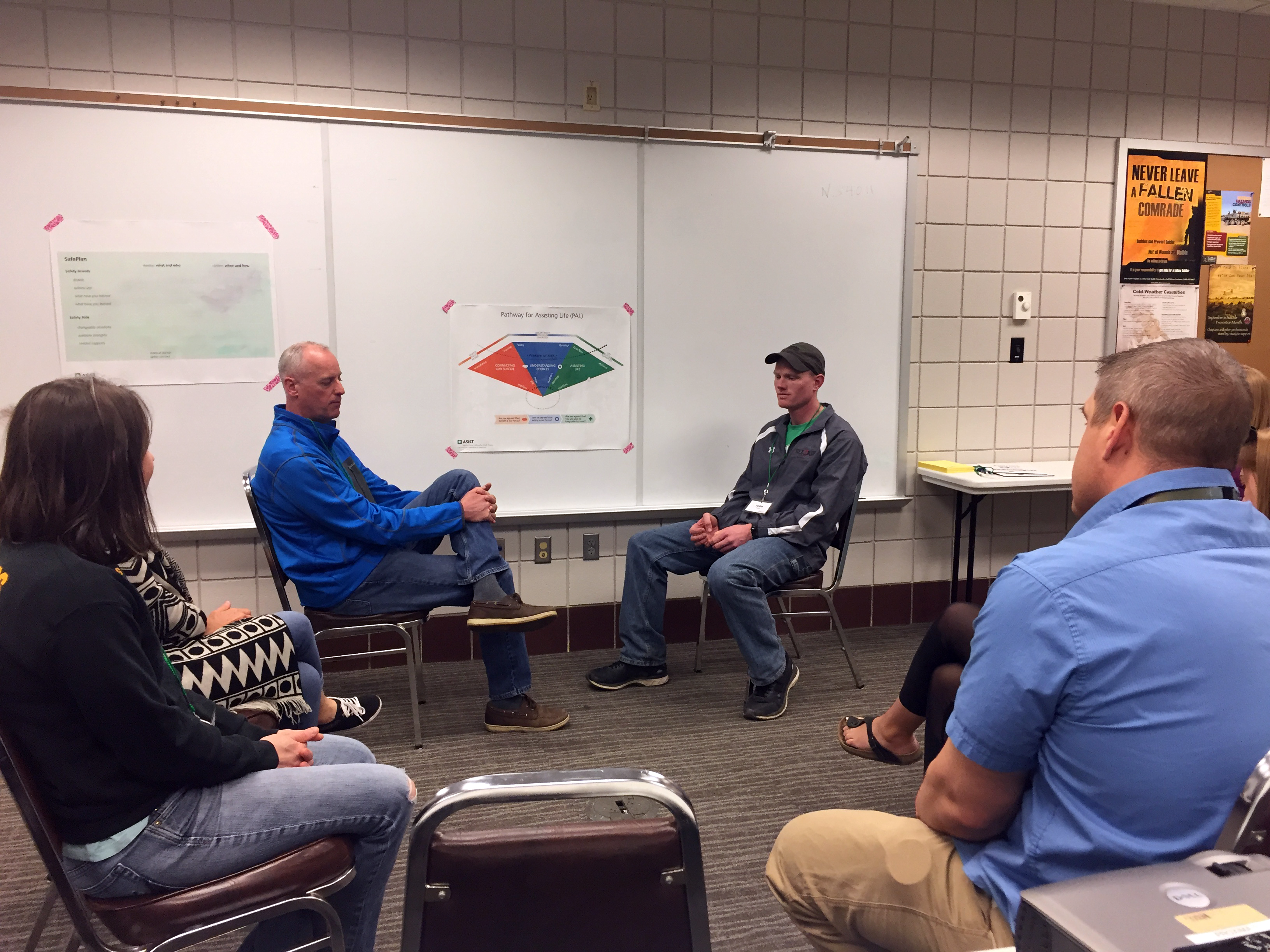 Chief Warrant Officer 5 Bob Axman (left) and Sgt. 1st Class Adam Walsvik conduct an exercise. Participants conduct role playing exercises which help them work through the Pathway for Assisting Life (PAL) model during a crisis intervention. The PAL model is essentially a map of an intervention and starts with exploring invitations (warning signs) and ends with a plan for safety. The PAL model is the core of ASIST training.