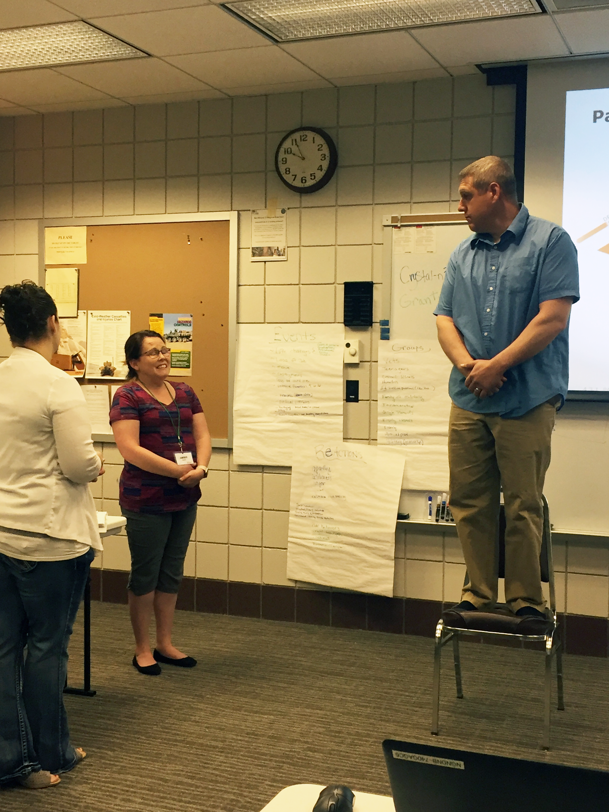ASIST facilitator Sgt 1st. Class Grant Semchenko pretends he's threatening to jump off of a bridge while family member Amber Mattson tries to talk him into abandoning his plans as part of an exercise. During this particular role play, participants are invited to use the skills of ASIST and the PAL model to talk the person down from the bridge. This practical exercise is one of four the ASIST course uses to test participants knowledge of what they've learned during the workshop.