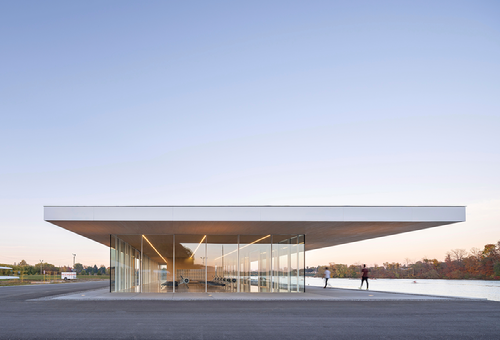 Built on a gentle promontory, the NCRC is a beacon guiding racers along the watercourse and a new assembly point at the heart of the island, drawing athletes and their supporters inward. The entire facility rests on 15-meter-long screw piles that extend down to bedrock. Its form is engendered by the roof, which is designed with an innovative mass timber system utilizing Canadian glue-laminated and cross-laminated timber products and held aloft by a light steel column structure and a centralized service core. The roof supports a photovoltaic system above and defines protected indoor and outdoor spaces below with deep overhangs. The biased and overhanging roof, extensive glazing, operable sliding doors, and steps to the racecourse give the NCRC an expansive and striking visual identity from across Martindale Pond.