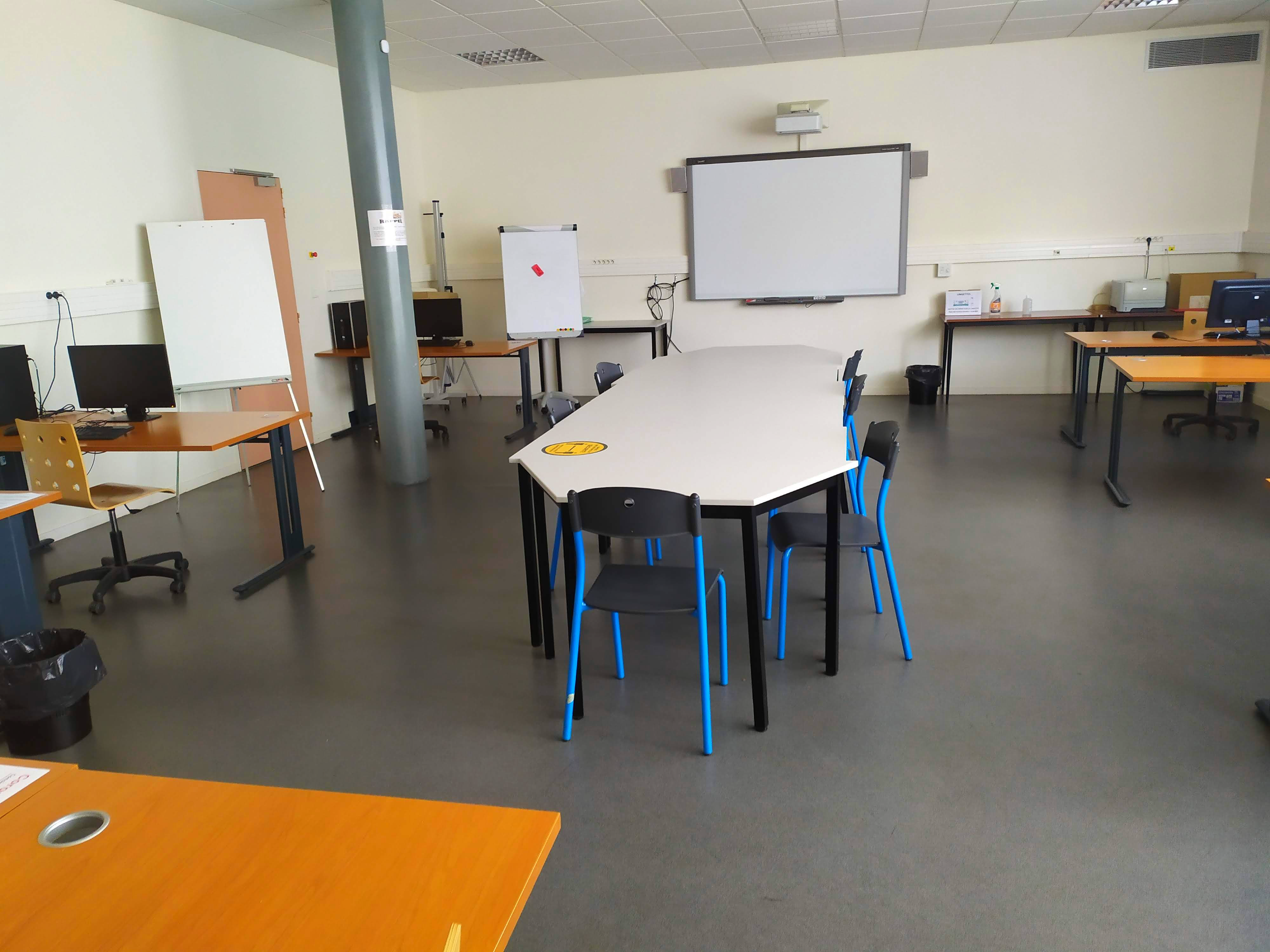 Une salle informatique pour des TP. Réservation obligatoire par un enseignant. 15 PC disponibles. Capacité maximale de 30 étudiants.