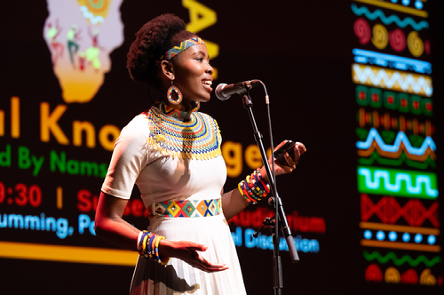 African Storytelling Fiesta: A journey into African Knowledges. Left photo: Student Similoluwa Adefioye, MA in International Education & Development, delivers her first poetry performance in the UK. Right photo: African drumming.