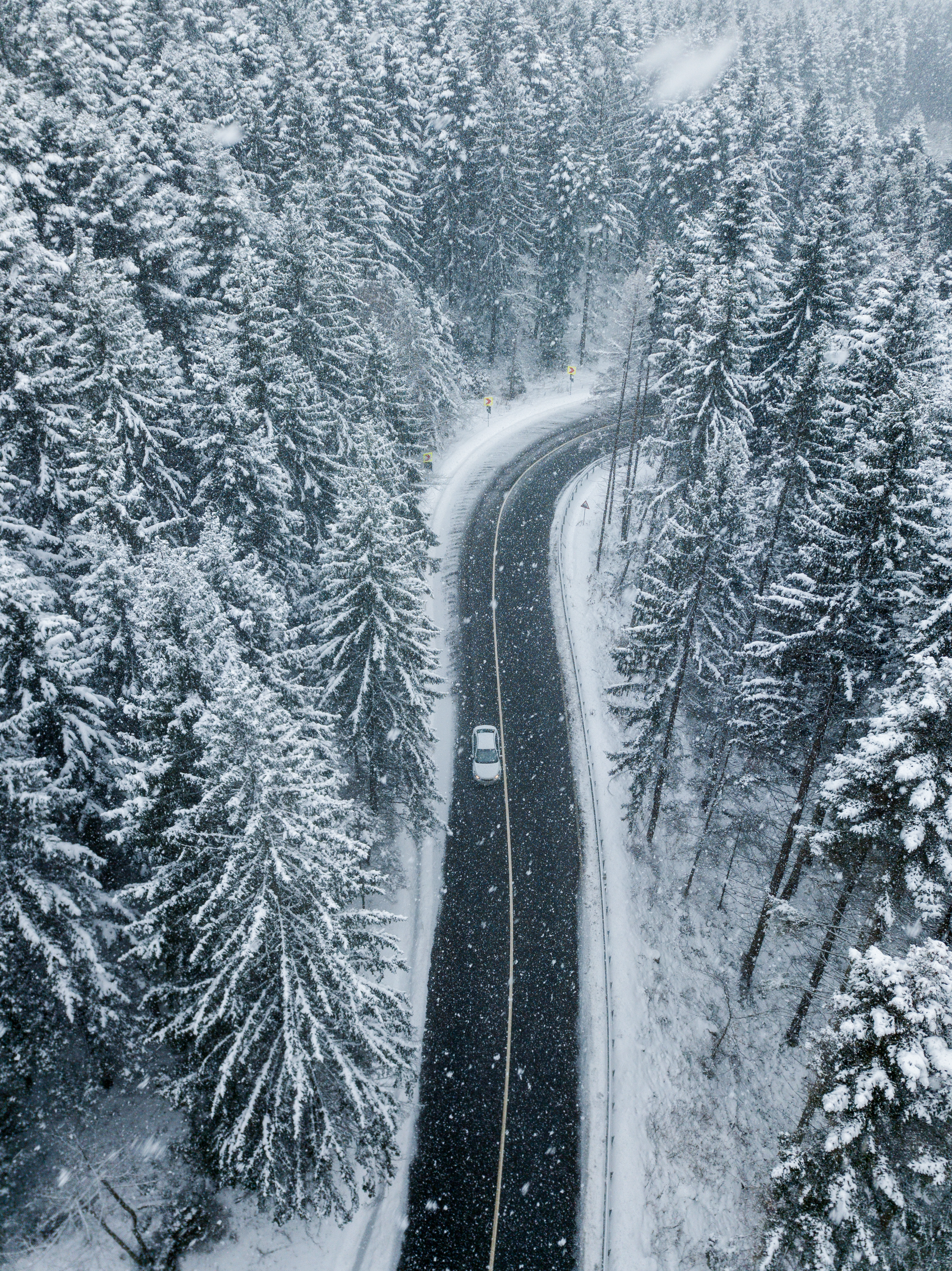 Created with an image by szaboerwin - "White car drives empty road in forest in the cold winter. Tourists on road trip cruising through the idyllic snow covered countryside and woods."