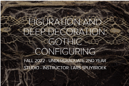 One of five sophomore studios, each focused on "the problem of decoration": ornamentation in architecture disappeared with the introduction of the twentieth century and the Modernist style. Despite this, a resurgence in the art of ornamentation has begun, and these eight-phase sophomore studios seek to gain inspiration from past design methodology: Gothic configuring, Celtic interlacing, Art Nouveau's tendriling, Islamic tesselating, and Indian Kolam interlacing. These decorative figures manifest themselves into finalized structures at the end of the course, and this page focuses on the Gothic configuration led by Lars Spuybroek.