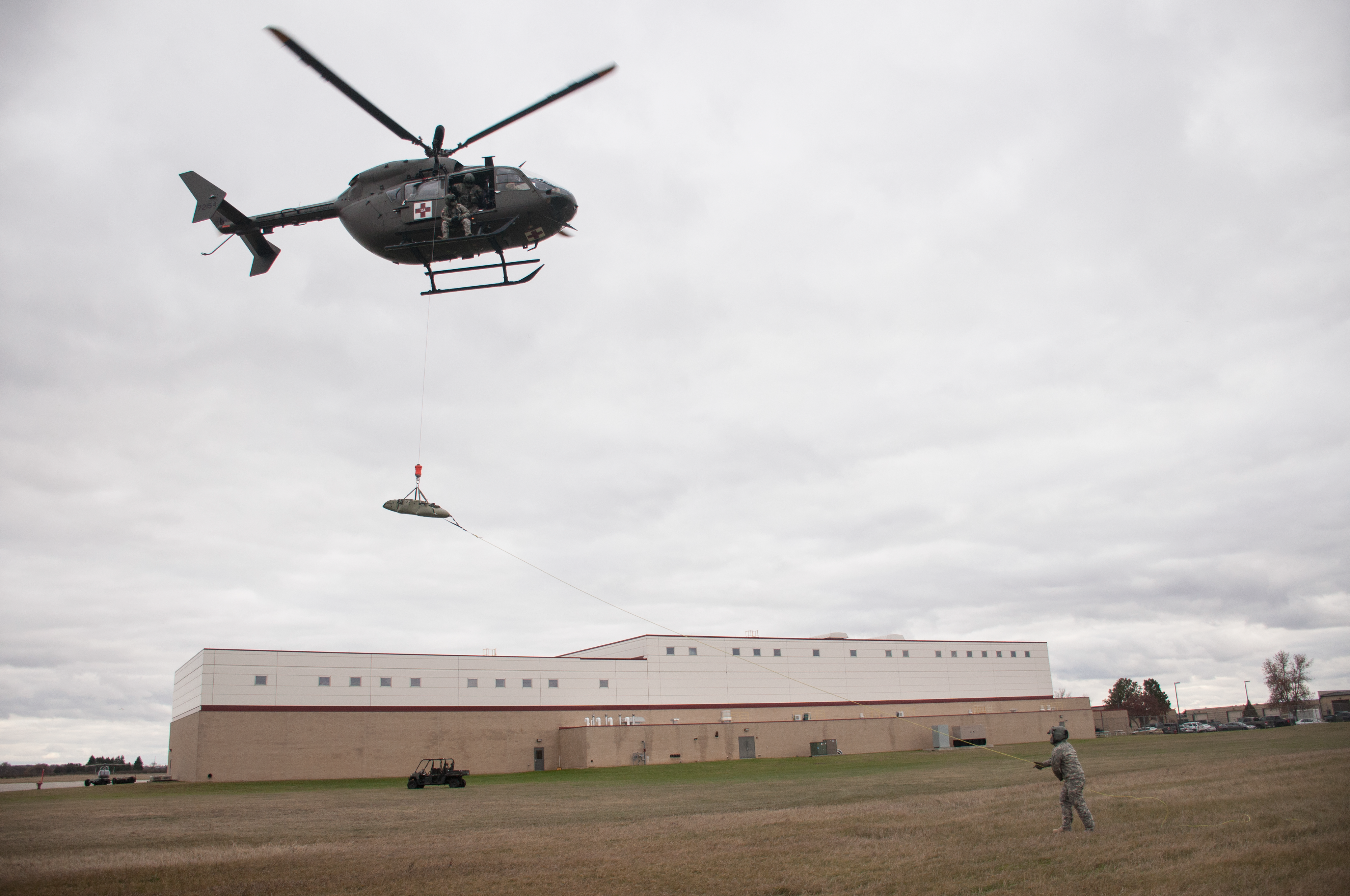 Flight medic Sgt. Robert White guides a litter being lifted into a hovering UH-72A Lakota helicopter during MEDEVAC hoist training Oct. 24 in Bismarck.