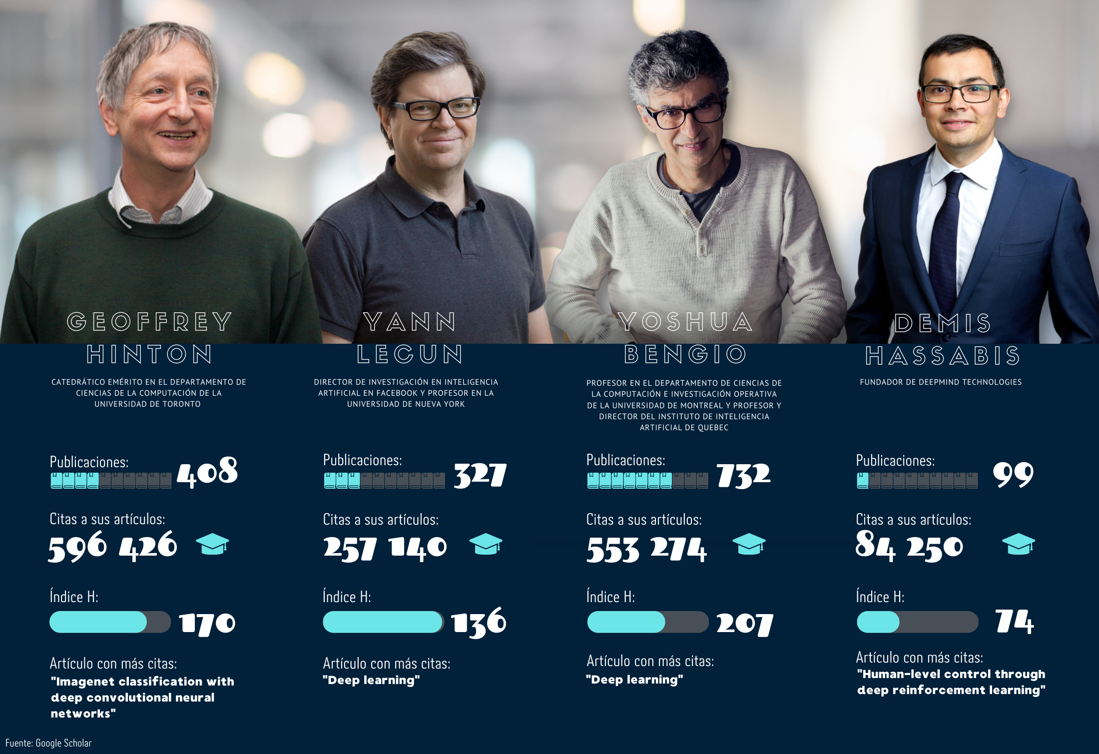 Geoffrey Hinton, Yann LeCun y Yoshua Bengio son considerados los padres de una técnica esencial de la inteligencia artificial, el deep learning o aprendizaje profundo, el cual se basa en el uso de redes neuronales para el reconocimiento de voz, la visión por ordenador y el procesamiento del lenguaje natural, y ha logrado avances en campos tan diversos como la percepción de objetos y la traducción automática. Estas redes neuronales pretenden imitar el funcionamiento del cerebro humano, utilizando algoritmos que convierten el proceso biológico del aprendizaje en secuencias matemáticas. Se trata de que la máquina aprenda de su propia experiencia