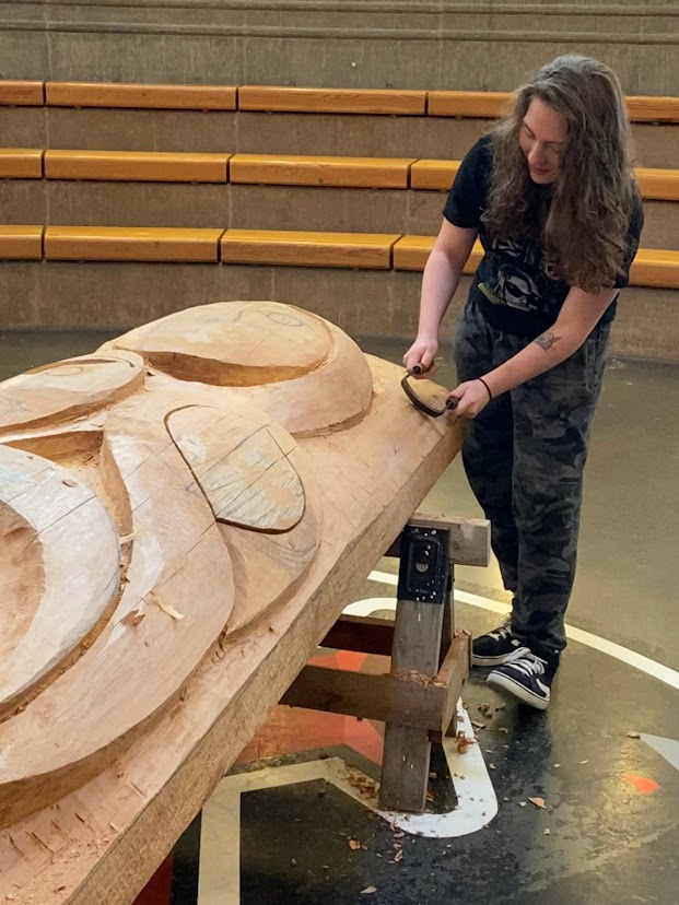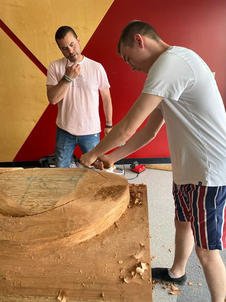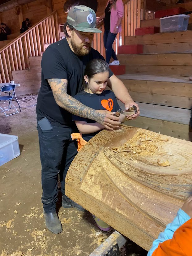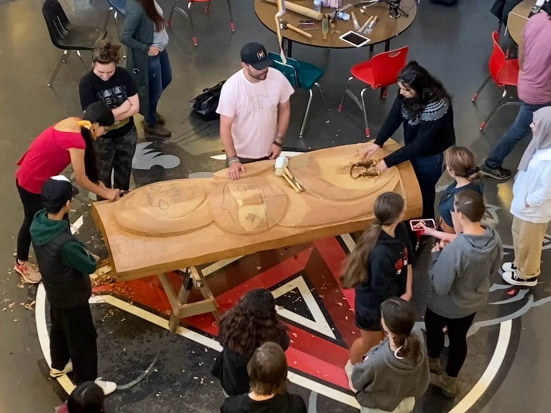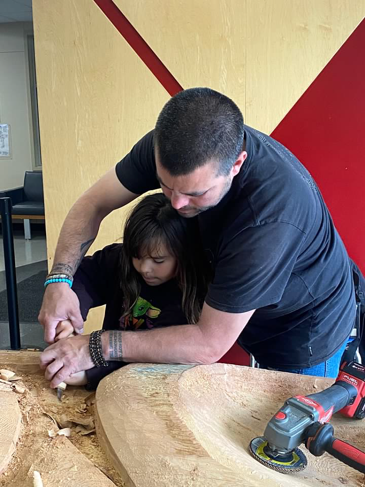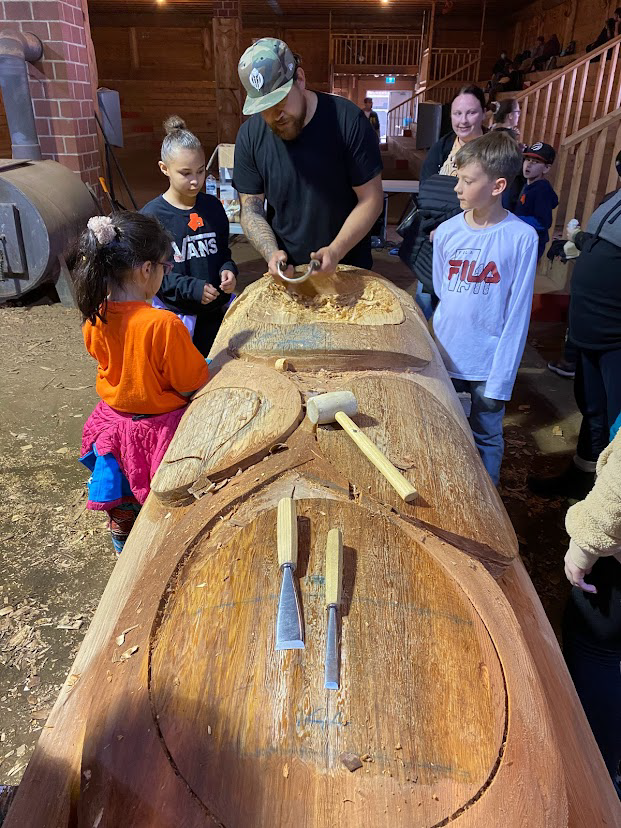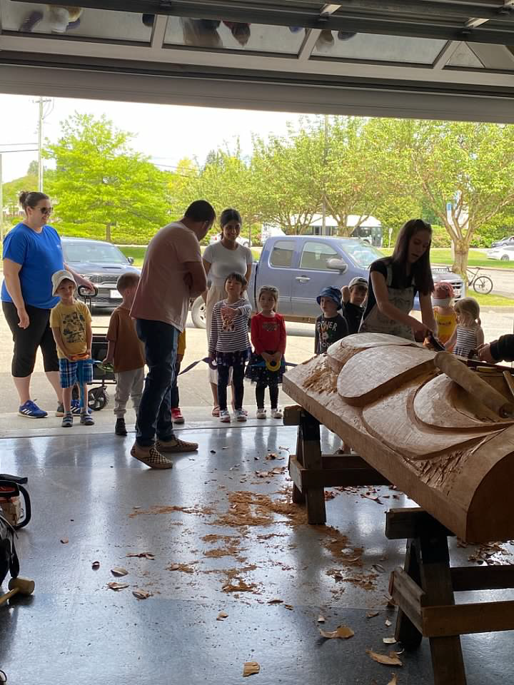 Raphael Silver and Kelsey Ned engaged the public and the schools with the Education Welcome Figure: Semá:th First Nation Longhouse, Havard Deeper Learning Dozen, Wa;cipi C'ante Was'te Yuhapi Powwow, Bakerview Centre for Learning, Yale Secondary, Abby Senior Secondary, and Mouat Secondary. In doing so, they engaged with, inspired, connected to, and shared knowledge and carving experiences with many youths and adults.