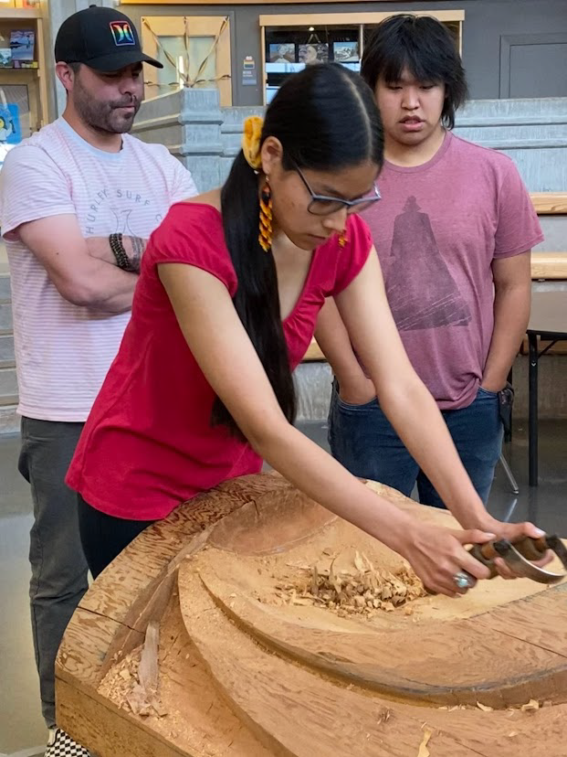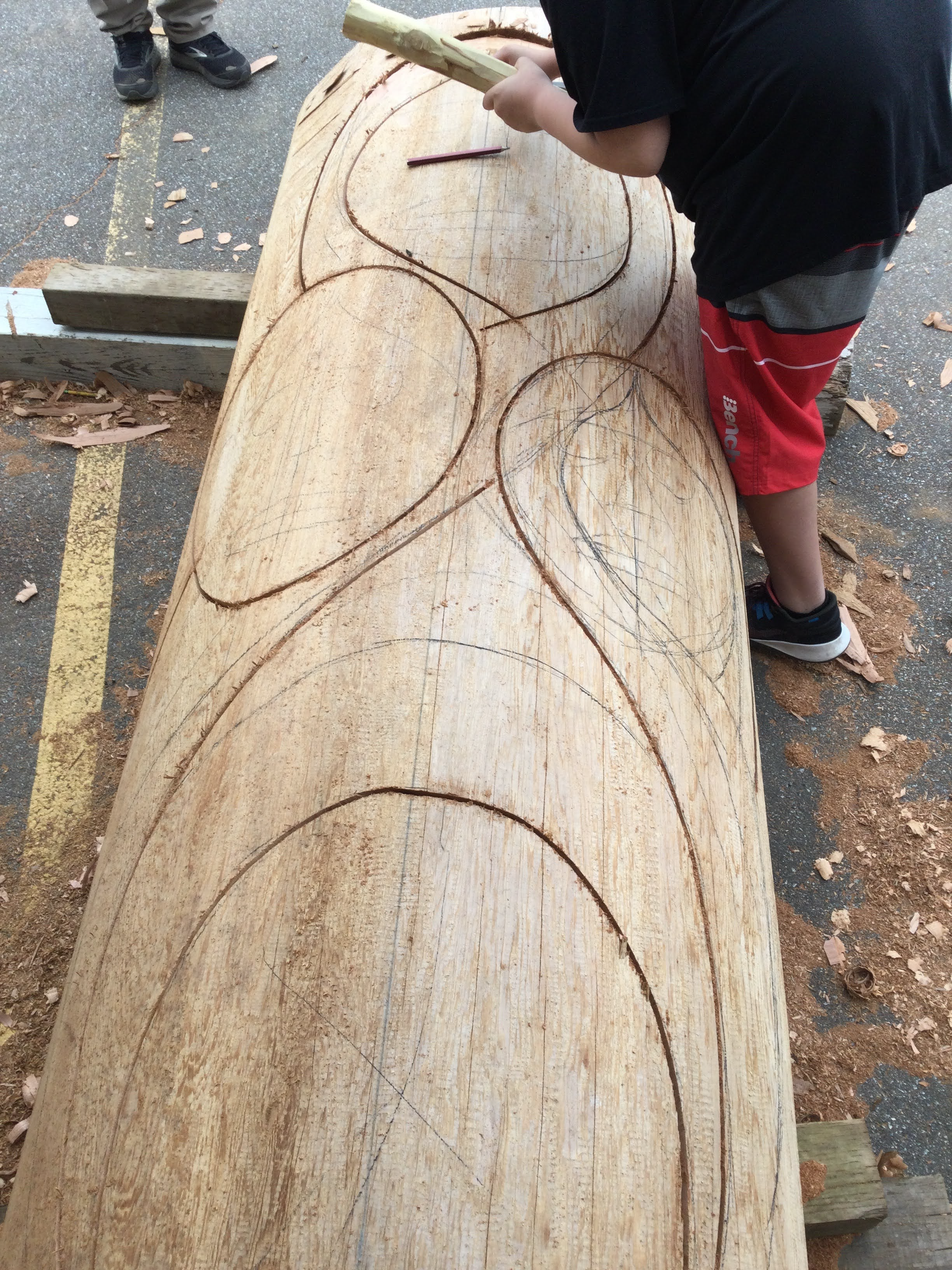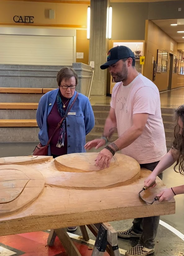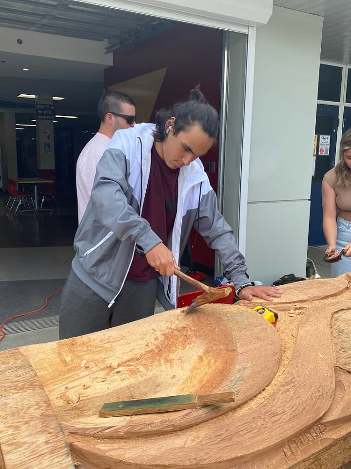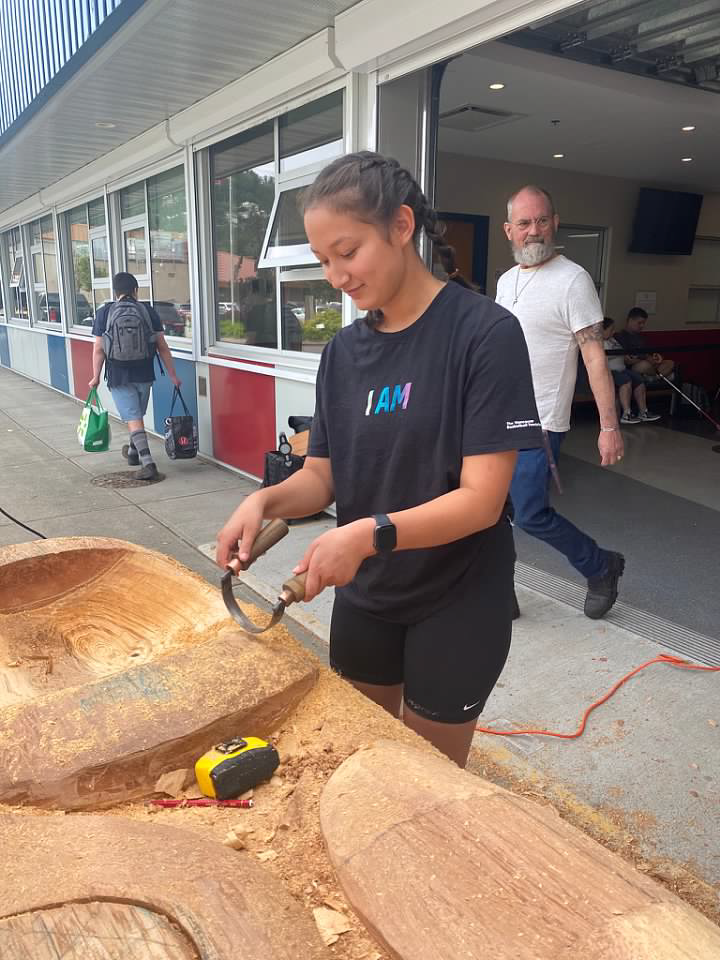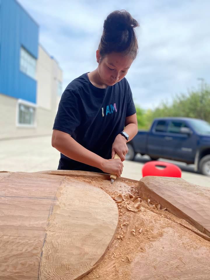 Raphael Silver and Kelsey Ned engaged the public and the schools with the Education Welcome Figure: Semá:th First Nation Longhouse, Havard Deeper Learning Dozen, Wa;cipi C'ante Was'te Yuhapi Powwow, Bakerview Centre for Learning, Yale Secondary, Abby Senior Secondary, and Mouat Secondary. In doing so, they engaged with, inspired, connected to, and shared knowledge and carving experiences with many youths and adults.